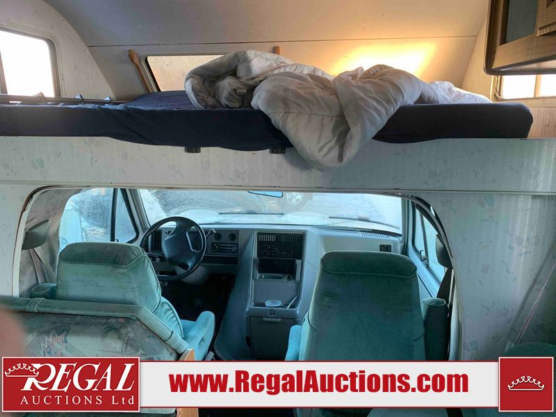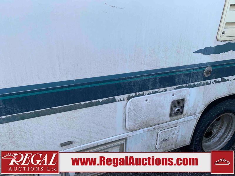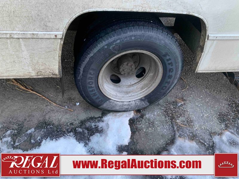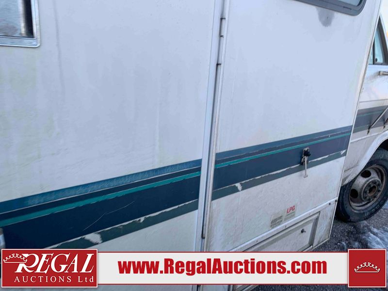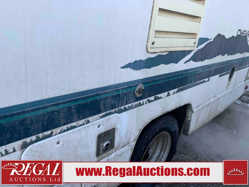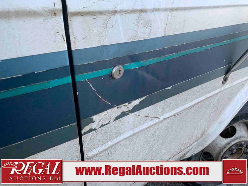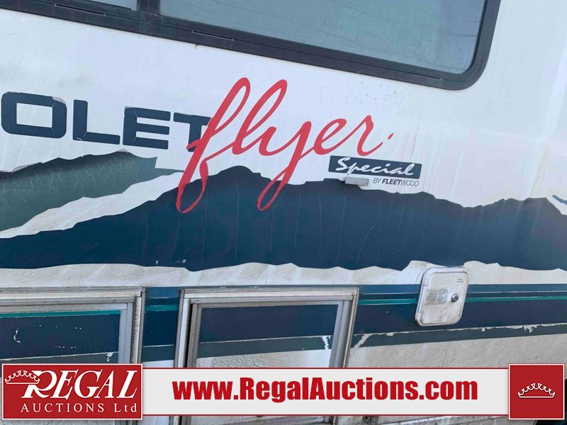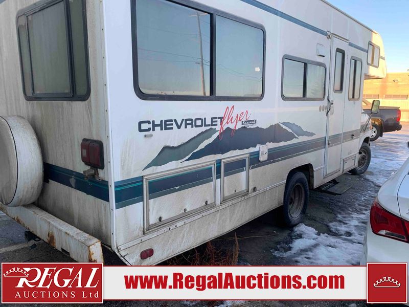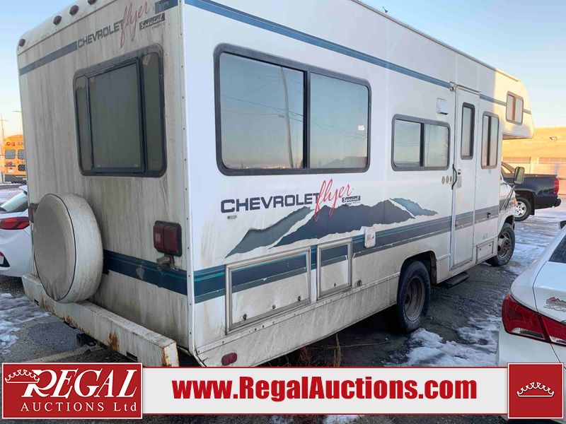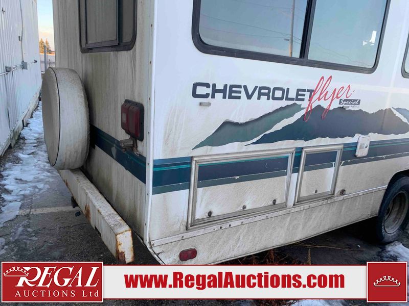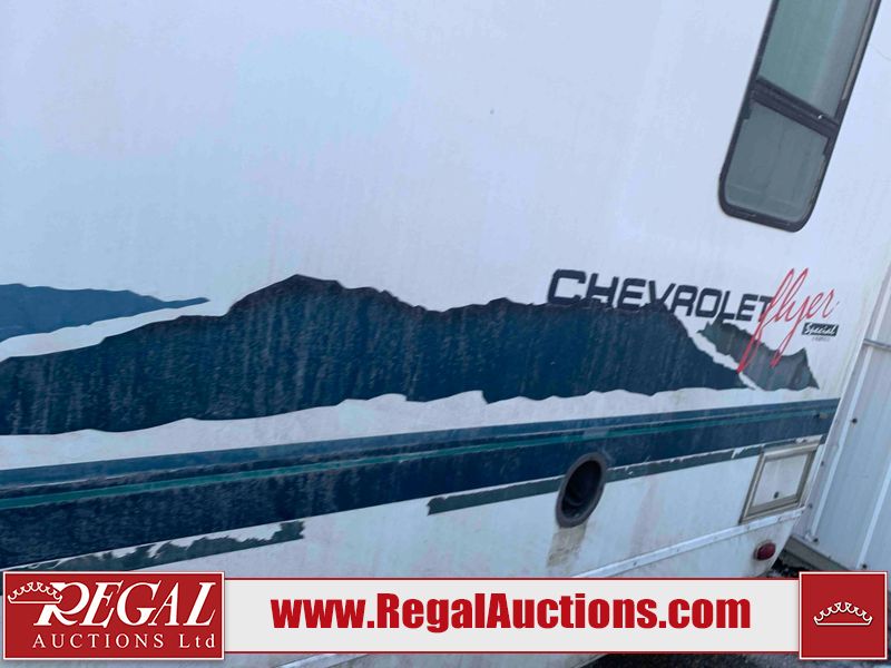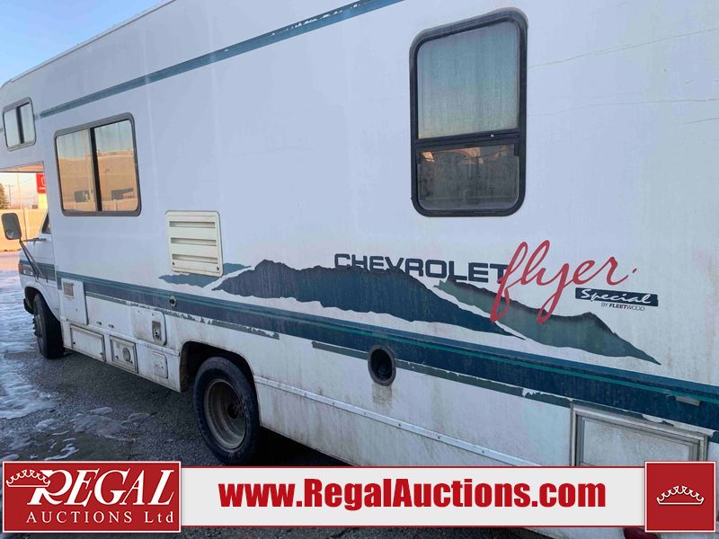 This Class C RV is a 1995 Chevrolet C30 Chassis with a model Fleetwood Flyer special coach. The odometre reads 251,003 kilometres. The chassis vin has been removed, and cannot be confirmed. This unit is equipped with a single door entry, and roof air. The interior is dirty. The coach fabrics are stained. The mattress is stained. The rear wall is cracked and peeling. One of the kitchen cabinet doors has been removed. The cab wall trim is peeling. Some of the cab walls are separating. Exterior walls are made of hard wall fiberglass. All are showing scratches and stuff. Some decals are peeling. Both The left, and right wall are showing water delamination. The rear bumper has peeling paint, surface rust, and is misaligned. The right wall is gouged. The right cab door is dented. The roof has peeling paint. This unit starts and runs with a booth. This unit is powered by a 5.7 Litre eight cylinder GM engine and an automatic transmission. The serpentine belt is noisy. The tires are mounted to steel rims and appear to be good enough for you. This unit is equipped with a refrigerator, three burner stove top, and a oven. The layout consists of a dinette in the front, catching it in the center, and a bed/bathroom in the rear.