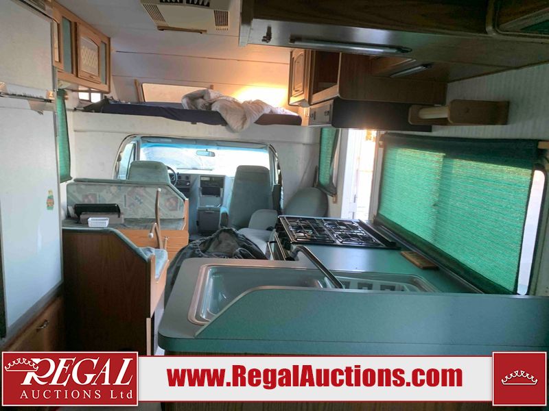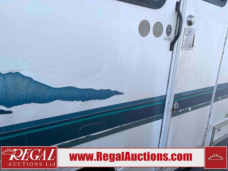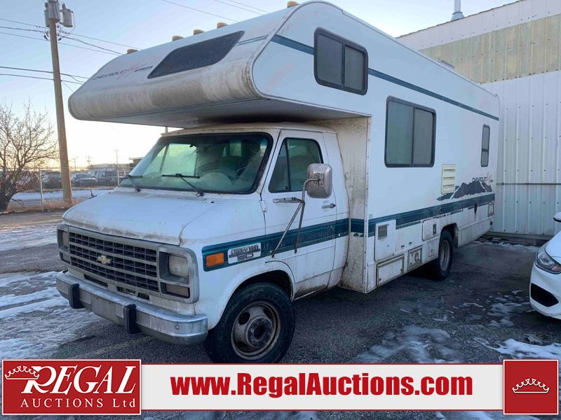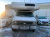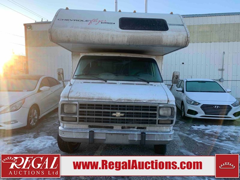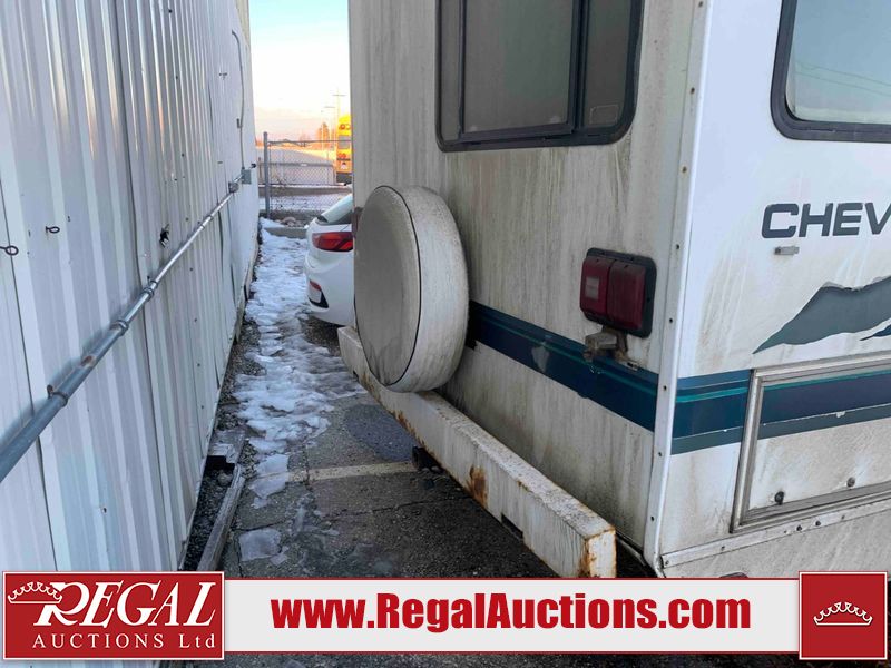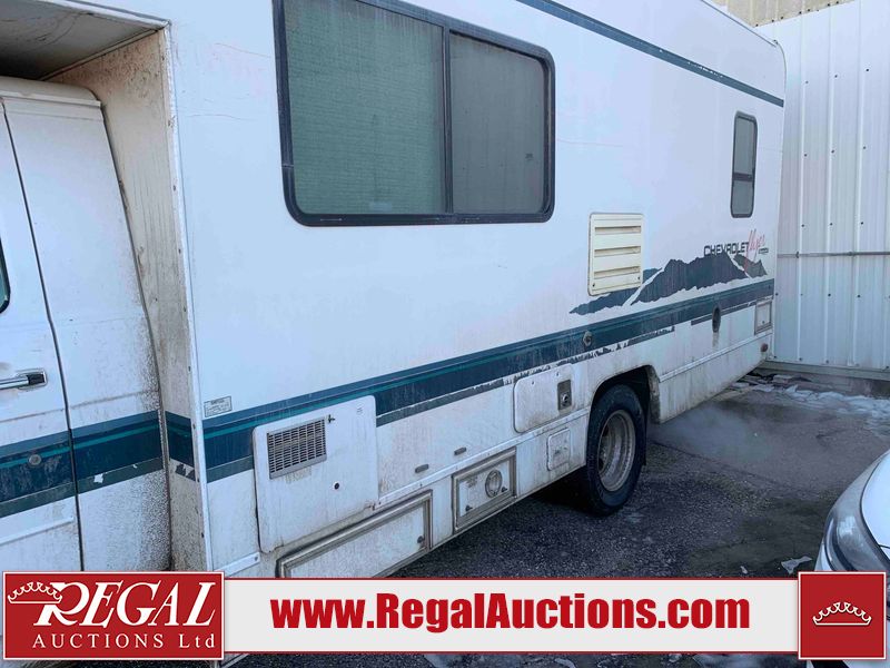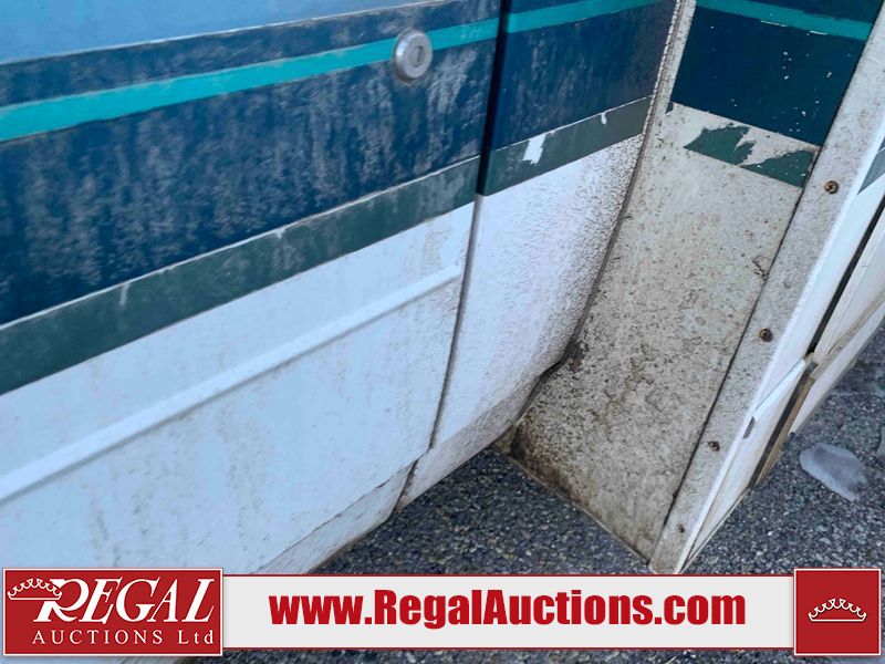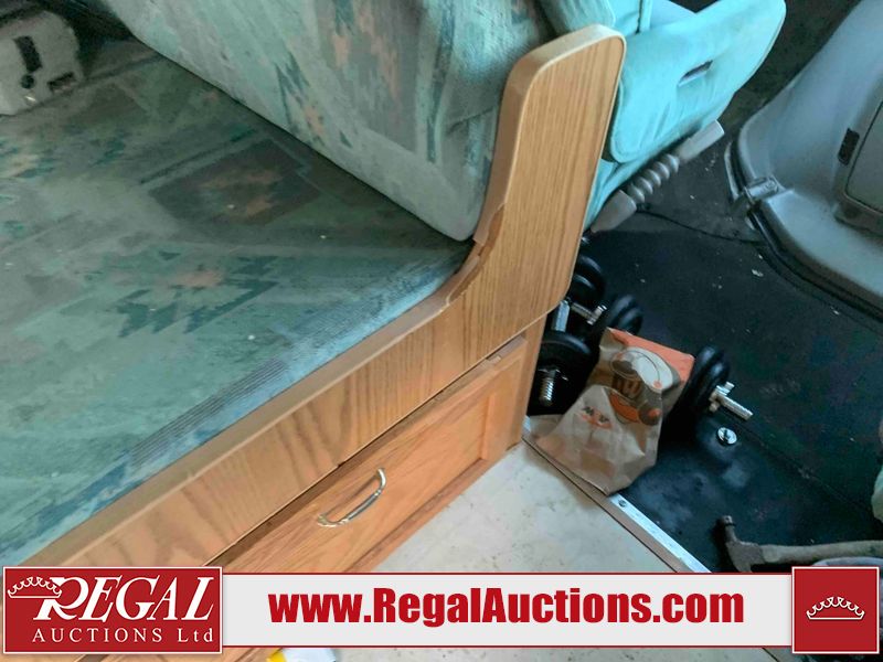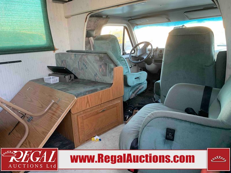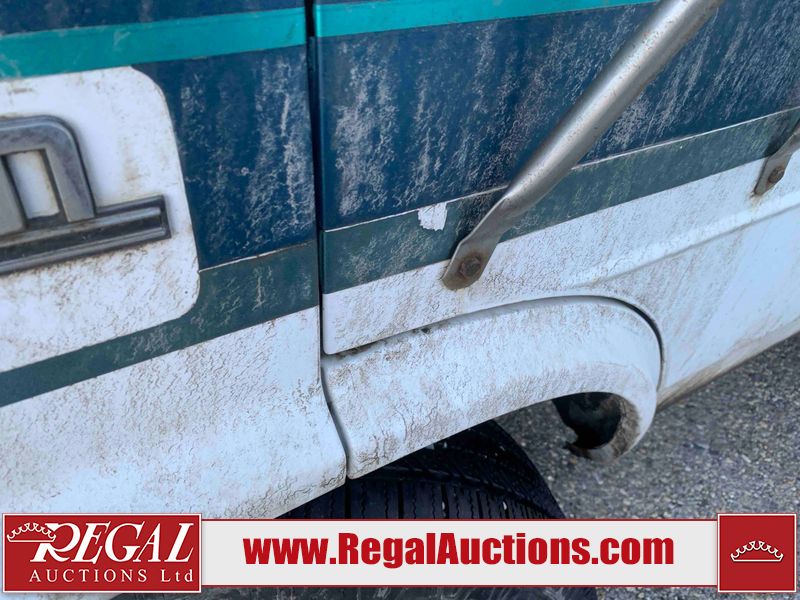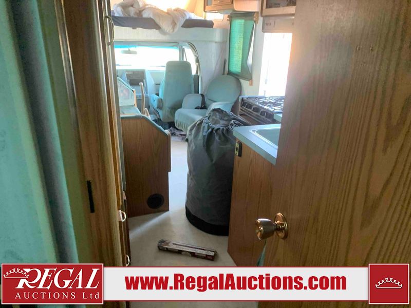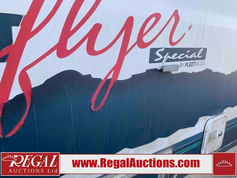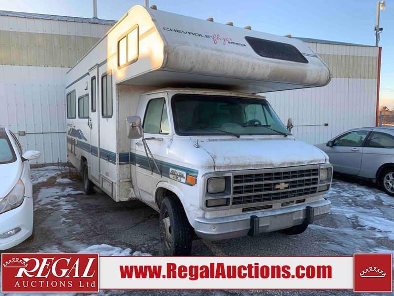 This Class C RV is a 1995 Chevrolet C30 Chassis with a model Fleetwood Flyer special coach. The odometre reads 251,003 kilometres. The chassis vin has been removed, and cannot be confirmed. This unit is equipped with a single door entry, and roof air. The interior is dirty. The coach fabrics are stained. The mattress is stained. The rear wall is cracked and peeling. One of the kitchen cabinet doors has been removed. The cab wall trim is peeling. Some of the cab walls are separating. Exterior walls are made of hard wall fiberglass. All are showing scratches and stuff. Some decals are peeling. Both The left, and right wall are showing water delamination. The rear bumper has peeling paint, surface rust, and is misaligned. The right wall is gouged. The right cab door is dented. The roof has peeling paint. This unit starts and runs with a booth. This unit is powered by a 5.7 Litre eight cylinder GM engine and an automatic transmission. The serpentine belt is noisy. The tires are mounted to steel rims and appear to be good enough for you. This unit is equipped with a refrigerator, three burner stove top, and a oven. The layout consists of a dinette in the front, catching it in the center, and a bed/bathroom in the rear.
