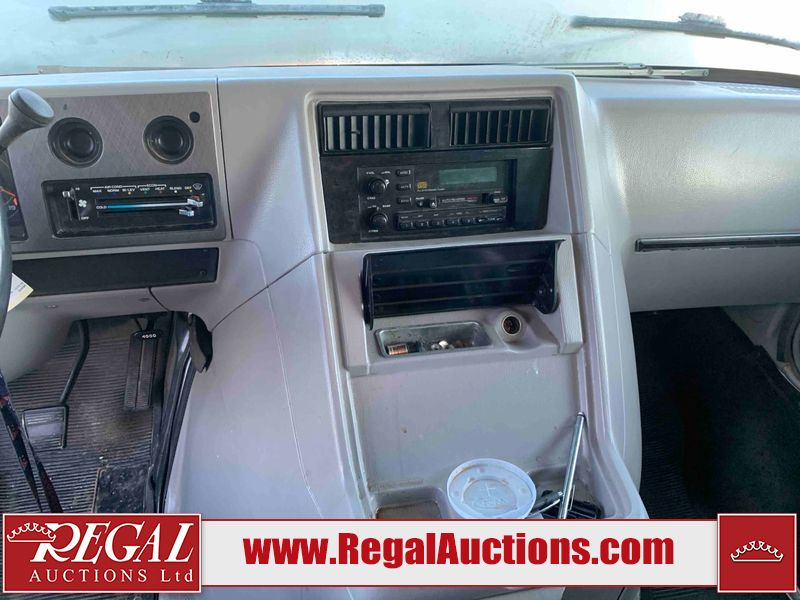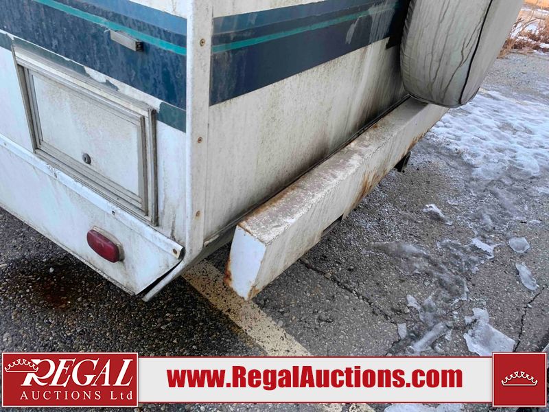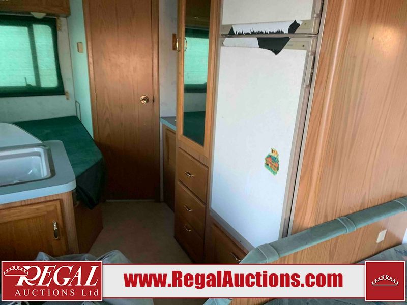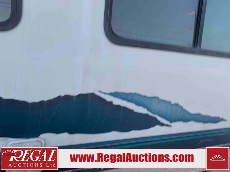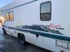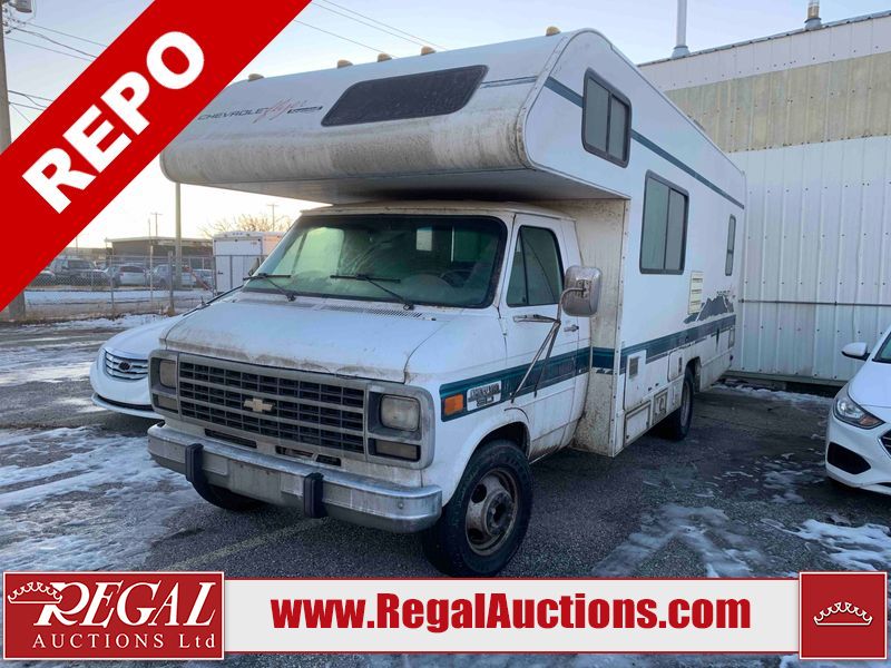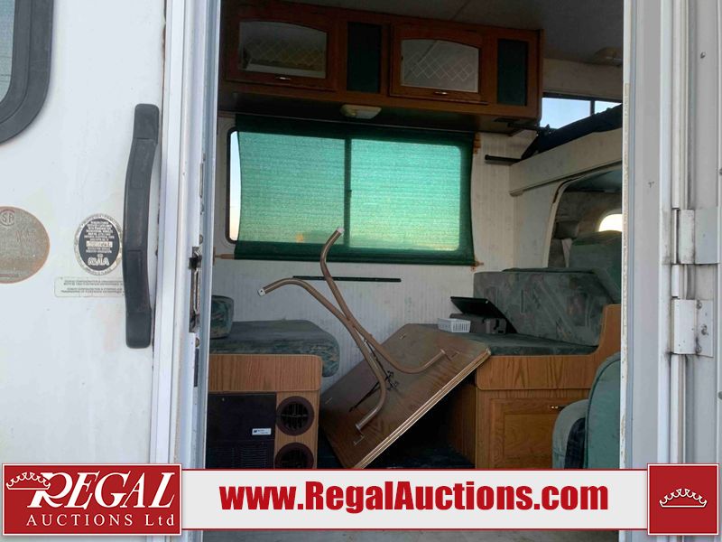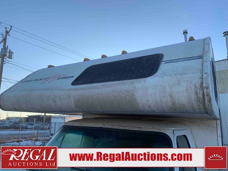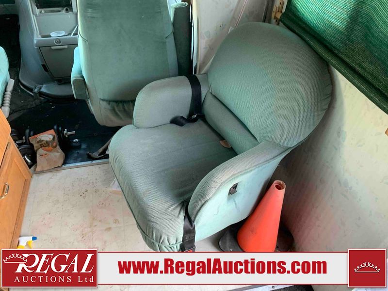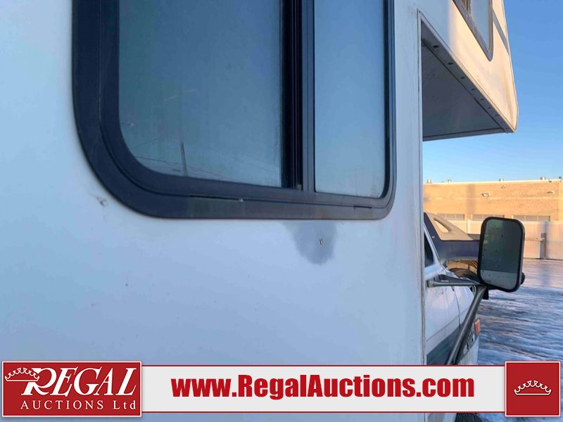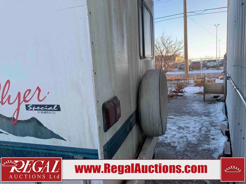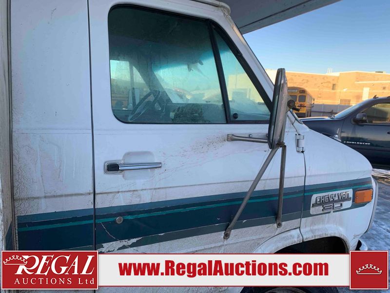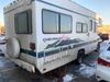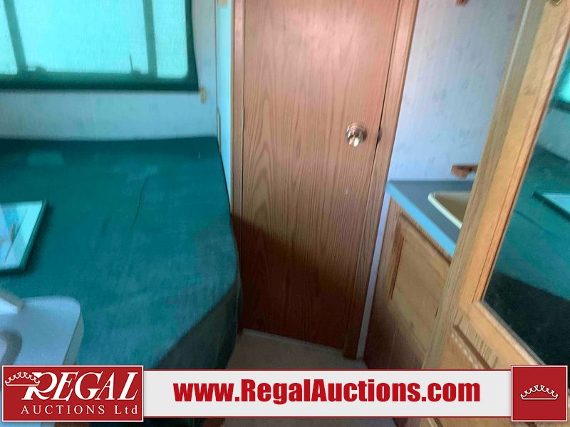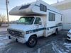 This Class C RV is a 1995 Chevrolet C30 Chassis with a model Fleetwood Flyer special coach. The odometre reads 251,003 kilometres. The chassis vin has been removed, and cannot be confirmed. This unit is equipped with a single door entry, and roof air. The interior is dirty. The coach fabrics are stained. The mattress is stained. The rear wall is cracked and peeling. One of the kitchen cabinet doors has been removed. The cab wall trim is peeling. Some of the cab walls are separating. Exterior walls are made of hard wall fiberglass. All are showing scratches and stuff. Some decals are peeling. Both The left, and right wall are showing water delamination. The rear bumper has peeling paint, surface rust, and is misaligned. The right wall is gouged. The right cab door is dented. The roof has peeling paint. This unit starts and runs with a booth. This unit is powered by a 5.7 Litre eight cylinder GM engine and an automatic transmission. The serpentine belt is noisy. The tires are mounted to steel rims and appear to be good enough for you. This unit is equipped with a refrigerator, three burner stove top, and a oven. The layout consists of a dinette in the front, catching it in the center, and a bed/bathroom in the rear.
