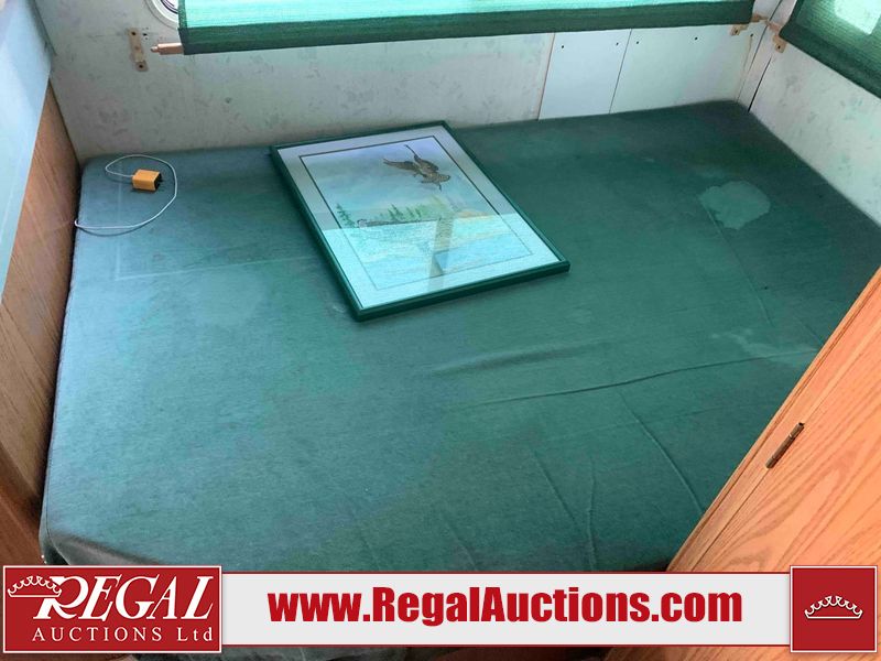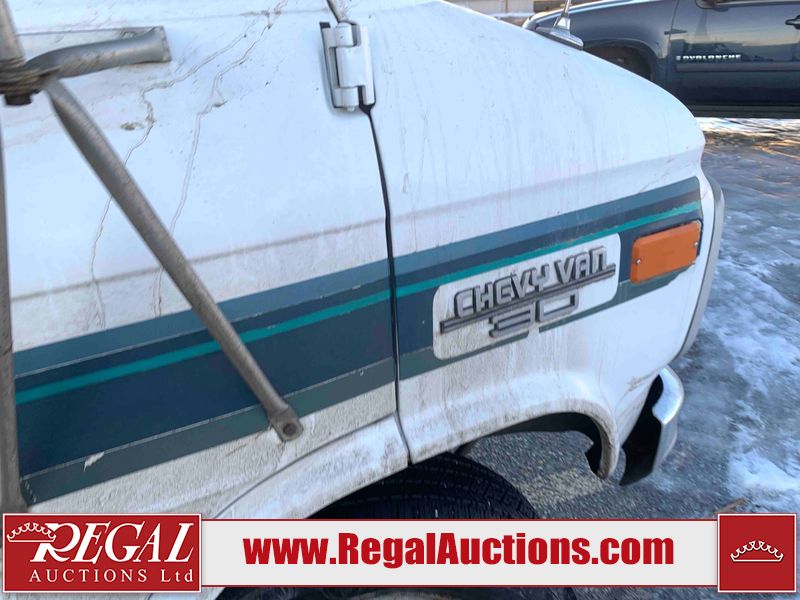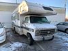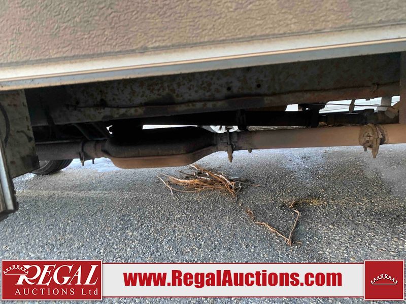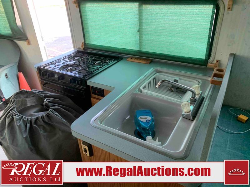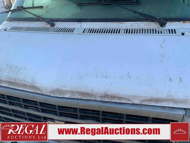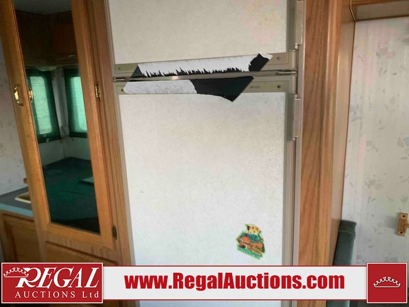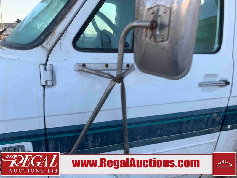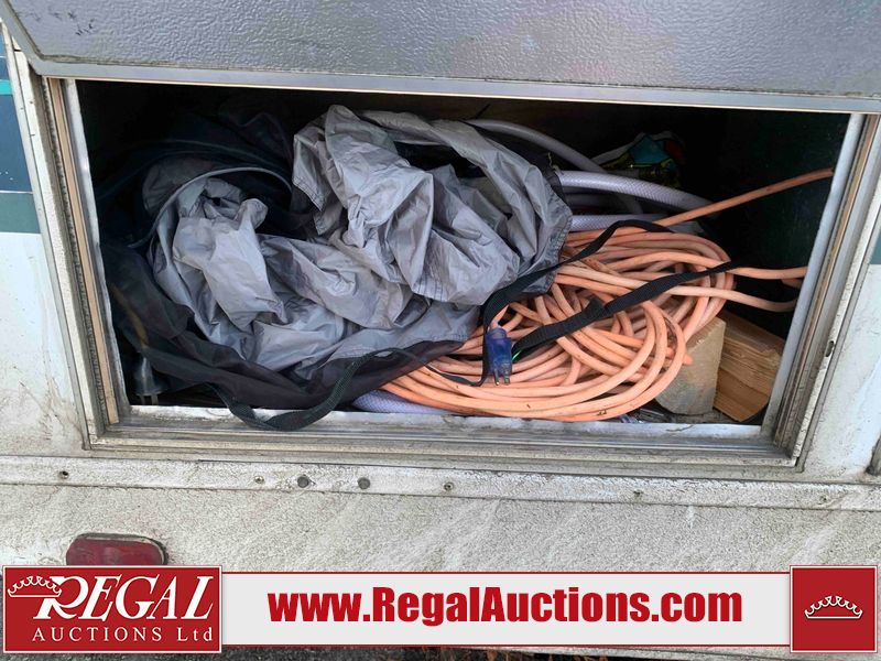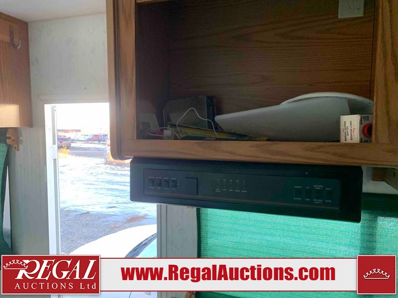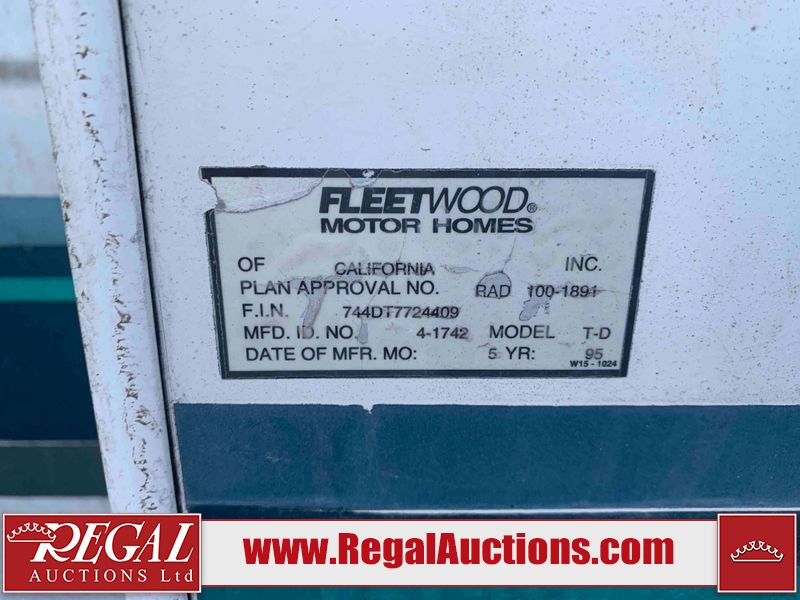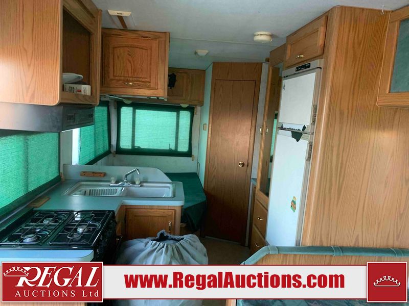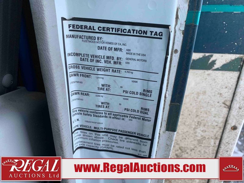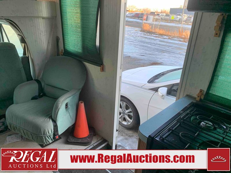 This Class C RV is a 1995 Chevrolet C30 Chassis with a model Fleetwood Flyer special coach. The odometre reads 251,003 kilometres. The chassis vin has been removed, and cannot be confirmed. This unit is equipped with a single door entry, and roof air. The interior is dirty. The coach fabrics are stained. The mattress is stained. The rear wall is cracked and peeling. One of the kitchen cabinet doors has been removed. The cab wall trim is peeling. Some of the cab walls are separating. Exterior walls are made of hard wall fiberglass. All are showing scratches and stuff. Some decals are peeling. Both The left, and right wall are showing water delamination. The rear bumper has peeling paint, surface rust, and is misaligned. The right wall is gouged. The right cab door is dented. The roof has peeling paint. This unit starts and runs with a booth. This unit is powered by a 5.7 Litre eight cylinder GM engine and an automatic transmission. The serpentine belt is noisy. The tires are mounted to steel rims and appear to be good enough for you. This unit is equipped with a refrigerator, three burner stove top, and a oven. The layout consists of a dinette in the front, catching it in the center, and a bed/bathroom in the rear.