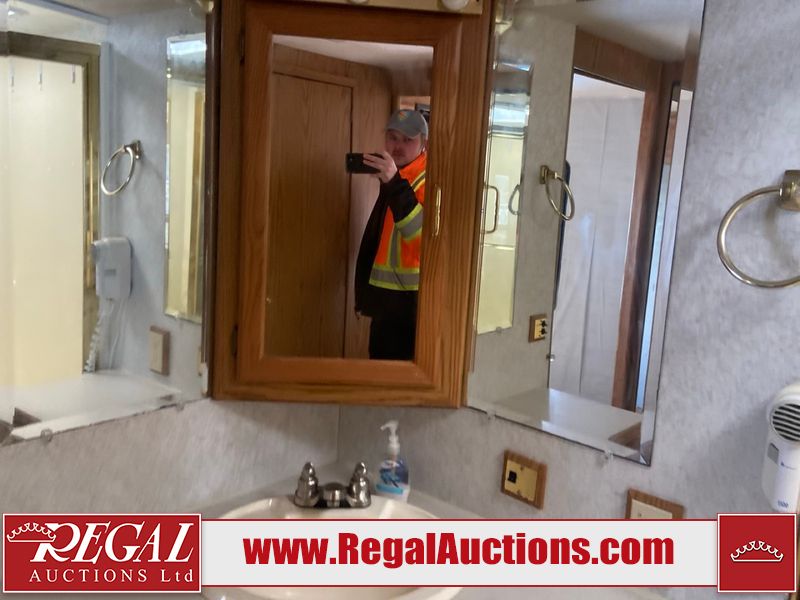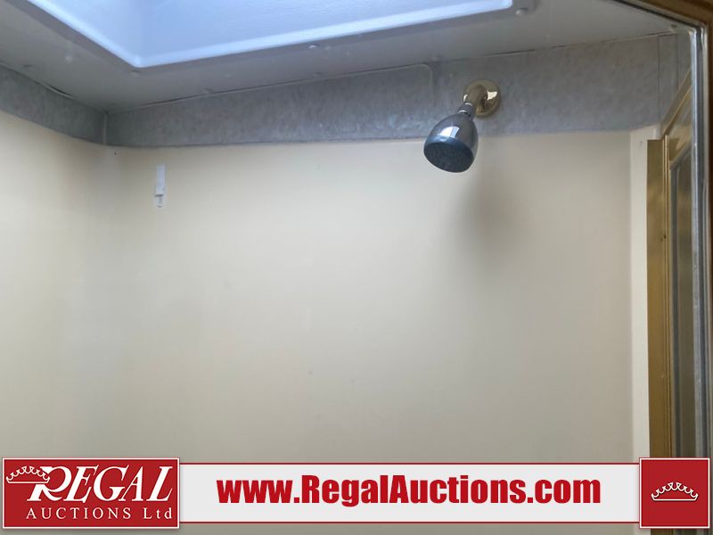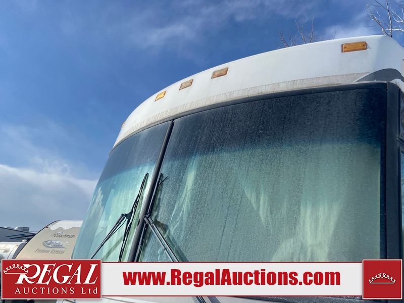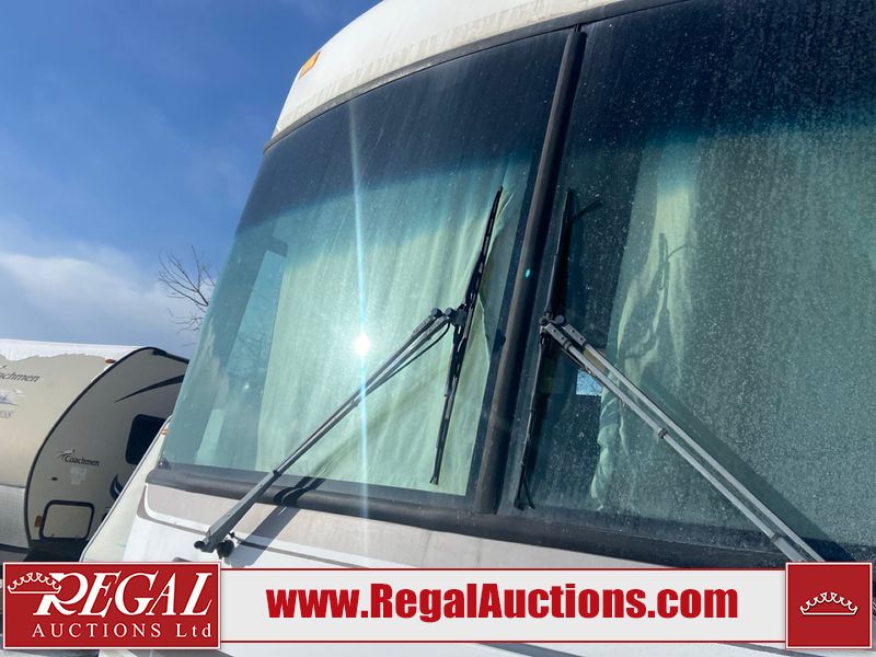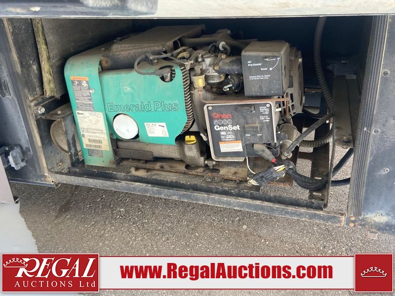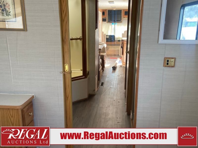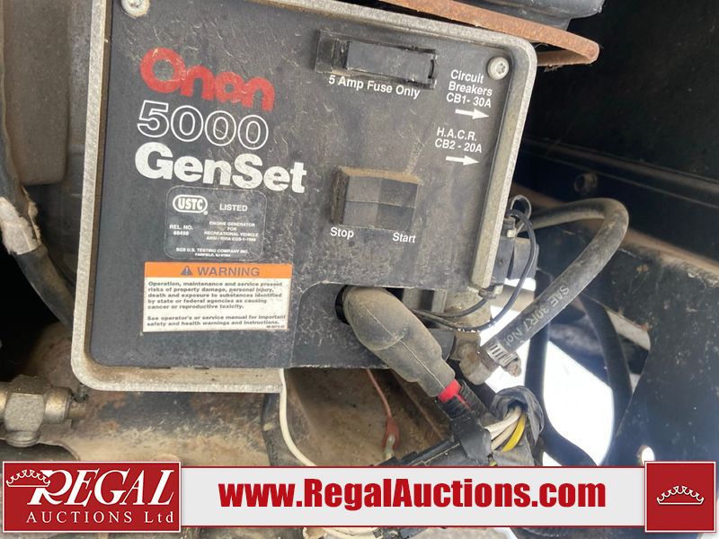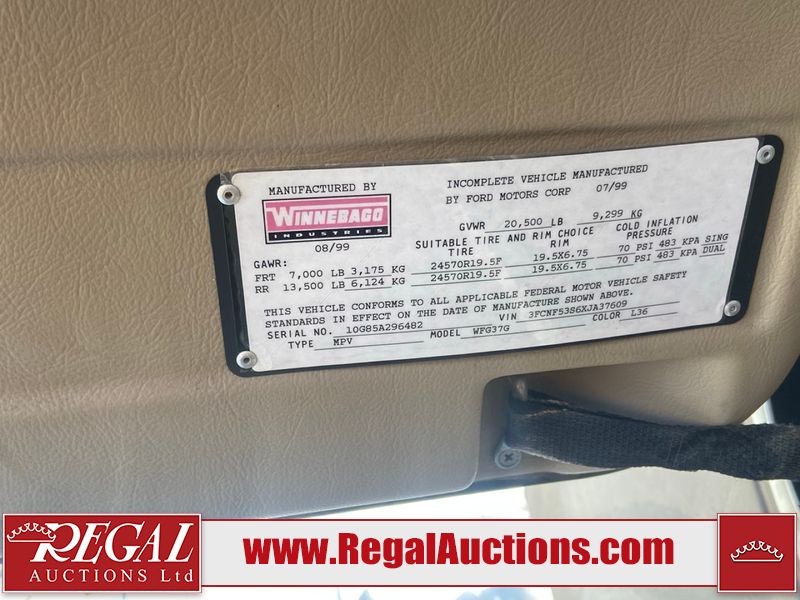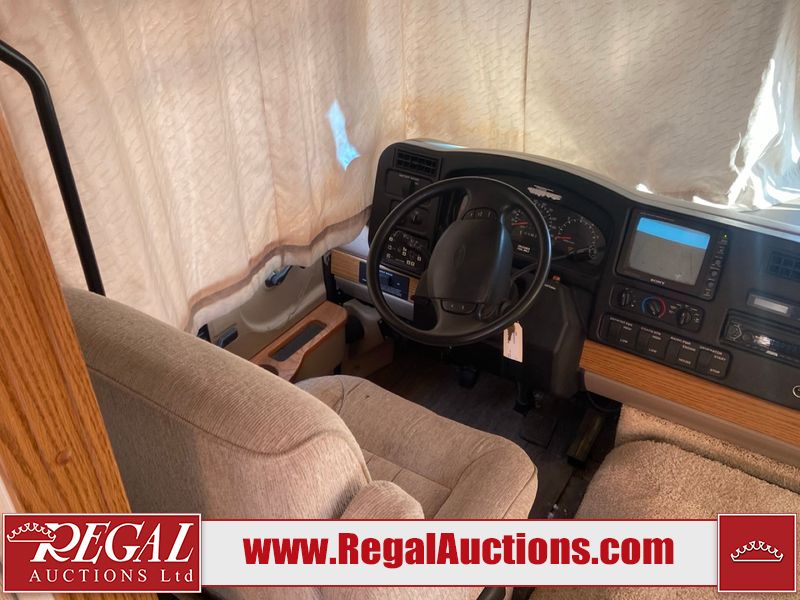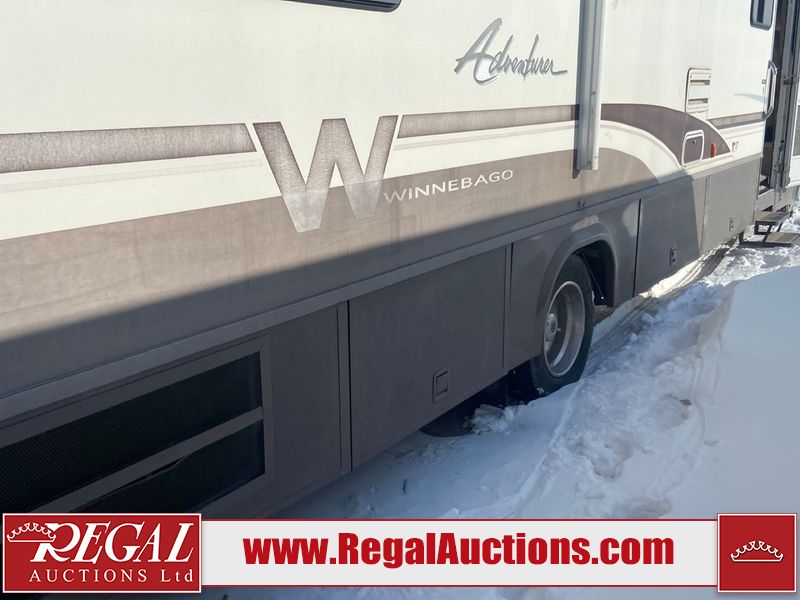 This unit is a 1999 Winnebago adventure model coach on a Ford chassis. The odometer reads 51,106 miles. This unit has two entry doors, roof air and a single slide out, accommodating the living area/dinette. The interior is dirty. The flooring has been replaced. The wooden trim has scratches and scuffs. The dashboard is peeling. The bedroom wall is peeling. The exterior walls are made of Hard wall fiberglass. The front end has chips. The top marker lights are cracked. Most decals are appealing. The side walls have scratches and scrapes. The left side wall has water delamination. The left rear corner has deep scrapes and cracks. All tail lights are cracked/broken. The right side window seal is broken. The engine turns over but will not start. Both batteries are missing. The driveshaft has been disconnected, the condition of the transmission and rear end are unknown. This unit is powered by a 6.8 L 10 cylinder engine and an automatic transmission. The tires appear to be in good enough condition for use. This unit is equipped with a Cummins ONAN 5000 generator. The layout consists of a living area/kitchen at the front, a washroom at the center and a master bedroom at the rear. This unit is equipped with a three burner stove, top, oven, microwave, refrigerator, and a stereo system. It also has a front mounted television.