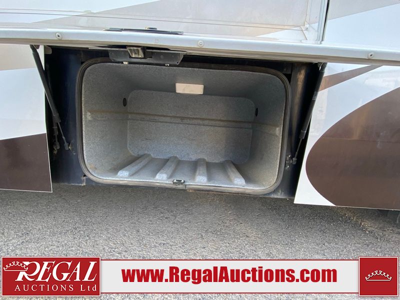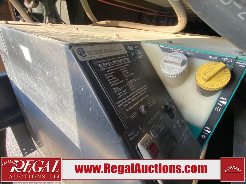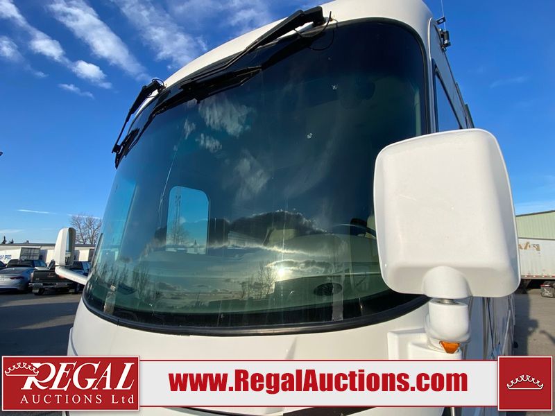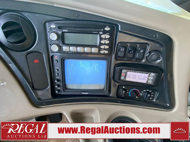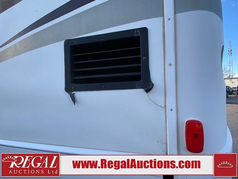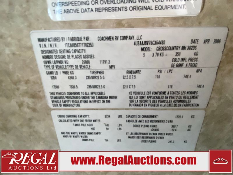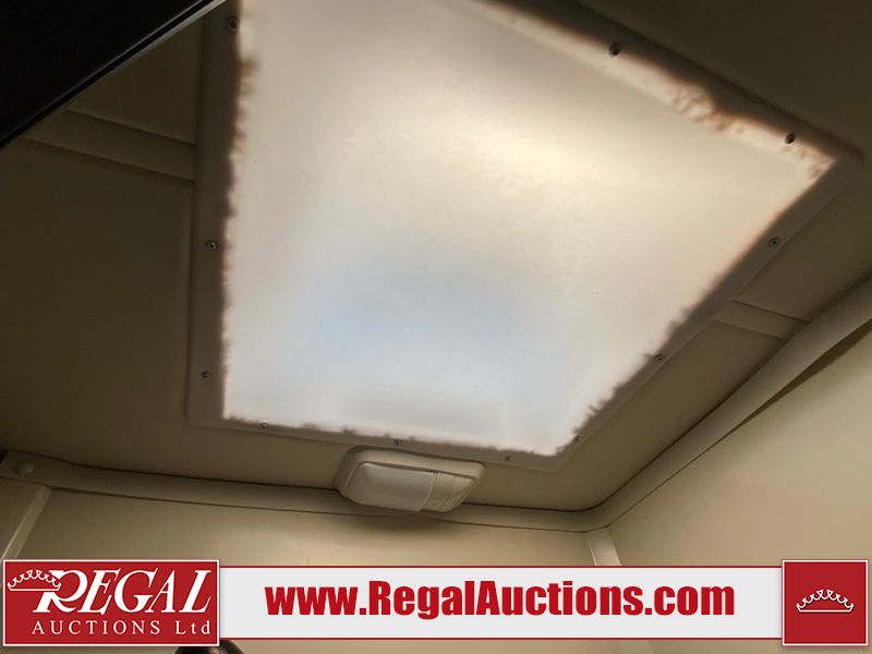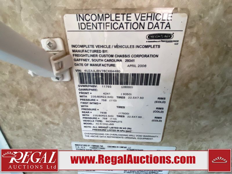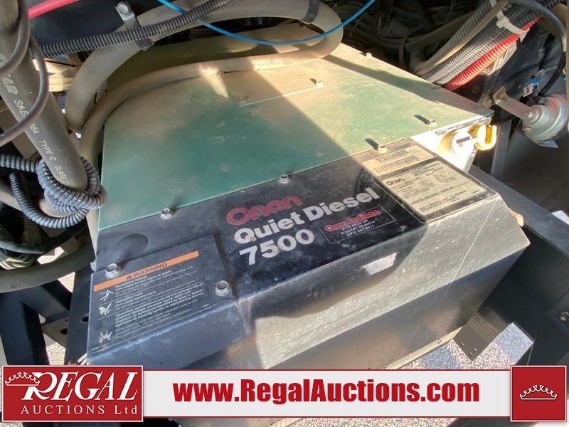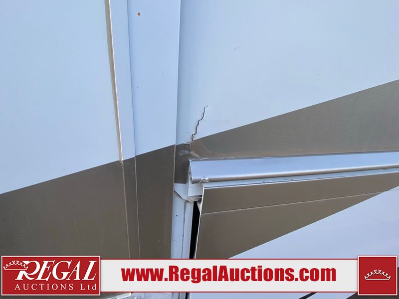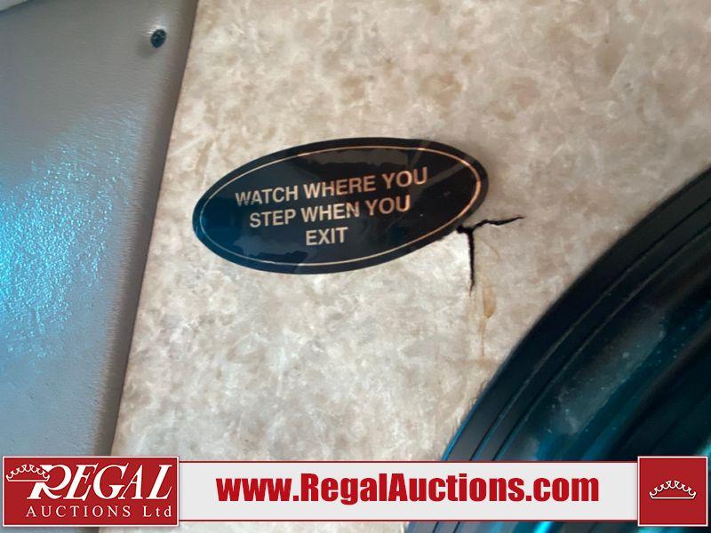 This motorhome is a 2006 coachman Cross country 382DS model built on a freightliner XC – S chassis. The odometer shows 45,640 km. It has a single door entry, roof air, and two slide outs, accommodating the living area. The interior is dirty. The floor is stained. The driver seat armrest is torn. The windshield is cracked. The dashboard is cracked. The roof light is damaged, the floor is cracked and lifting some walls are showing scratches and scuffs. All sky window plastic trims is cracked. The cabin lights has been replaced, and the factory light is missing. The exterior is made out of hard wall fiberglass. All panels are showing chips and scratches. Some decals are peeling and cracking. The left wall has water delamination and is cracked. The rear wall is cracked. The ladder is broken. The slides outs cannot be tested. This unit’s entire interior cab power has been disconnected. It’s condition is unknown. This unit starts and runs without a boost. This unit is powered by a 5.9 L six cylinder turbo, diesel engine and an automatic transmission. This unit is equipped with a Onan quiet diesel 7500 model generator. The engine hours cannot be confirmed. The tires are mounted on steel rims, the rear tires need to be replaced. This this motorhome is equipped with a stereo system, television, DVD player, electric fan, microwave, three burner stove, and a refrigerator. The layout consist of kitchenette/dinette in the front, and a bathroom/master bedroom in the rear.