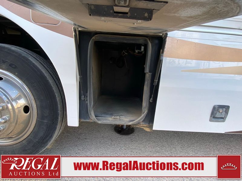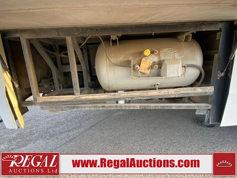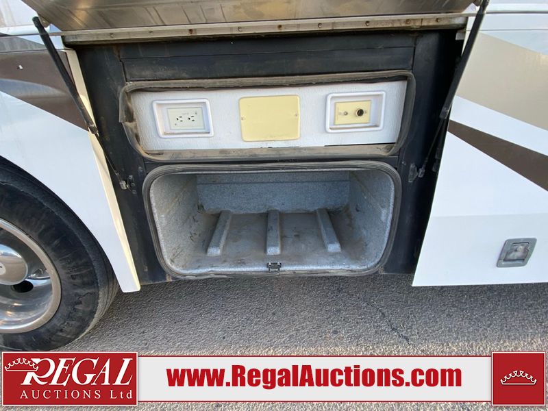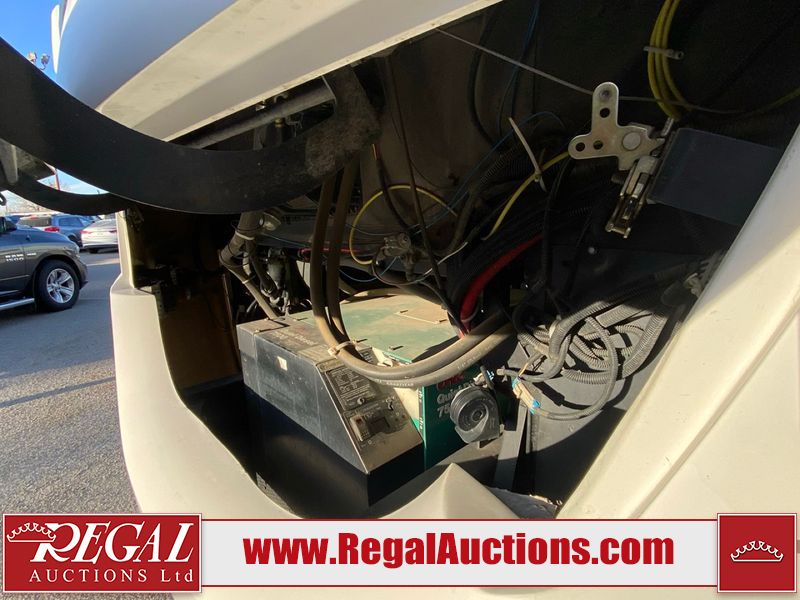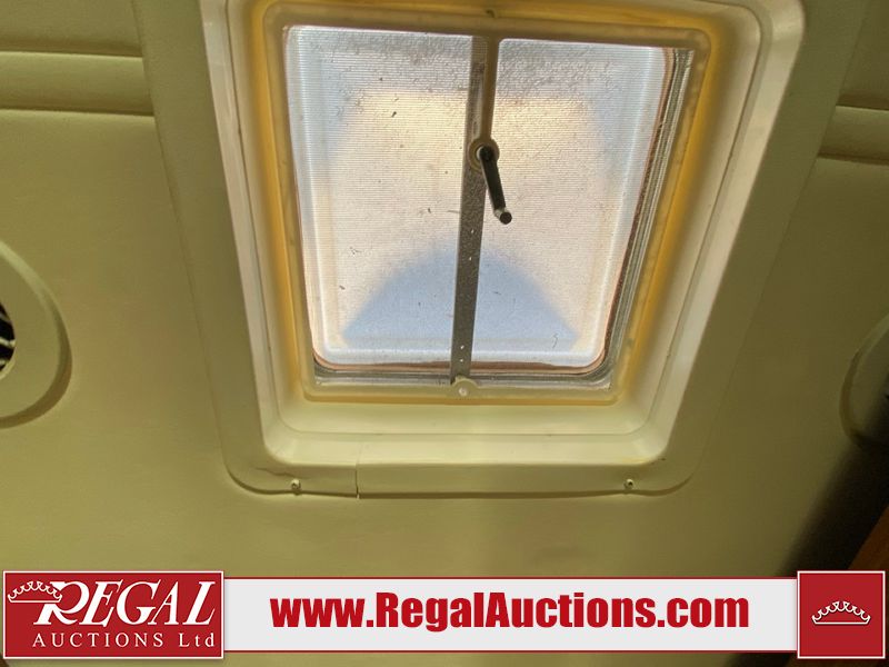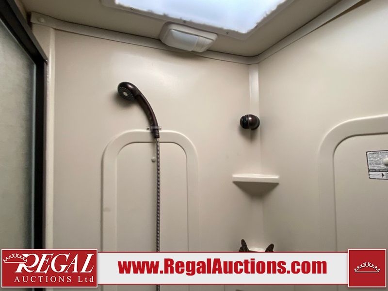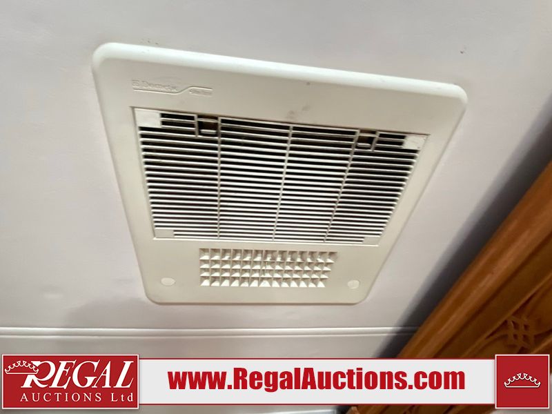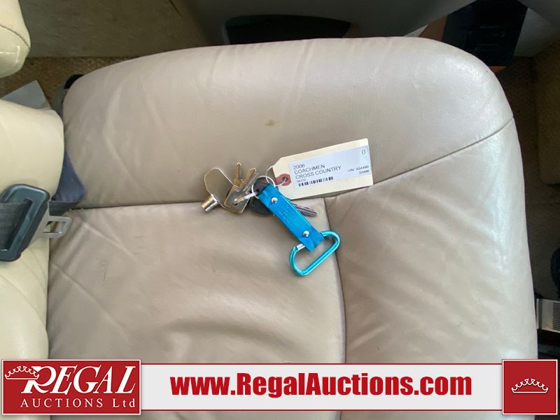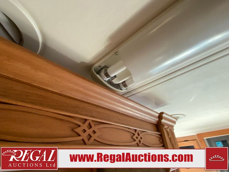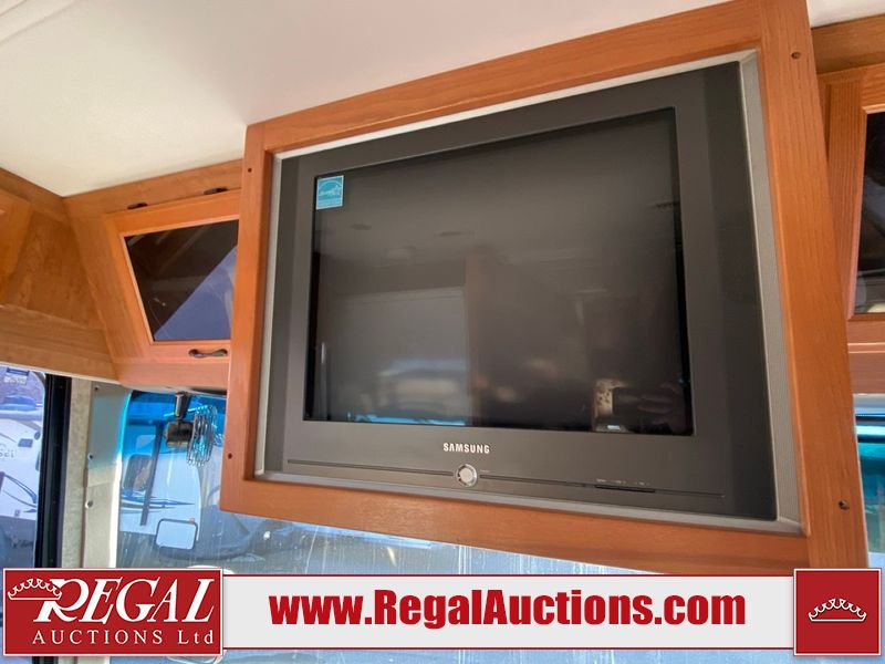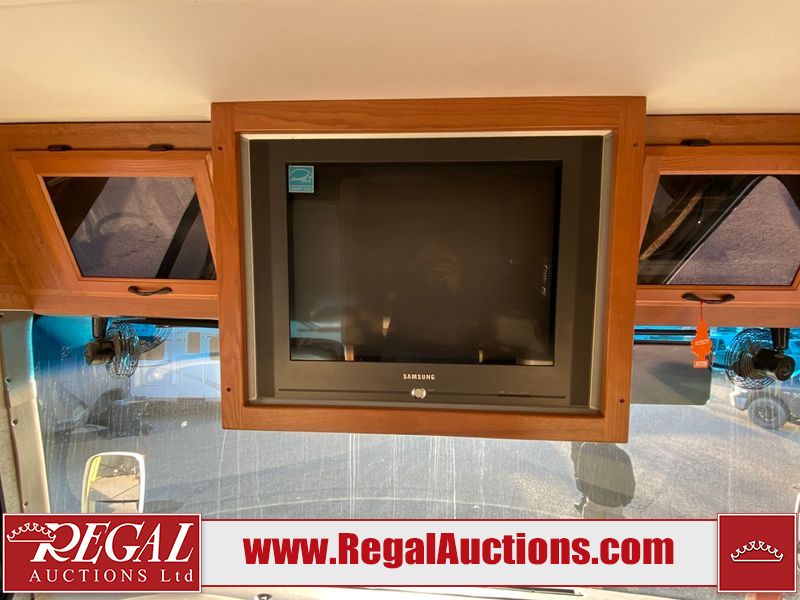 This motorhome is a 2006 coachman Cross country 382DS model built on a freightliner XC – S chassis. The odometer shows 45,640 km. It has a single door entry, roof air, and two slide outs, accommodating the living area. The interior is dirty. The floor is stained. The driver seat armrest is torn. The windshield is cracked. The dashboard is cracked. The roof light is damaged, the floor is cracked and lifting some walls are showing scratches and scuffs. All sky window plastic trims is cracked. The cabin lights has been replaced, and the factory light is missing. The exterior is made out of hard wall fiberglass. All panels are showing chips and scratches. Some decals are peeling and cracking. The left wall has water delamination and is cracked. The rear wall is cracked. The ladder is broken. The slides outs cannot be tested. This unit’s entire interior cab power has been disconnected. It’s condition is unknown. This unit starts and runs without a boost. This unit is powered by a 5.9 L six cylinder turbo, diesel engine and an automatic transmission. This unit is equipped with a Onan quiet diesel 7500 model generator. The engine hours cannot be confirmed. The tires are mounted on steel rims, the rear tires need to be replaced. This this motorhome is equipped with a stereo system, television, DVD player, electric fan, microwave, three burner stove, and a refrigerator. The layout consist of kitchenette/dinette in the front, and a bathroom/master bedroom in the rear.