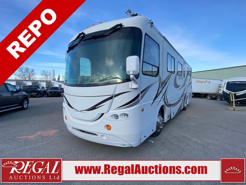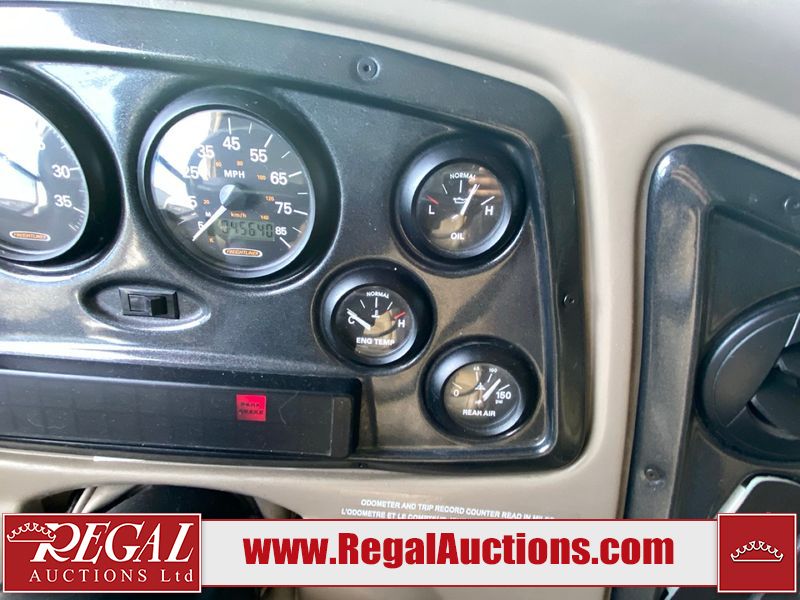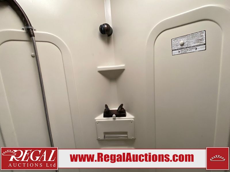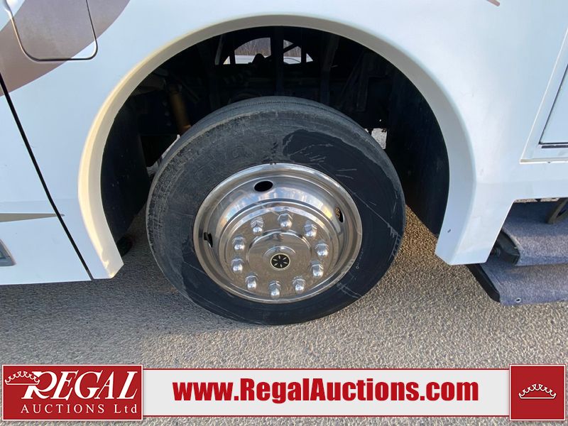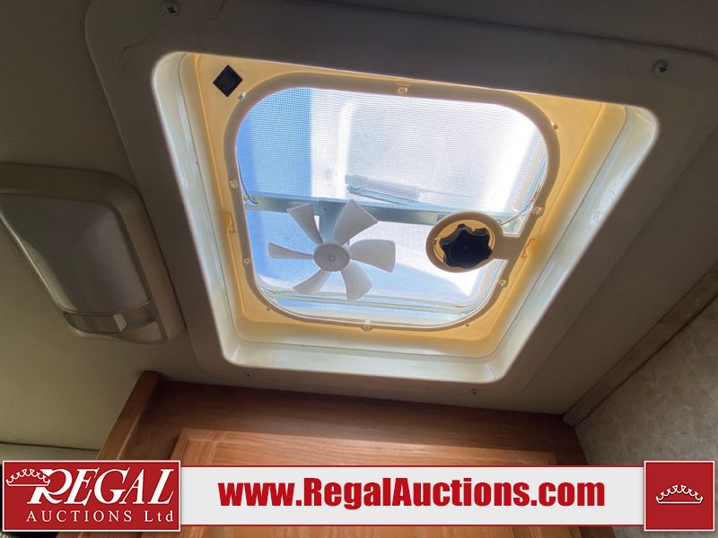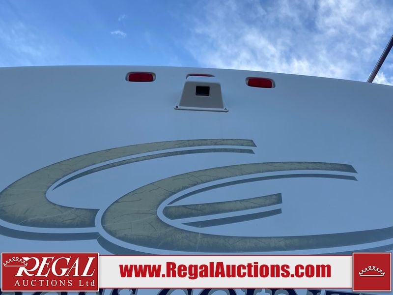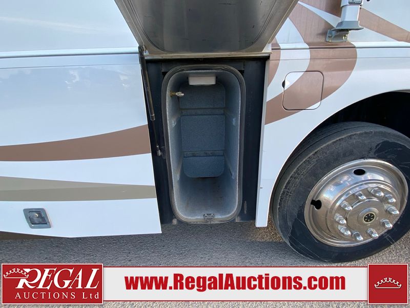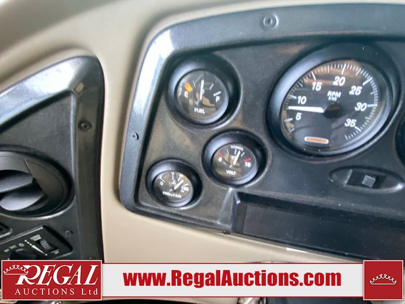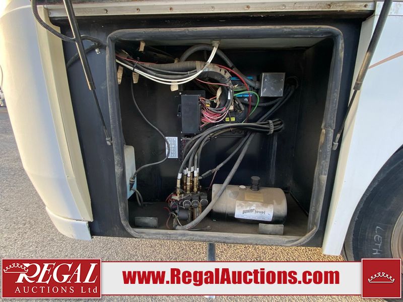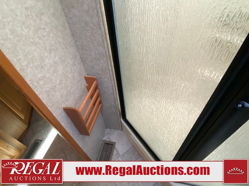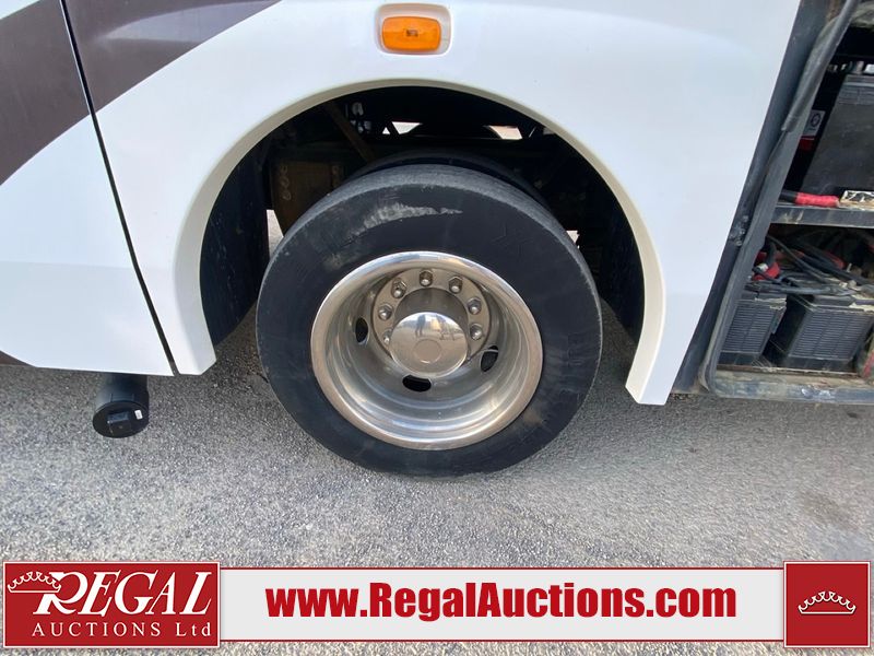This motorhome is a 2006 coachman Cross country 382DS model built on a freightliner XC – S chassis. The odometer shows 45,640 km. It has a single door entry, roof air, and two slide outs, accommodating the living area. The interior is dirty. The floor is stained. The driver seat armrest is torn. The windshield is cracked. The dashboard is cracked. The roof light is damaged, the floor is cracked and lifting some walls are showing scratches and scuffs. All sky window plastic trims is cracked. The cabin lights has been replaced, and the factory light is missing. The exterior is made out of hard wall fiberglass. All panels are showing chips and scratches. Some decals are peeling and cracking. The left wall has water delamination and is cracked. The rear wall is cracked. The ladder is broken. The slides outs cannot be tested. This unit’s entire interior cab power has been disconnected. It’s condition is unknown. This unit starts and runs without a boost. This unit is powered by a 5.9 L six cylinder turbo, diesel engine and an automatic transmission. This unit is equipped with a Onan quiet diesel 7500 model generator. The engine hours cannot be confirmed. The tires are mounted on steel rims, the rear tires need to be replaced. This this motorhome is equipped with a stereo system, television, DVD player, electric fan, microwave, three burner stove, and a refrigerator. The layout consist of kitchenette/dinette in the front, and a bathroom/master bedroom in the rear.