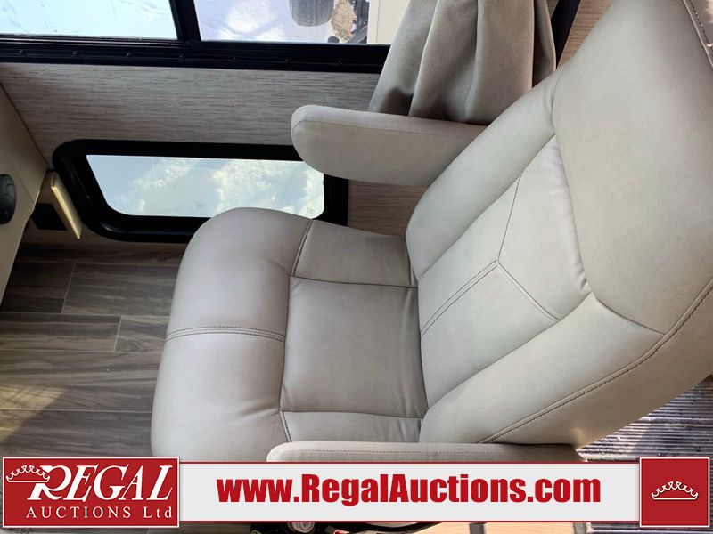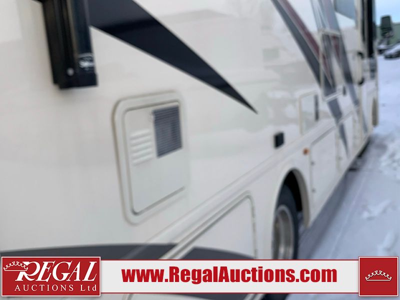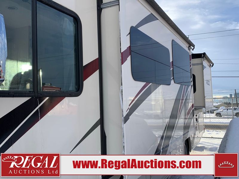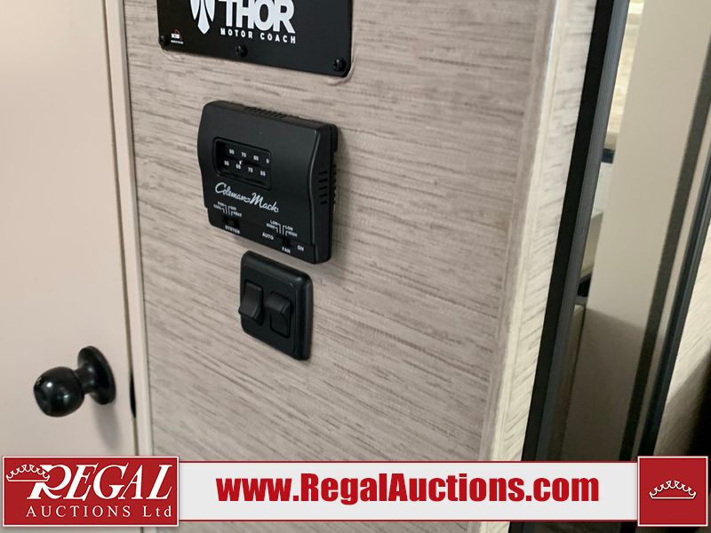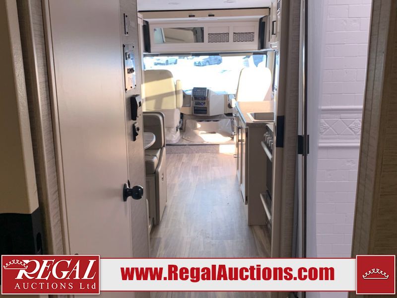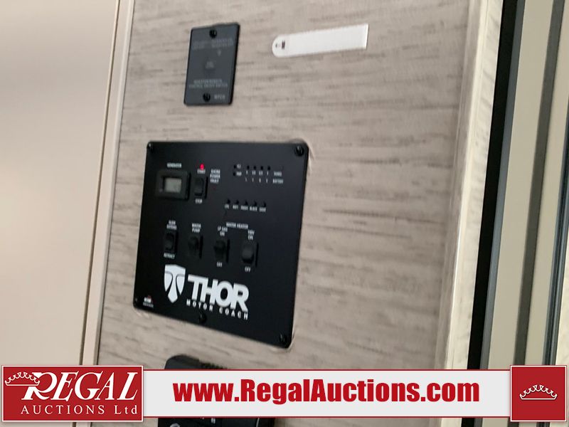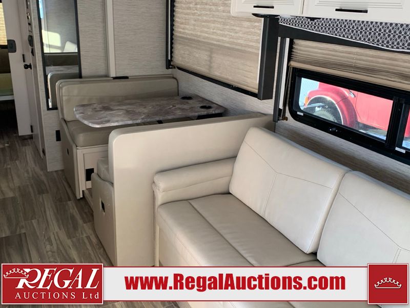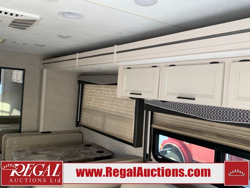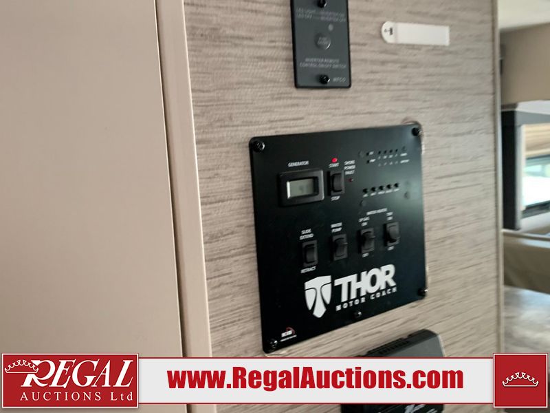 This Class C motorhome is a 2022 Thor Motorcoach Ace 30.3 coach on a Ford Chassis. The odometer reads 9760. This unit is cooked with a single entry door, roof air and two slide outs, accommodating, the master bedroom and the living area/kitchen. The exit door gas shock is not attached. The floor is dirty. The front end has chips. There are scratches on the right side wall. The engine starts and runs without a boost. This unit is powered by a 7.3l litre eight cylinder engine and an automatic transmission. Steel rims are mounted, the tires have plenty of tread remaining. The generator has 40 hours. This unit is equipped with an Onan QG 5500 generator. The layout consist a living area/kitchen at the front and a master bedroom at the rear. The unit is equipped with air conditioning, burner, stove, top, oven, microwave, refrigerator, stereo system, and two flatscreen televisions. It also has an exterior kitchen with a sink and mini refrigerator.