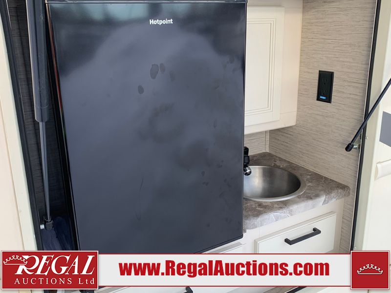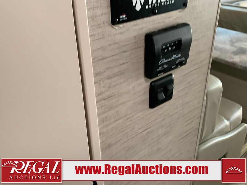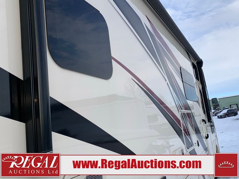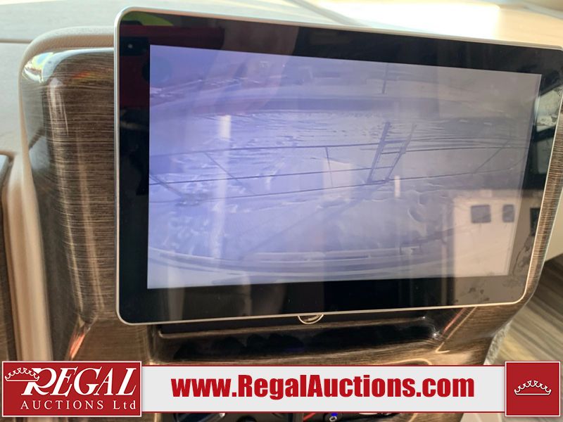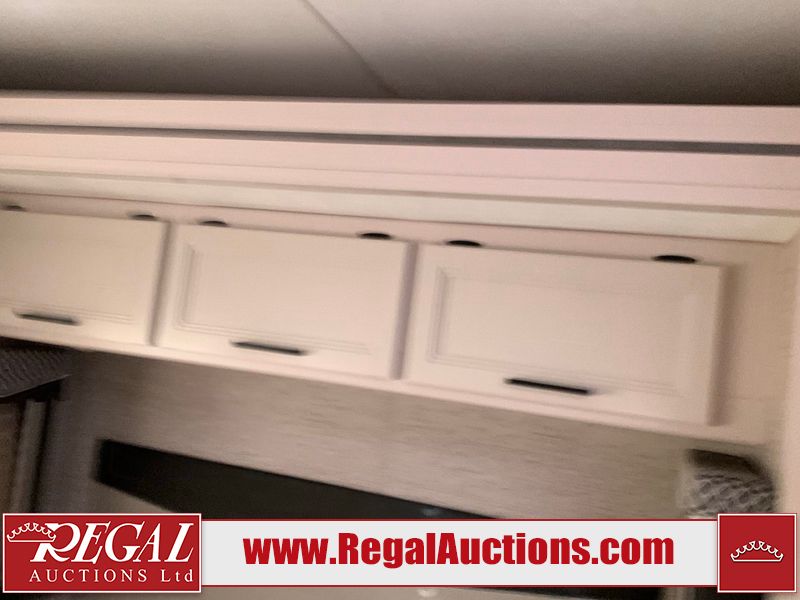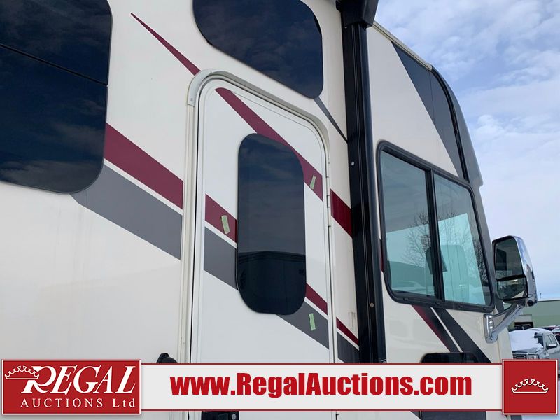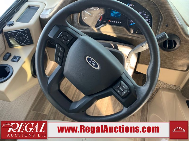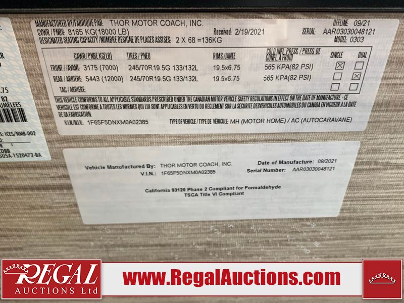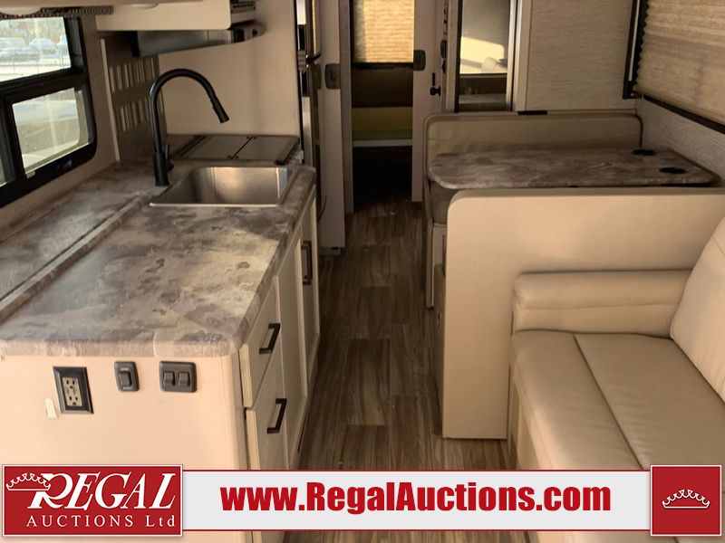 This Class C motorhome is a 2022 Thor Motorcoach Ace 30.3 coach on a Ford Chassis. The odometer reads 9760. This unit is cooked with a single entry door, roof air and two slide outs, accommodating, the master bedroom and the living area/kitchen. The exit door gas shock is not attached. The floor is dirty. The front end has chips. There are scratches on the right side wall. The engine starts and runs without a boost. This unit is powered by a 7.3l litre eight cylinder engine and an automatic transmission. Steel rims are mounted, the tires have plenty of tread remaining. The generator has 40 hours. This unit is equipped with an Onan QG 5500 generator. The layout consist a living area/kitchen at the front and a master bedroom at the rear. The unit is equipped with air conditioning, burner, stove, top, oven, microwave, refrigerator, stereo system, and two flatscreen televisions. It also has an exterior kitchen with a sink and mini refrigerator.
