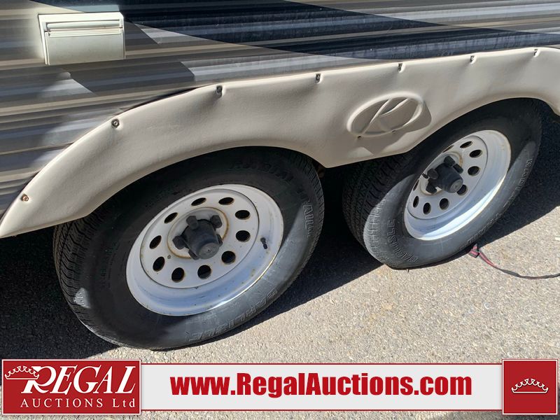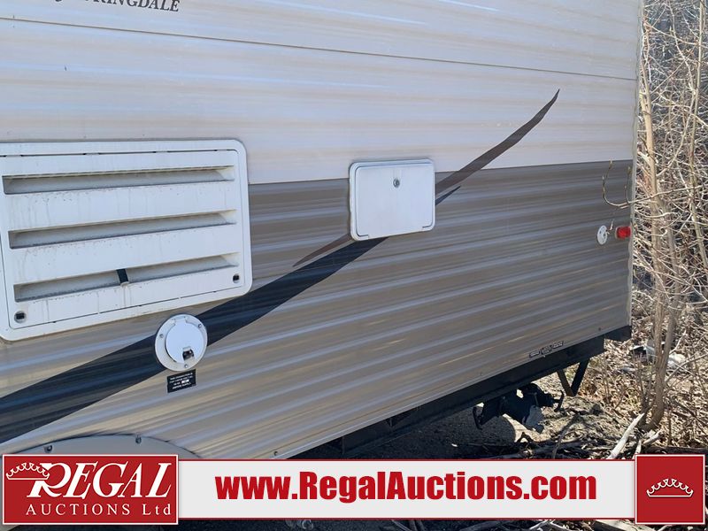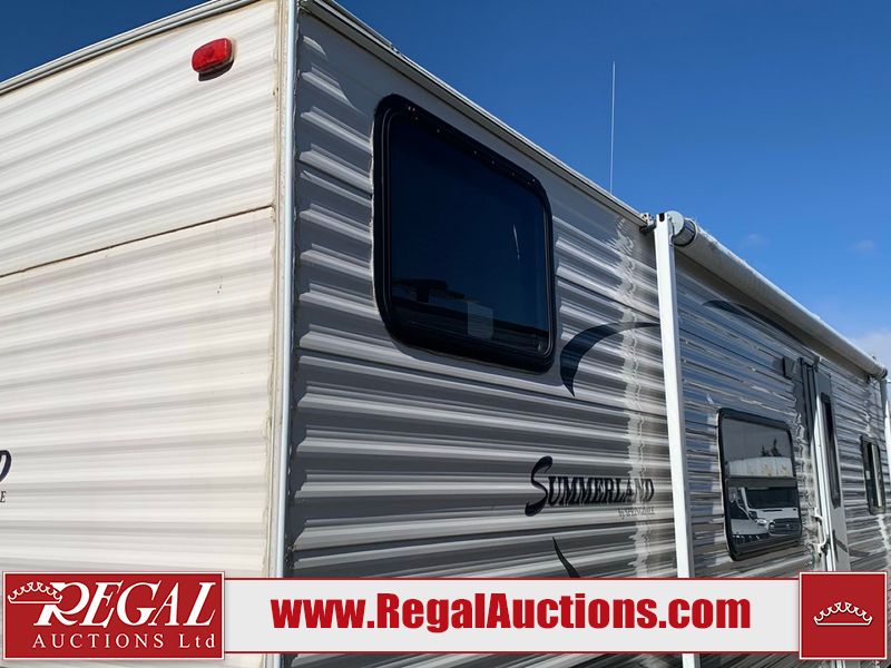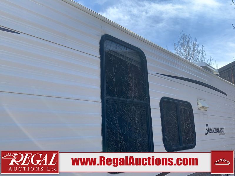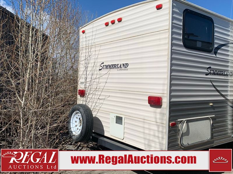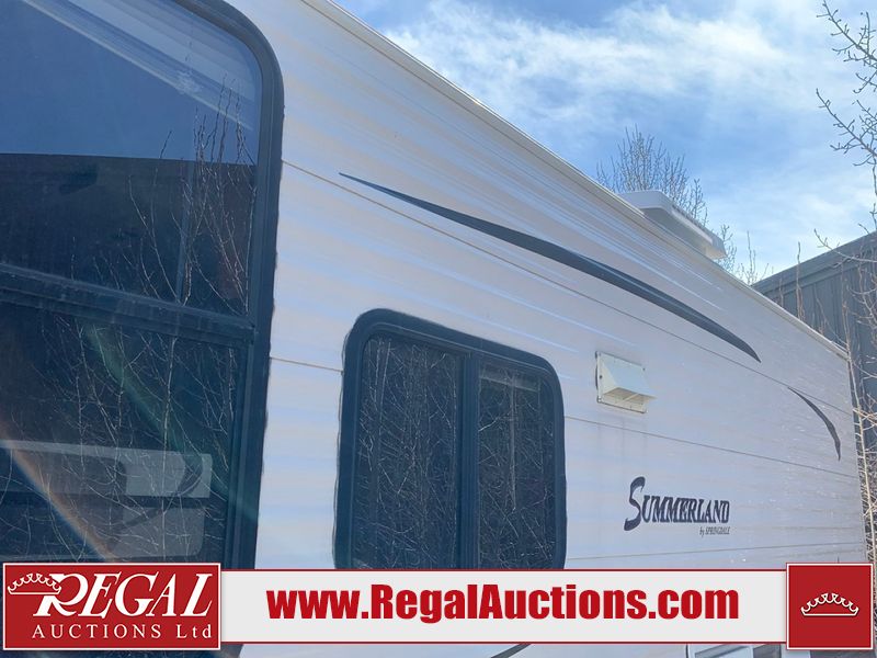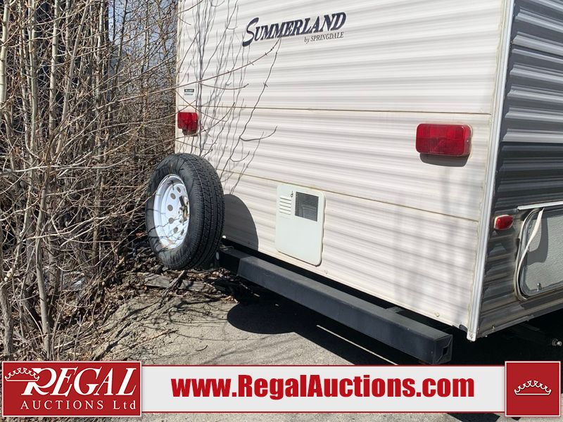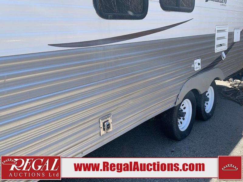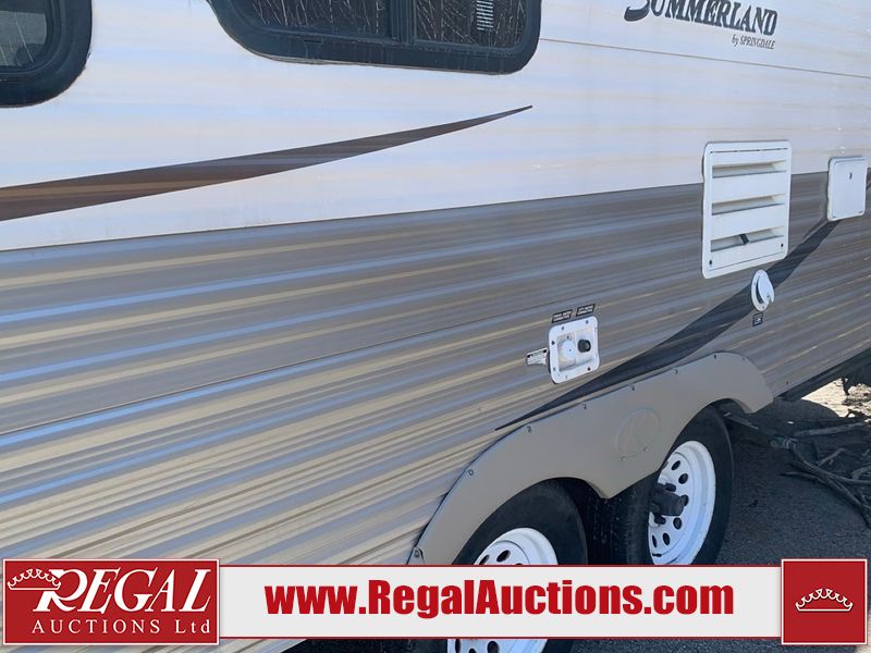 This RV is a 2007 Springdale Summerland Series TBL bumper 2600 model tandem axle pull trailer, it has a single door entry, and roof air. The interior is dirty. There are some scratches, and scuffs on some walls. The power outlet in the master bedroom is cracked. The floor is separating. The exterior walls are made out of soft wall aluminum. There are some scratches and dents on some walls. The left fender is cracked. The unit is missing the battery and propane tanks. The tires are mounted to steel wheels and appear to be in good enough condition for use. The unit is equipped with a television, stereo system, three stove burner top, microwave, oven, television, and a refrigerator. The layout consist of the master bedroom at the front, dinette/kitchenette in the center, and a bunkhouse/bathroom at the rear.