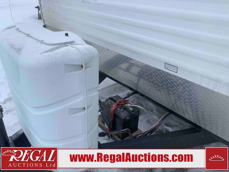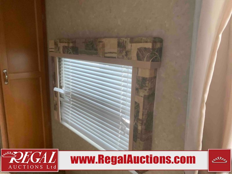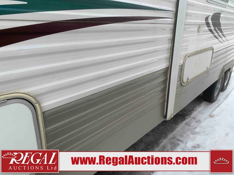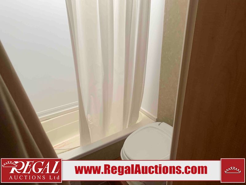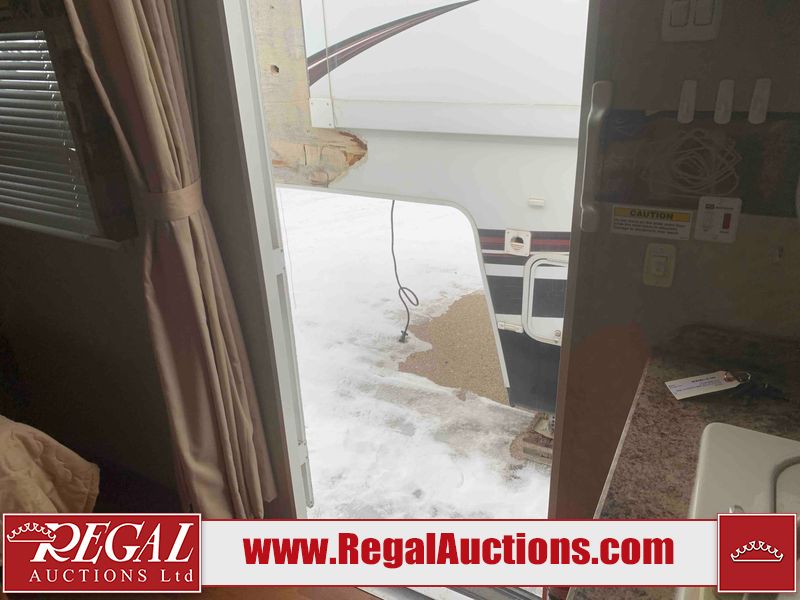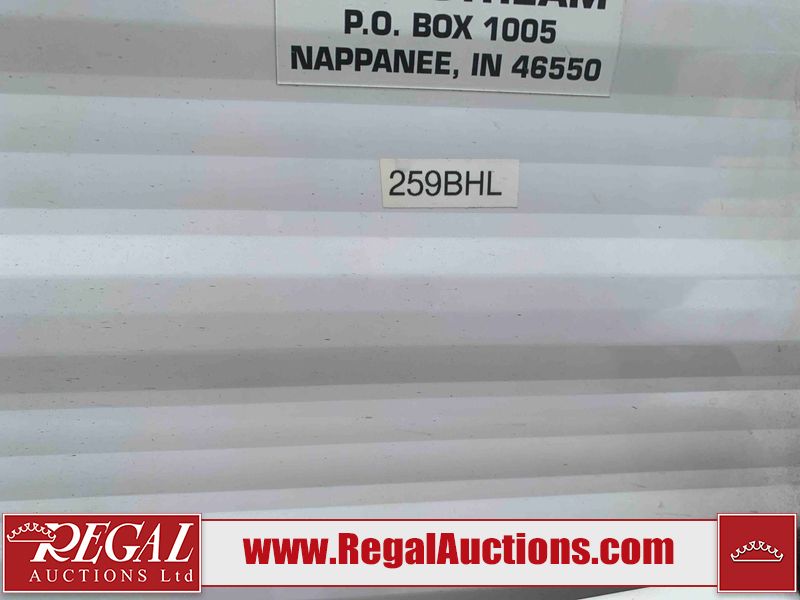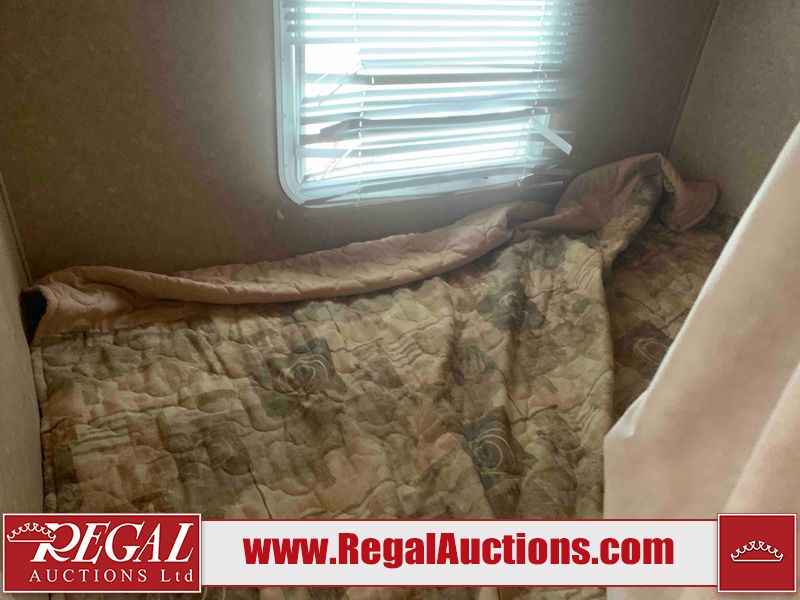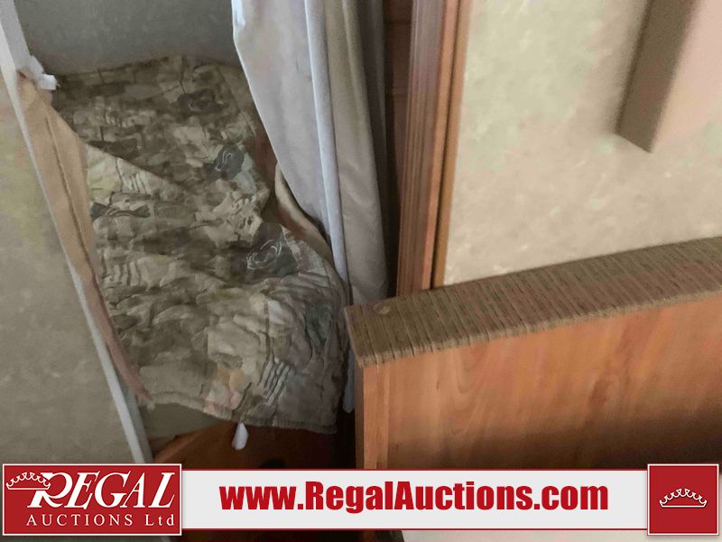 This RV is a 2010 golf stream coach Inc. conquest 259BHL model Tatum axle bumper pole trailer. It has a single door entry, roof air, and a single slide out accommodating the living area. The interior is dirty. Some walls are showing scratches and scuffs. The screen door is torn. The slide out trim is peeling. The shower curtain is worn. The ceiling fan trim is cracked. The exterior walls are made of soft wall aluminum. I was a showing scratches and scuffs. All walls have hail damage. Some decals are peeling. This unit does not get power with external power applied. The slide out cannot be tested. The battery is dead. This unit is equipped with a battery, and two propane tanks. The tires are mounted to steel rims and appear to be in good enough condition for use. This unit is equipped with a refrigerator, oven, three burner stove top, microwave, and a stereo system. The layout consist of a master bedroom in the front, kitchenette/dinette in the center, and a bathroom/bunkhouse in the rear.