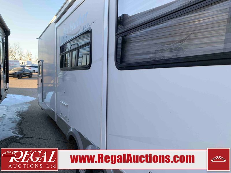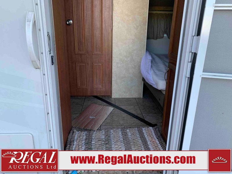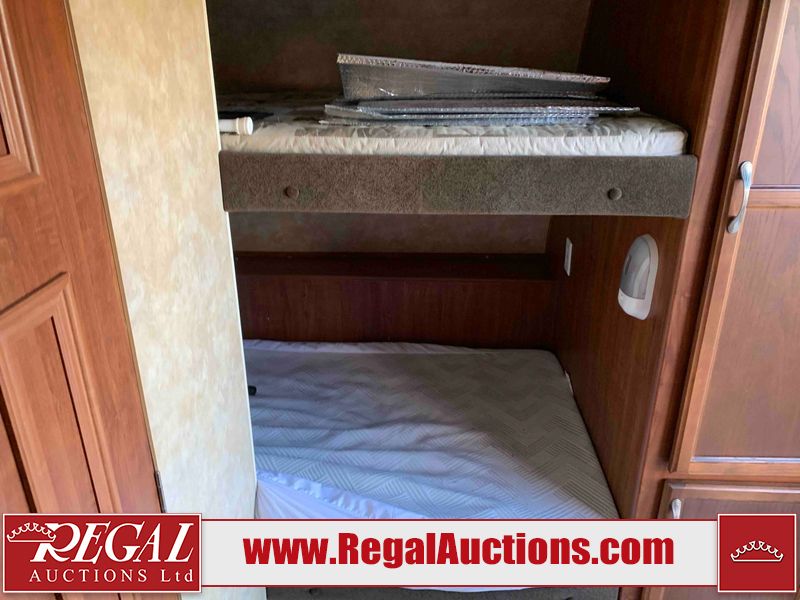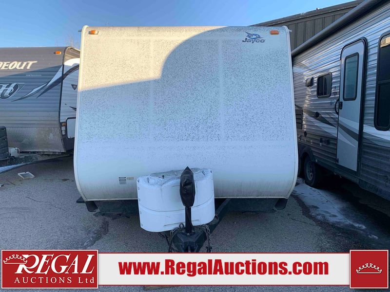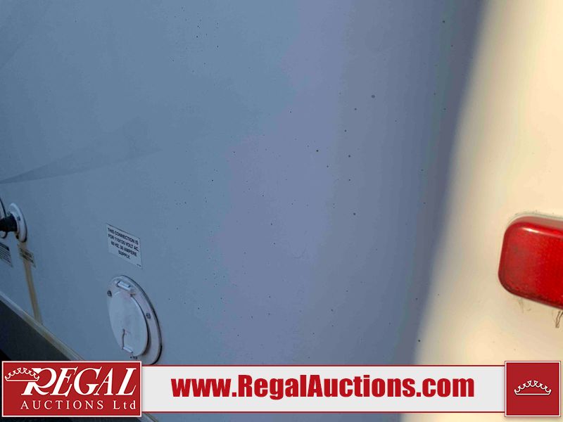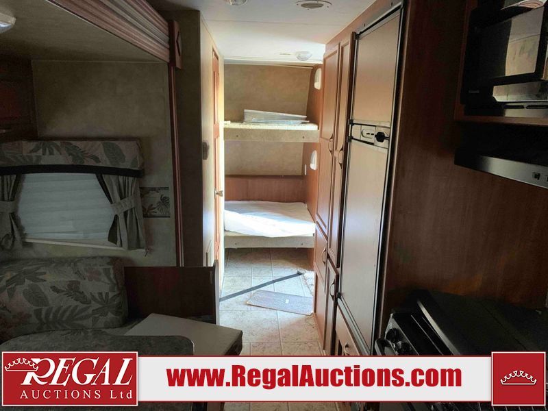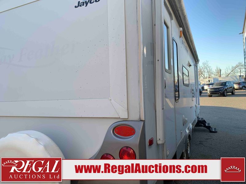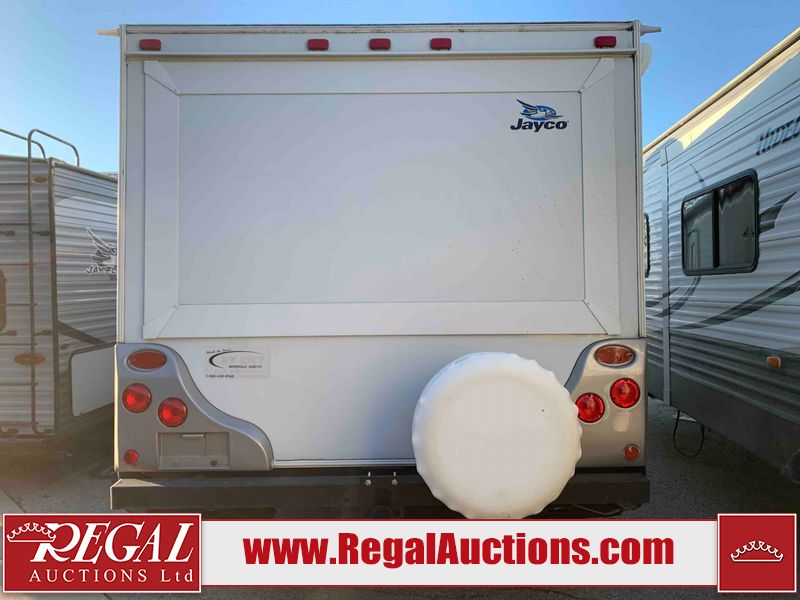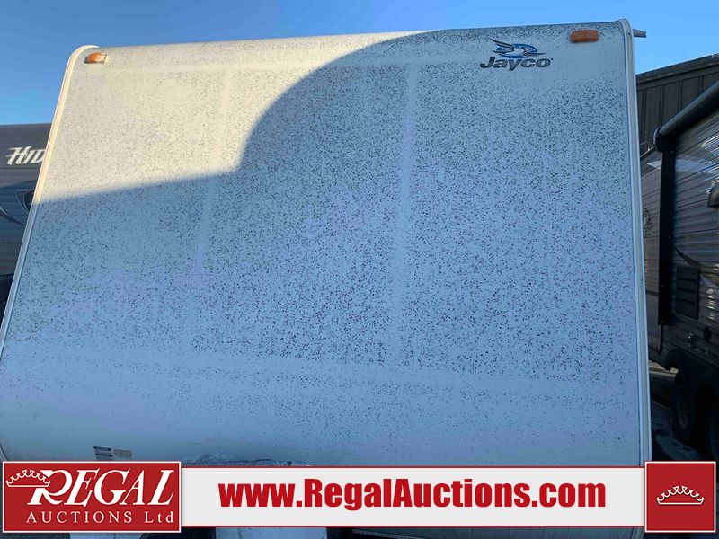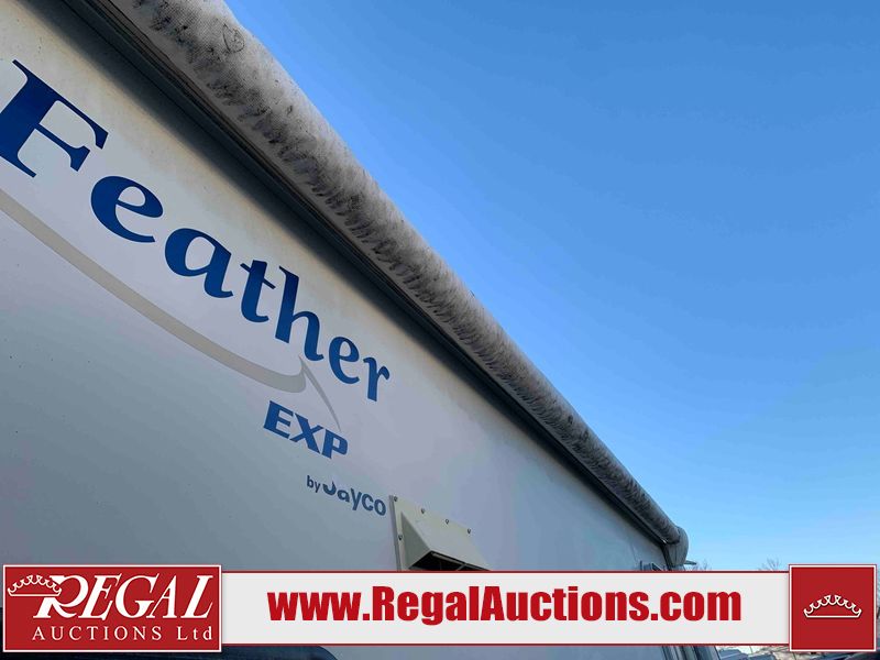 This 28' RV is a 2010 Jayco Feather EXP Series 26P model bumper pull travel trailer. It has two entry doors, roof air and two slide out accommodating, the dinette and the master bedroom. The interior is dirty. The wood trims are showing scratches and scuffs. The ceiling trim is peeling. The kitchen curtains are broken. The exterior walls are made of hard wall fiberglass. All walls have mold spots. Both side walls have scratches and scuffs. The lower curb side wall trim has dents. The door lock is broken. This unit comes with a battery. Both propane tanks are missing. The tires have been mounted to alloy rims and appear to be in good enough condition for use. This unit does not get power with external power applied, the slide outs have not been tested. It is equipped with a refrigerator, microwave, three burner stove top, oven, television, and a stereo system. The layout consists of a bunkhouse/bathroom at the front, kitchen/dinette in the centre and master bedroom at the rear.