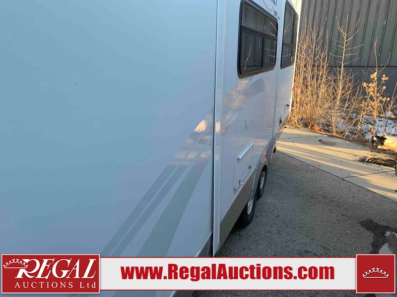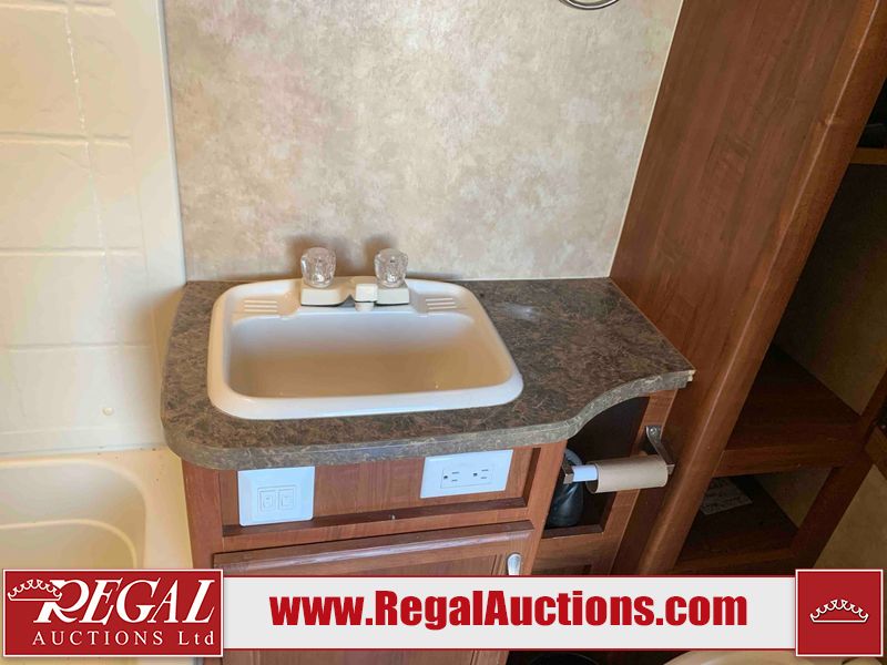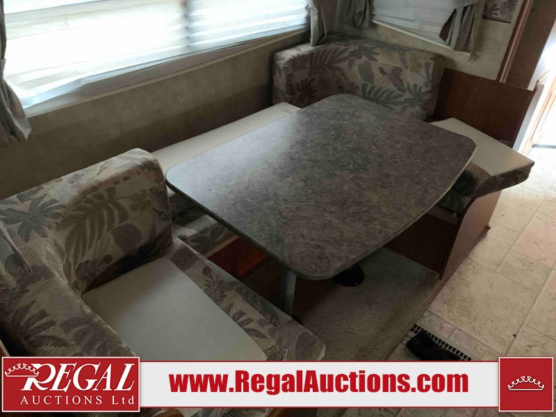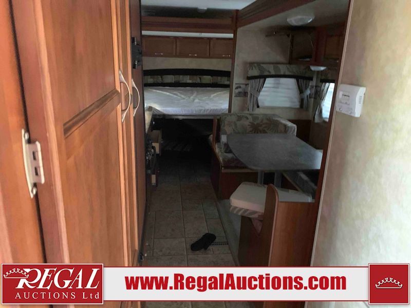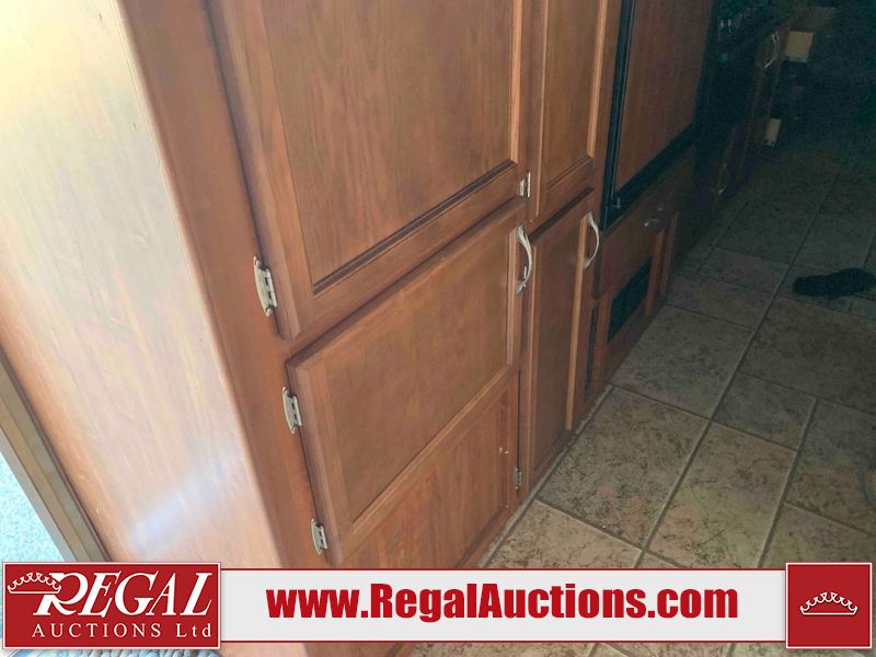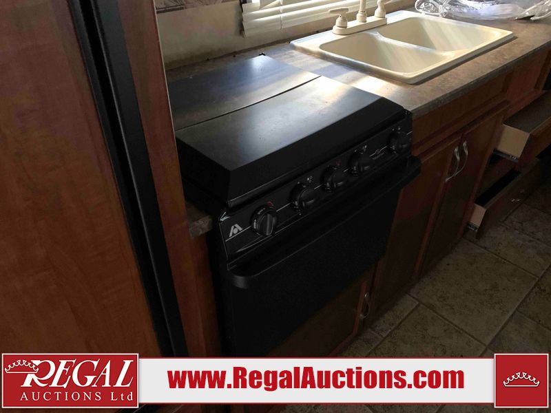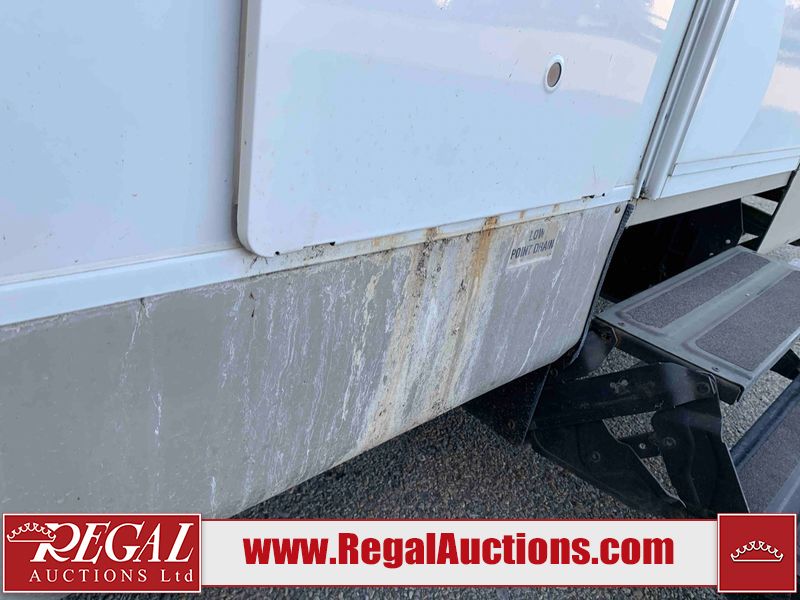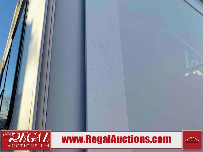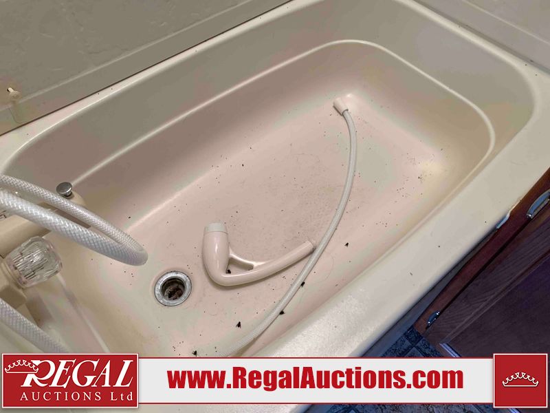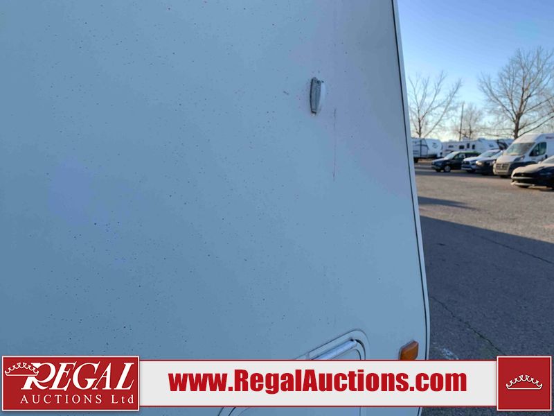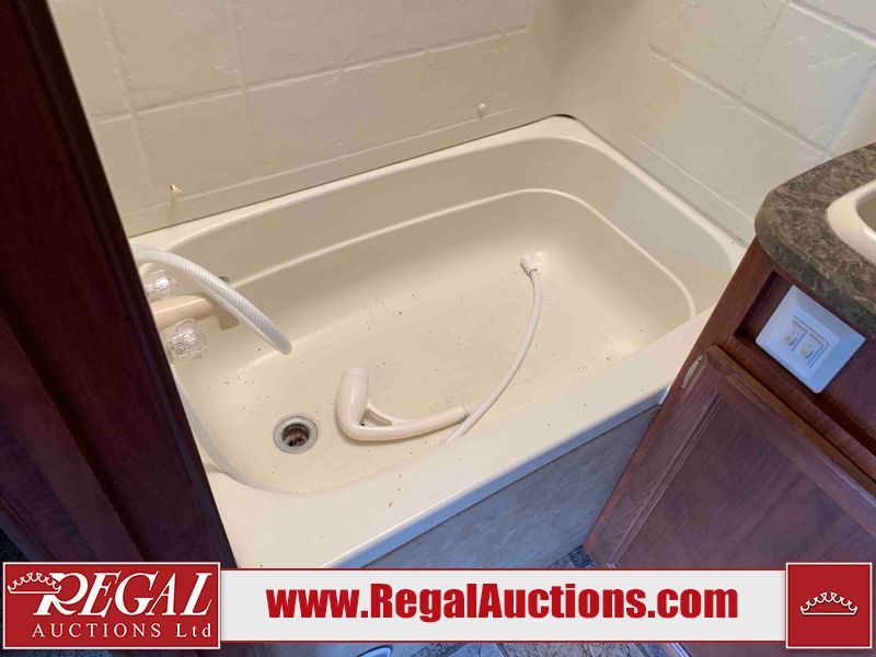 This 28' RV is a 2010 Jayco Feather EXP Series 26P model bumper pull travel trailer. It has two entry doors, roof air and two slide out accommodating, the dinette and the master bedroom. The interior is dirty. The wood trims are showing scratches and scuffs. The ceiling trim is peeling. The kitchen curtains are broken. The exterior walls are made of hard wall fiberglass. All walls have mold spots. Both side walls have scratches and scuffs. The lower curb side wall trim has dents. The door lock is broken. This unit comes with a battery. Both propane tanks are missing. The tires have been mounted to alloy rims and appear to be in good enough condition for use. This unit does not get power with external power applied, the slide outs have not been tested. It is equipped with a refrigerator, microwave, three burner stove top, oven, television, and a stereo system. The layout consists of a bunkhouse/bathroom at the front, kitchen/dinette in the centre and master bedroom at the rear.