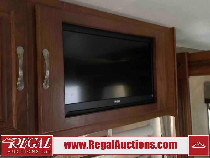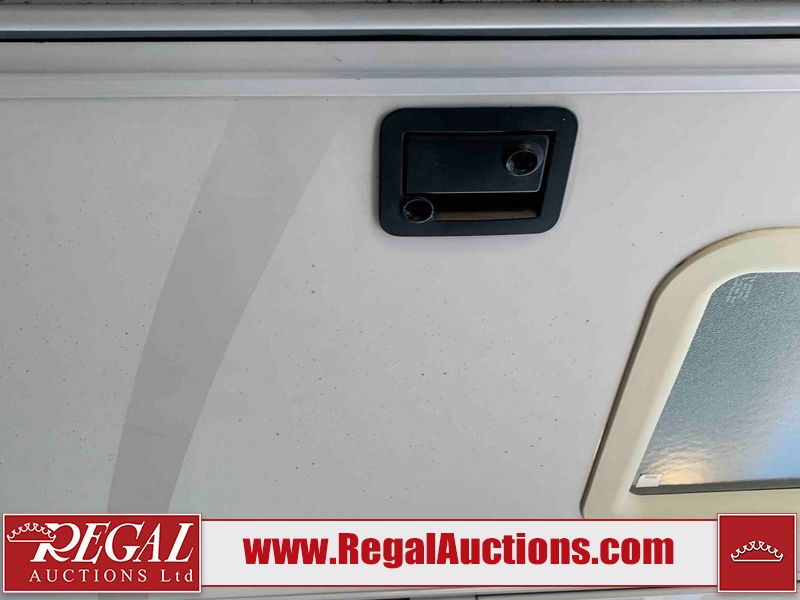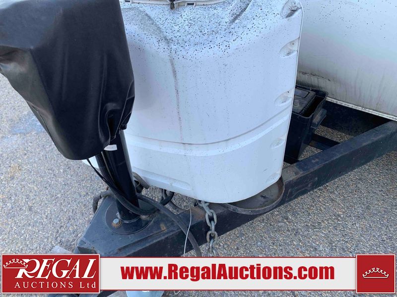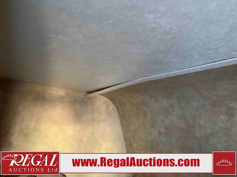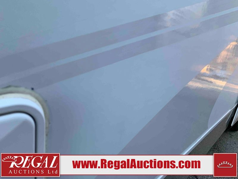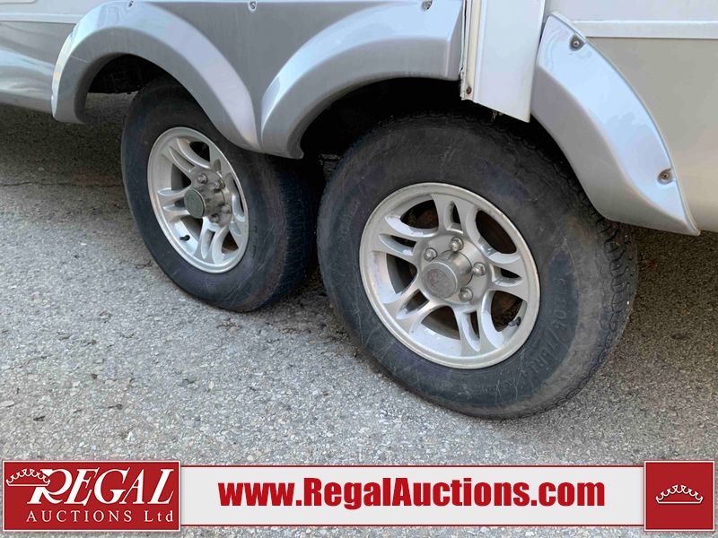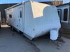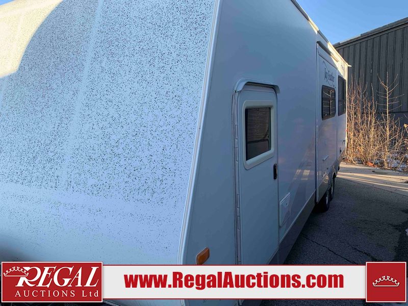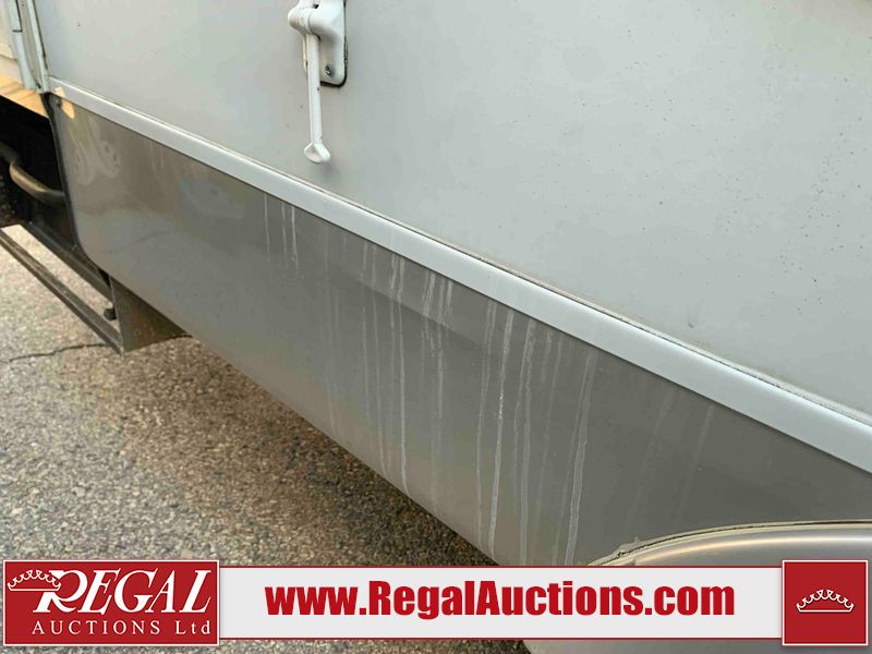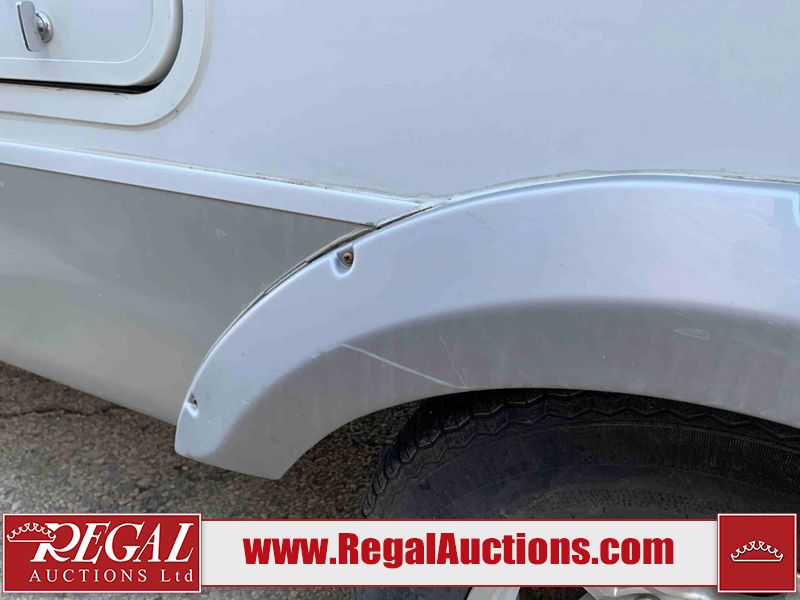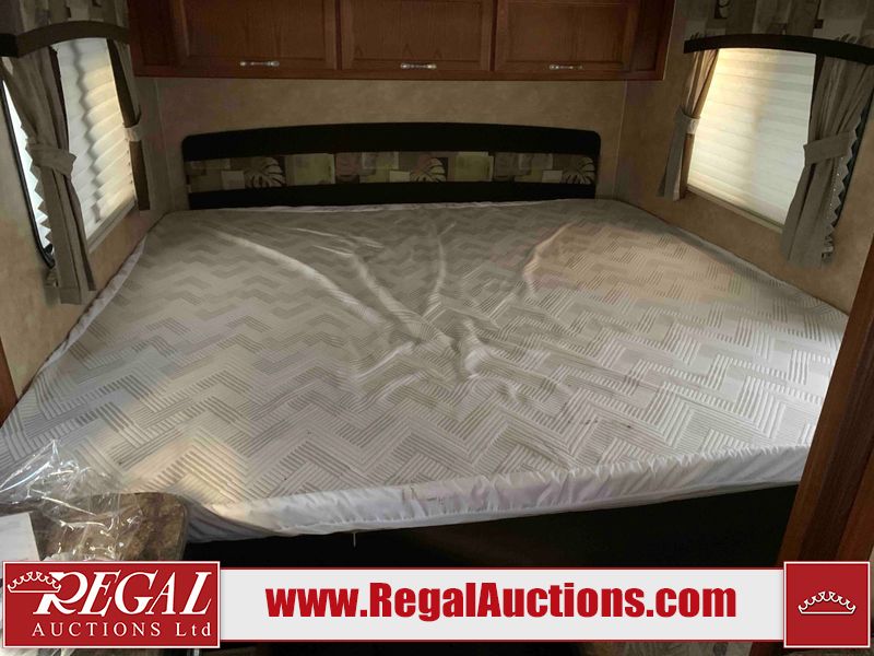 This 28' RV is a 2010 Jayco Feather EXP Series 26P model bumper pull travel trailer. It has two entry doors, roof air and two slide out accommodating, the dinette and the master bedroom. The interior is dirty. The wood trims are showing scratches and scuffs. The ceiling trim is peeling. The kitchen curtains are broken. The exterior walls are made of hard wall fiberglass. All walls have mold spots. Both side walls have scratches and scuffs. The lower curb side wall trim has dents. The door lock is broken. This unit comes with a battery. Both propane tanks are missing. The tires have been mounted to alloy rims and appear to be in good enough condition for use. This unit does not get power with external power applied, the slide outs have not been tested. It is equipped with a refrigerator, microwave, three burner stove top, oven, television, and a stereo system. The layout consists of a bunkhouse/bathroom at the front, kitchen/dinette in the centre and master bedroom at the rear.