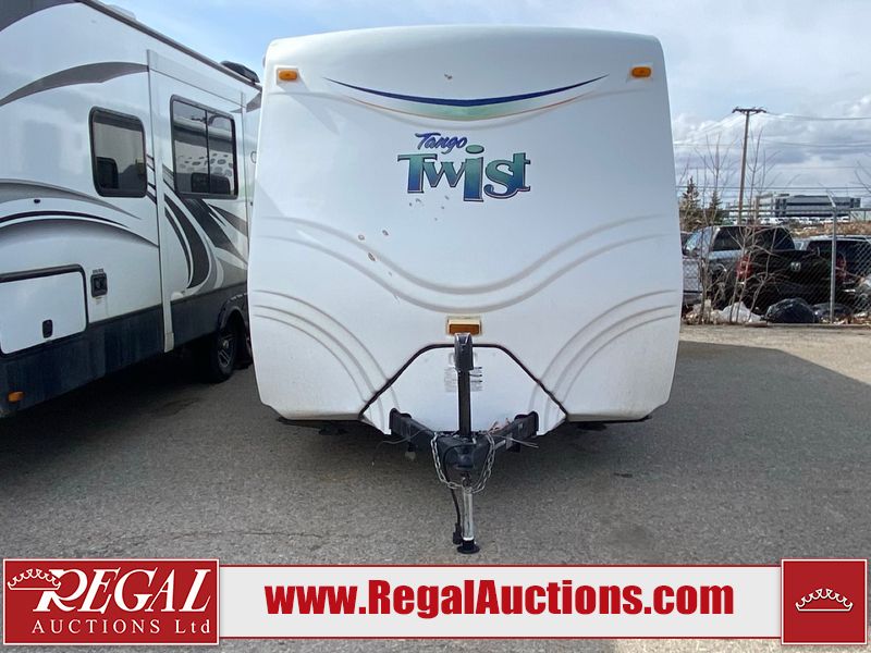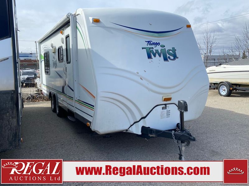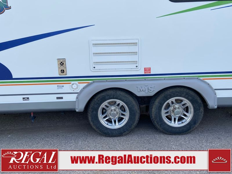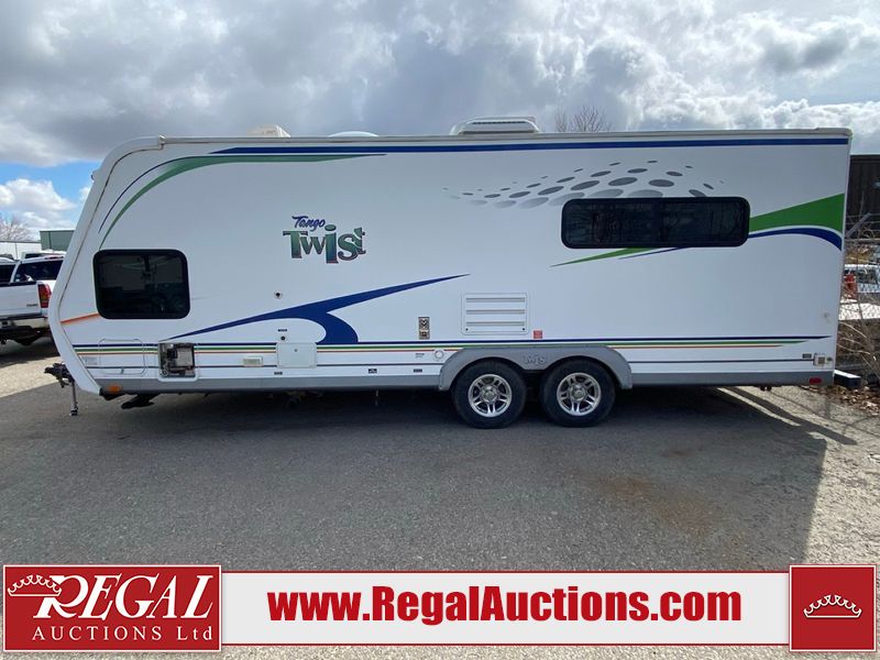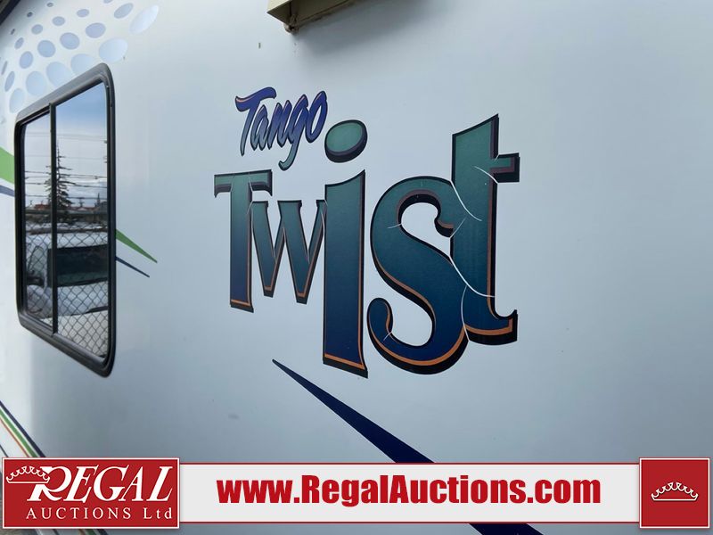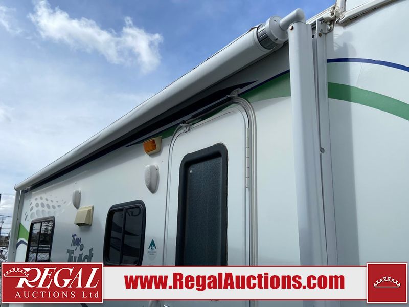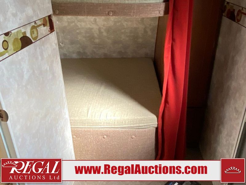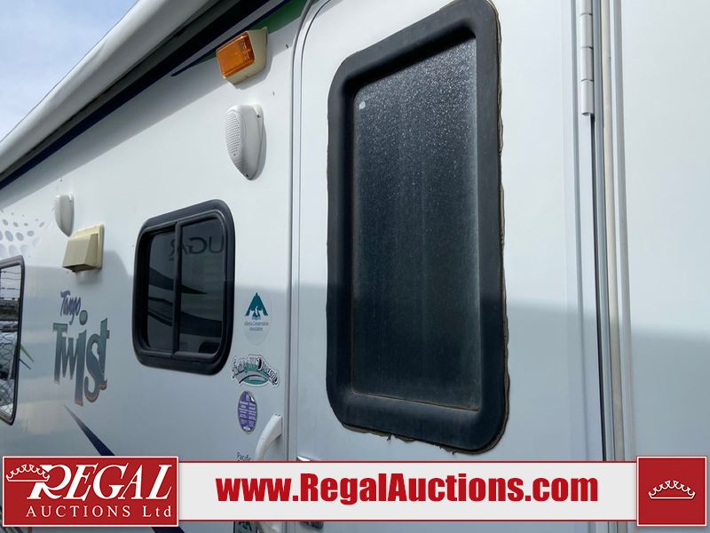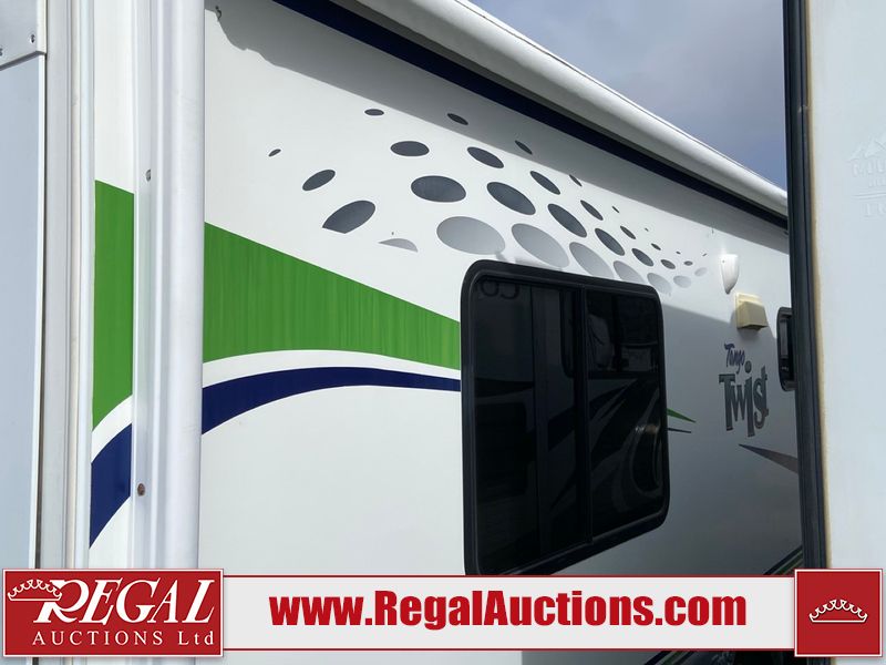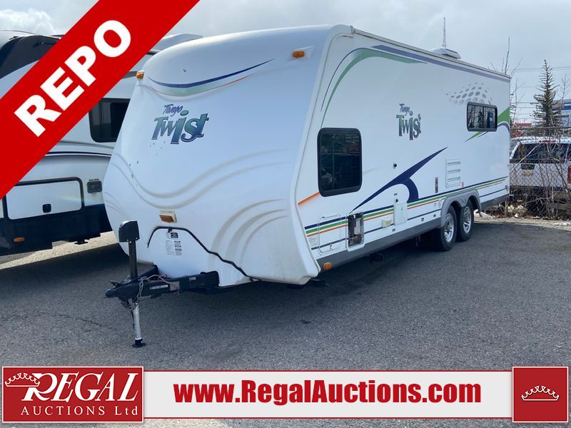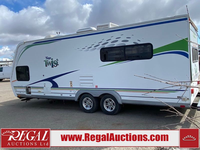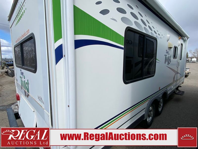 This unit is a 2010 Pacific Coachworks Twists 25BHRS model tandem axle bumper pull trailer. It has a single door entry, roof air, and a single slide out accommodating the master bedroom. The interior is dirty. The bed is torn. The wood paneling has scuffs and scratches. The wallpaper is peeling. The dinette cushions are torn. The exterior walls are made out of hard wall fiberglass. All walls are showing chips, scratches, and scuffs. Some decals are cracking. All walls are showing mildew. Both plastic fenders are cracked. This unit gets power with external power applied. The battery is removed. Tires are mounted to alloy rims and appear to be in rough condition. This unit is equipped with a three burner stove, microwave, refrigerator, and stereo system. The layout consists of a bunkhouse and bathroom at the front, kitchen and living area at the centre and a master bed at the rear.