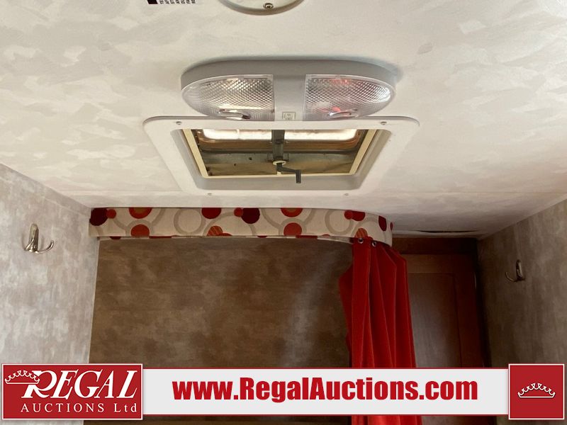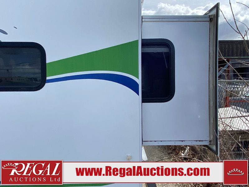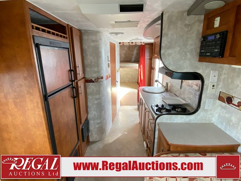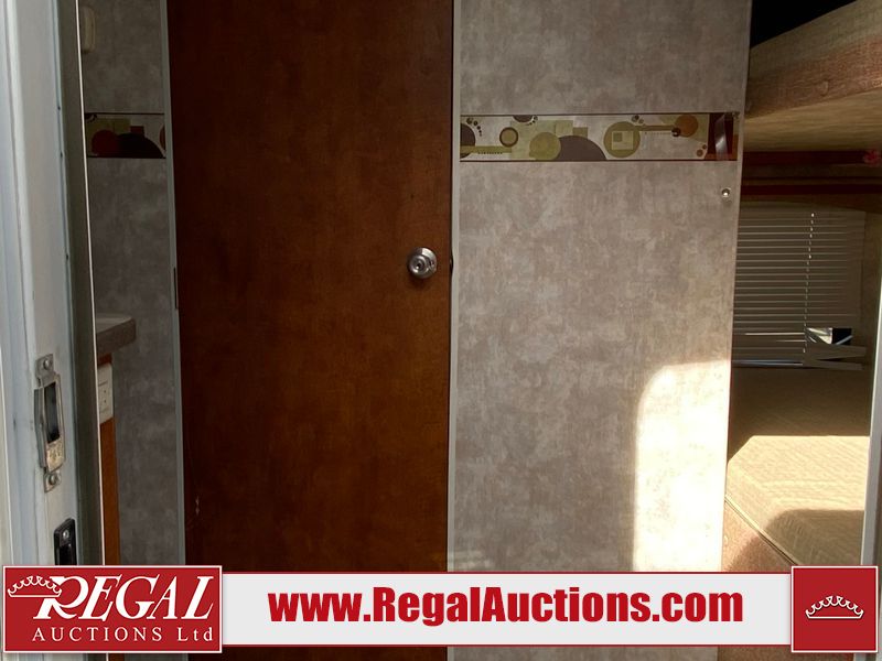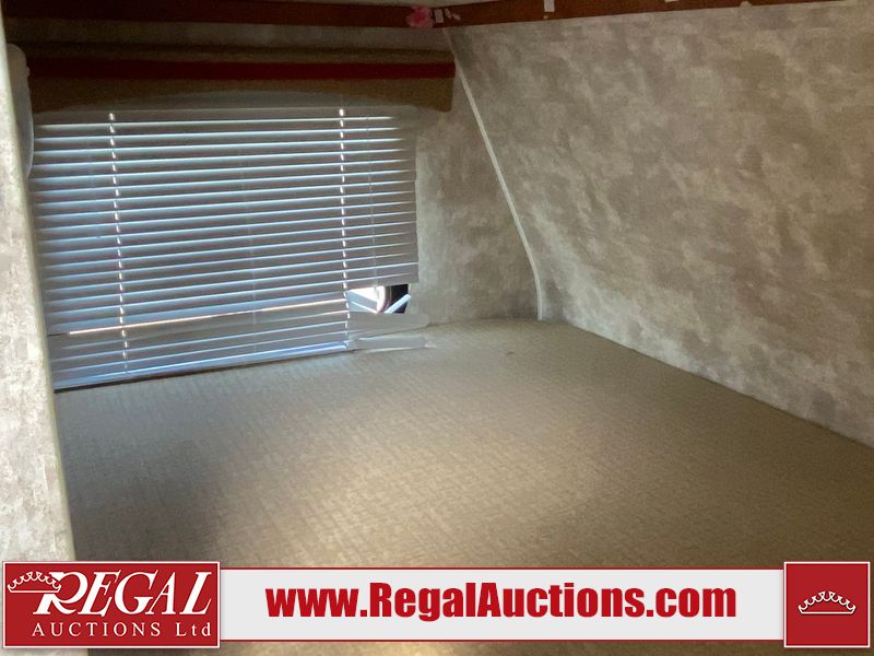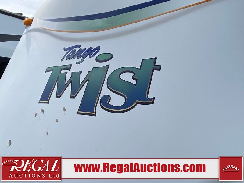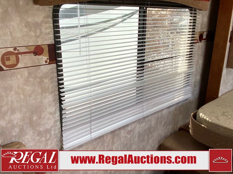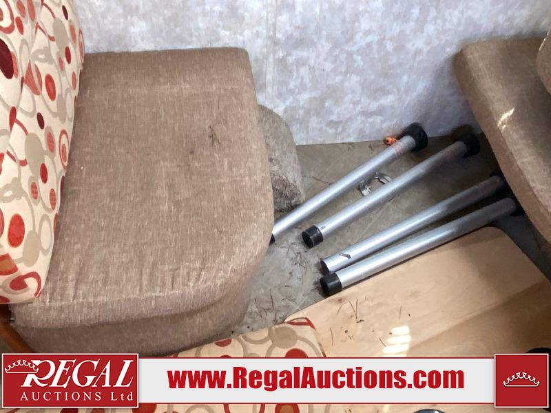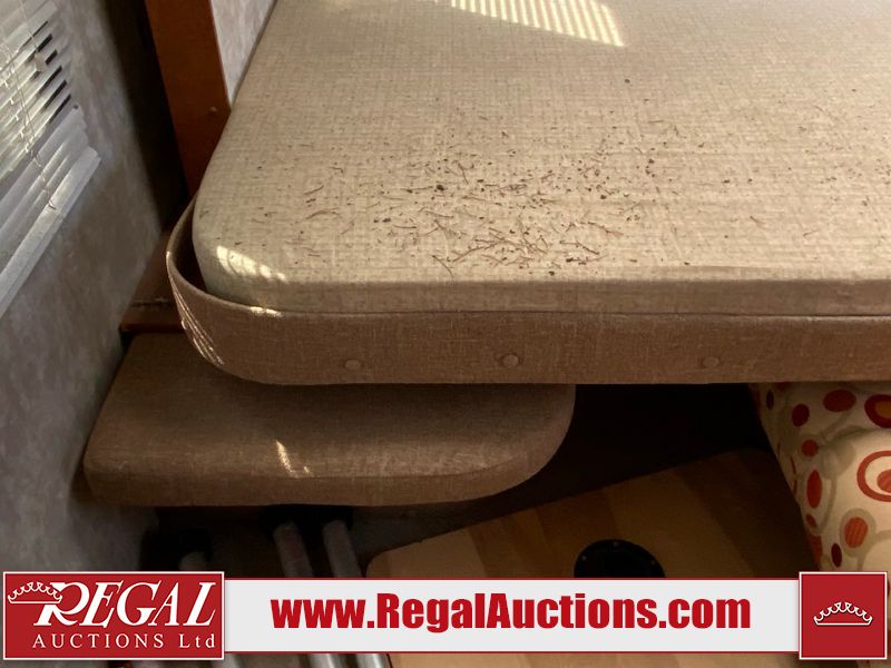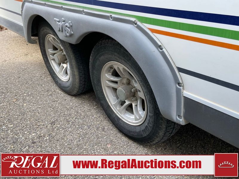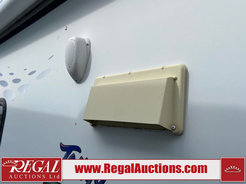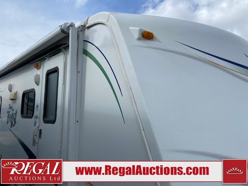 This unit is a 2010 Pacific Coachworks Twists 25BHRS model tandem axle bumper pull trailer. It has a single door entry, roof air, and a single slide out accommodating the master bedroom. The interior is dirty. The bed is torn. The wood paneling has scuffs and scratches. The wallpaper is peeling. The dinette cushions are torn. The exterior walls are made out of hard wall fiberglass. All walls are showing chips, scratches, and scuffs. Some decals are cracking. All walls are showing mildew. Both plastic fenders are cracked. This unit gets power with external power applied. The battery is removed. Tires are mounted to alloy rims and appear to be in rough condition. This unit is equipped with a three burner stove, microwave, refrigerator, and stereo system. The layout consists of a bunkhouse and bathroom at the front, kitchen and living area at the centre and a master bed at the rear.