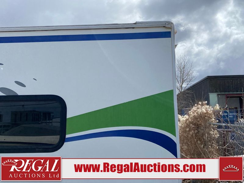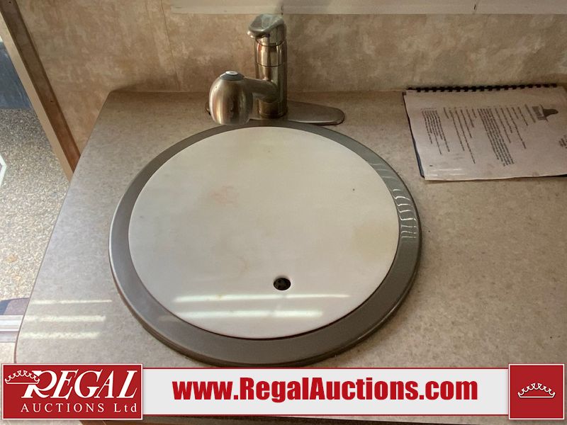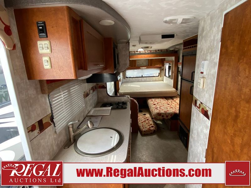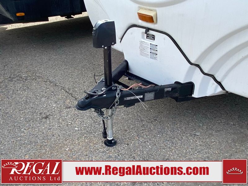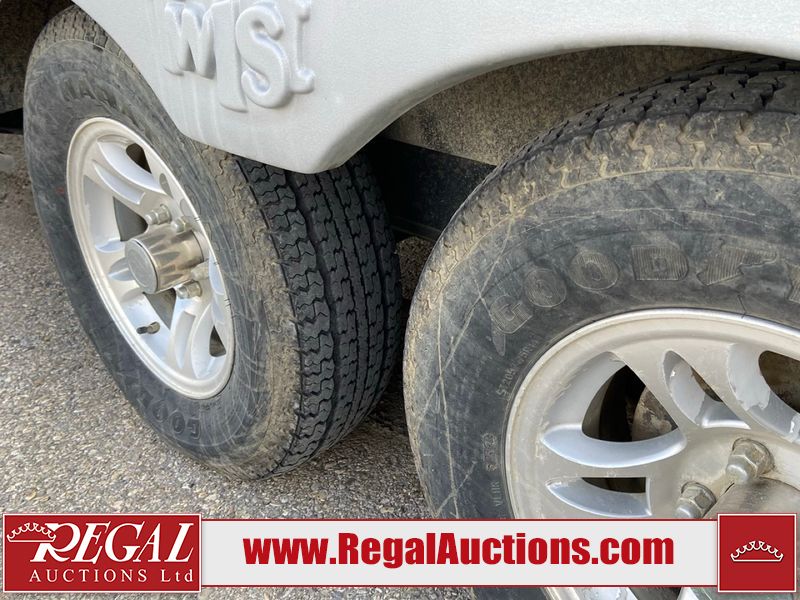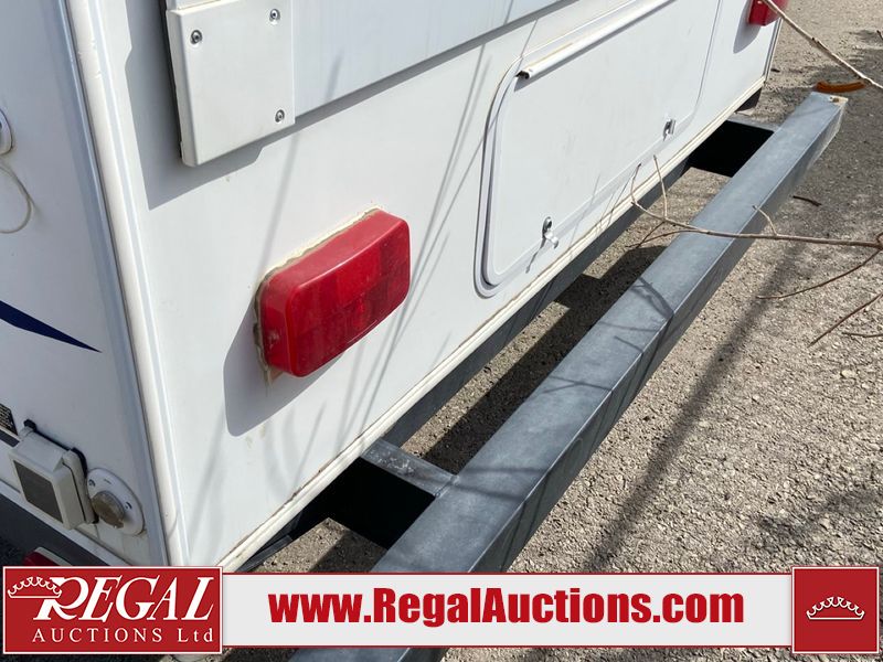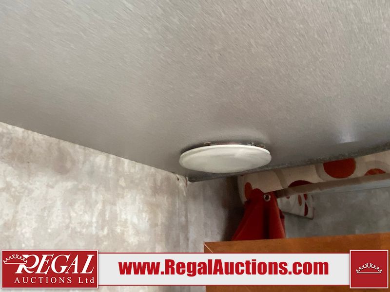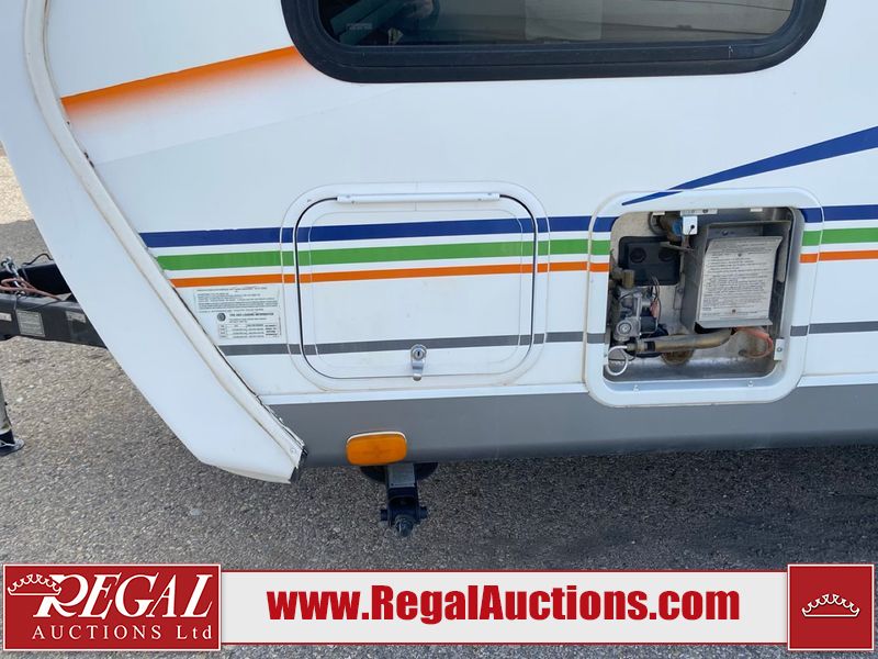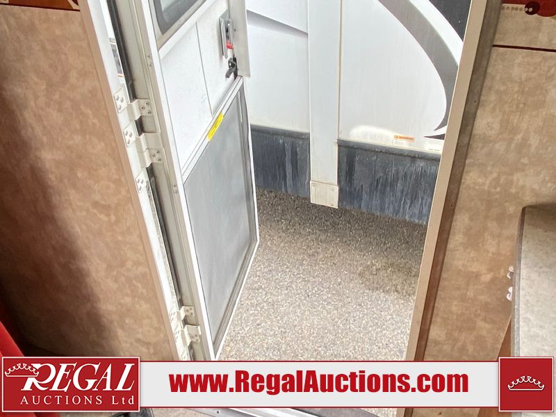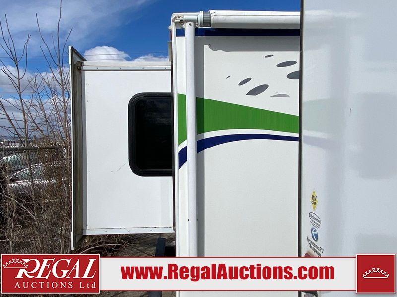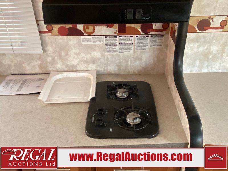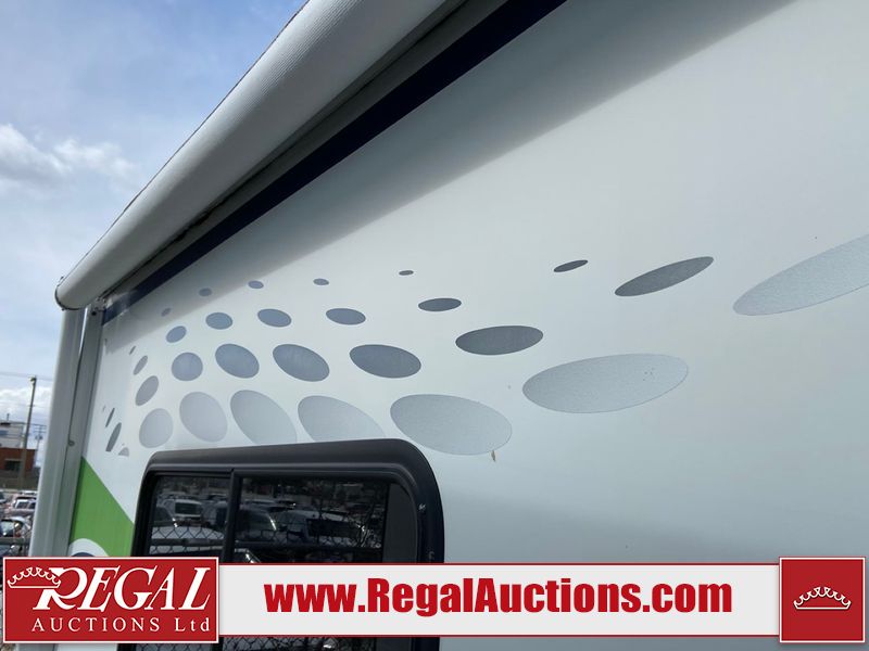 This unit is a 2010 Pacific Coachworks Twists 25BHRS model tandem axle bumper pull trailer. It has a single door entry, roof air, and a single slide out accommodating the master bedroom. The interior is dirty. The bed is torn. The wood paneling has scuffs and scratches. The wallpaper is peeling. The dinette cushions are torn. The exterior walls are made out of hard wall fiberglass. All walls are showing chips, scratches, and scuffs. Some decals are cracking. All walls are showing mildew. Both plastic fenders are cracked. This unit gets power with external power applied. The battery is removed. Tires are mounted to alloy rims and appear to be in rough condition. This unit is equipped with a three burner stove, microwave, refrigerator, and stereo system. The layout consists of a bunkhouse and bathroom at the front, kitchen and living area at the centre and a master bed at the rear.
