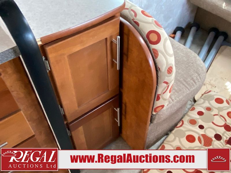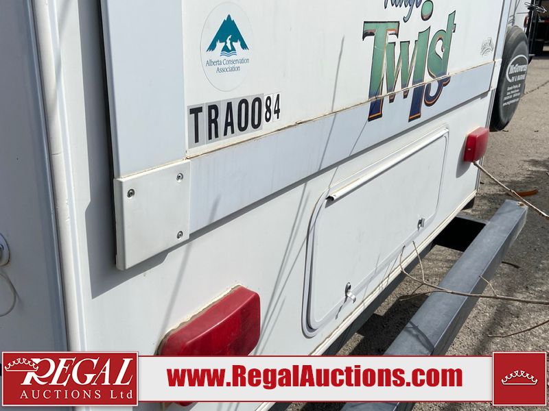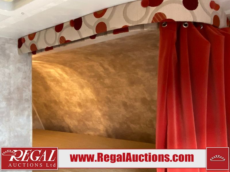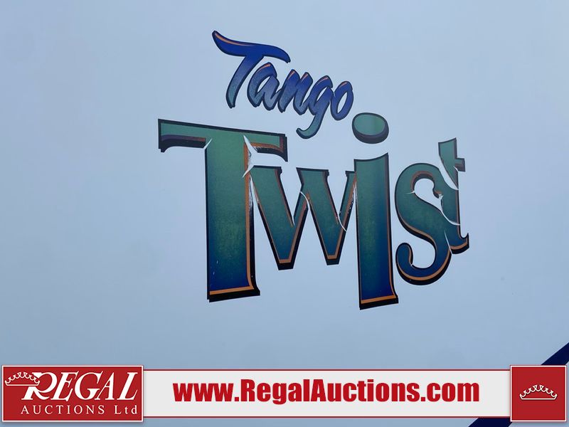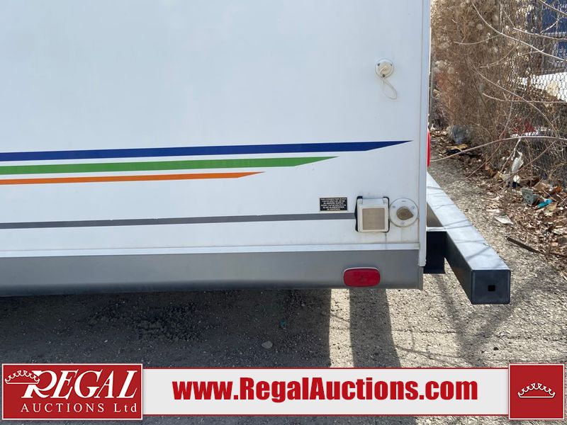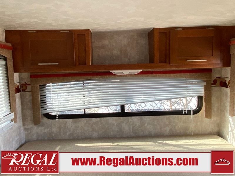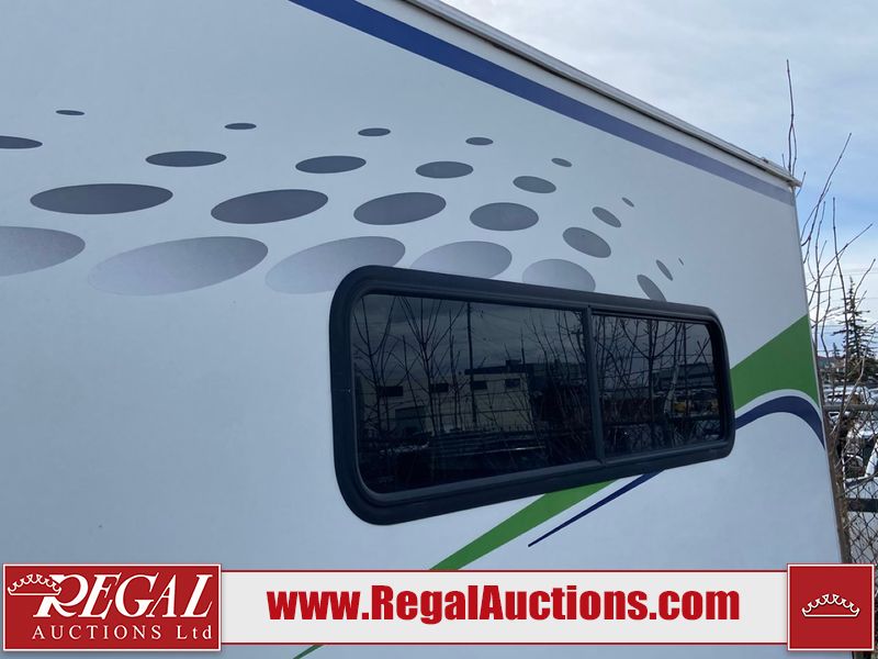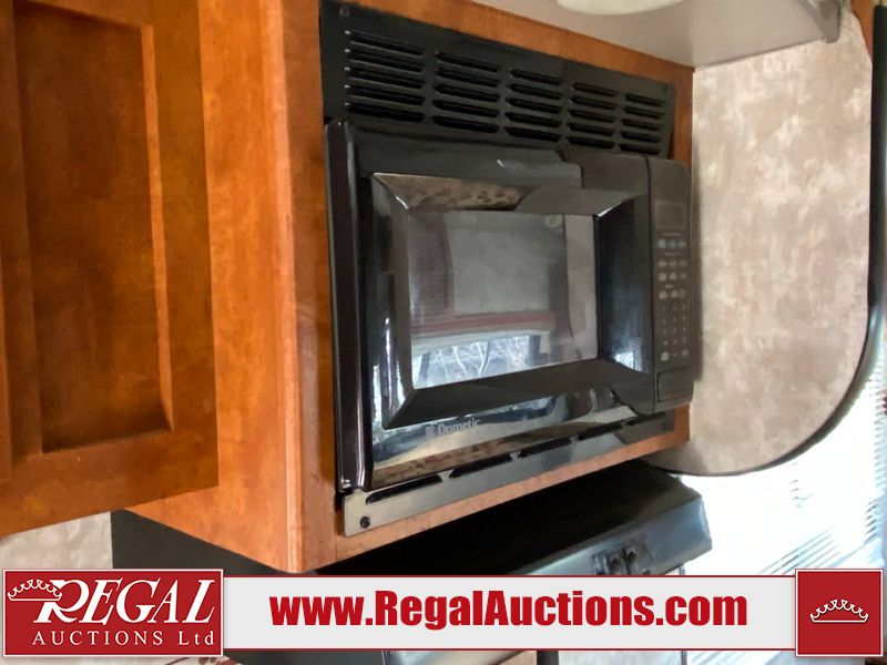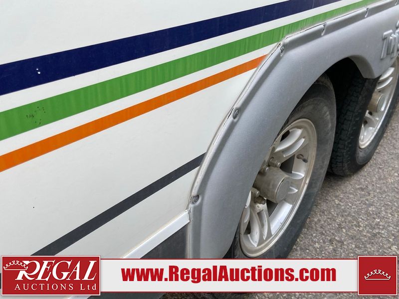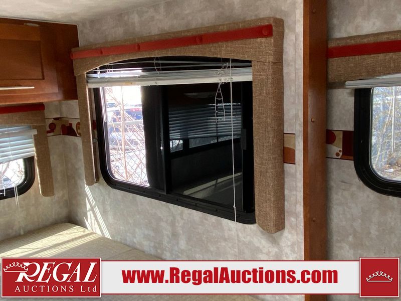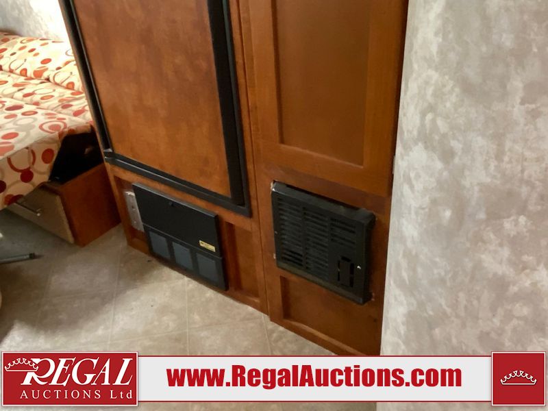 This unit is a 2010 Pacific Coachworks Twists 25BHRS model tandem axle bumper pull trailer. It has a single door entry, roof air, and a single slide out accommodating the master bedroom. The interior is dirty. The bed is torn. The wood paneling has scuffs and scratches. The wallpaper is peeling. The dinette cushions are torn. The exterior walls are made out of hard wall fiberglass. All walls are showing chips, scratches, and scuffs. Some decals are cracking. All walls are showing mildew. Both plastic fenders are cracked. This unit gets power with external power applied. The battery is removed. Tires are mounted to alloy rims and appear to be in rough condition. This unit is equipped with a three burner stove, microwave, refrigerator, and stereo system. The layout consists of a bunkhouse and bathroom at the front, kitchen and living area at the centre and a master bed at the rear.