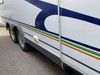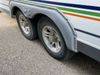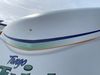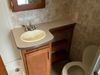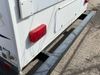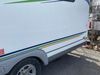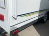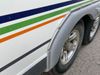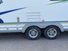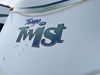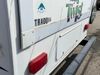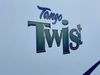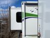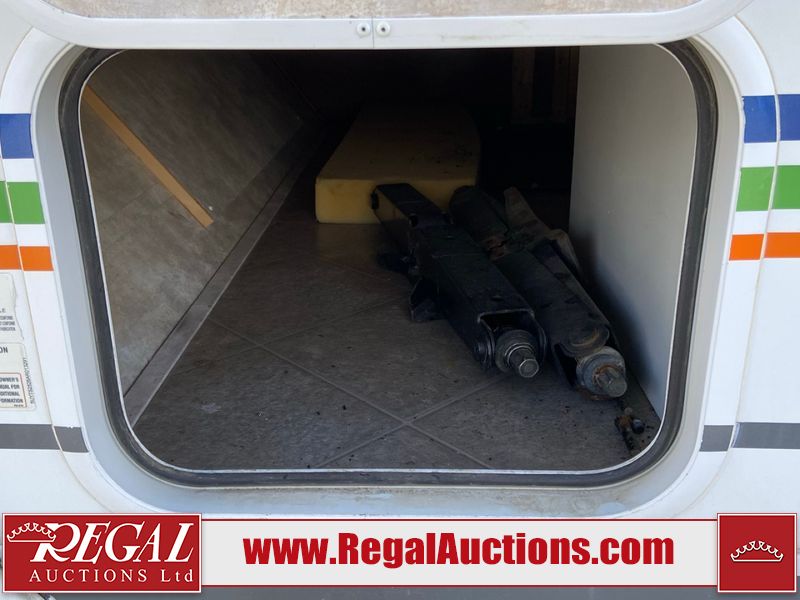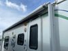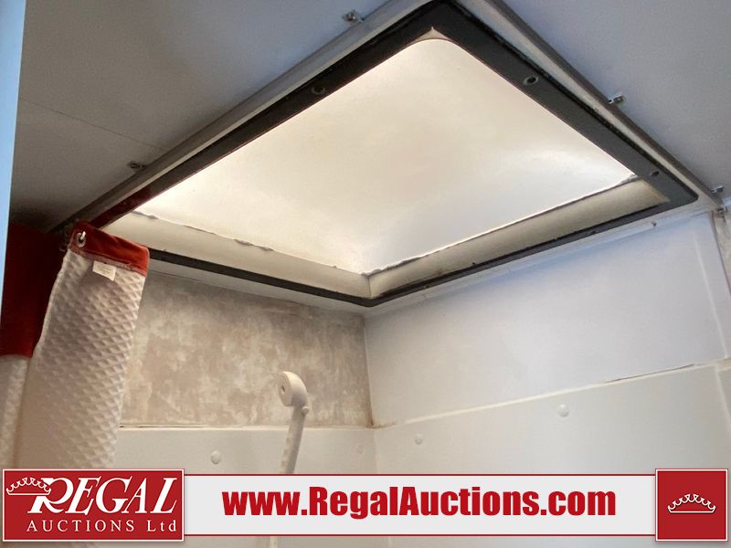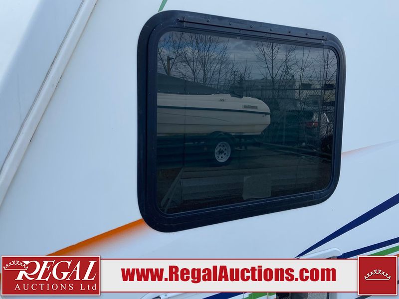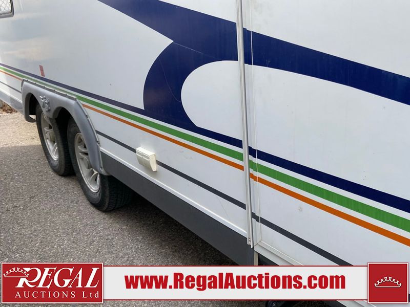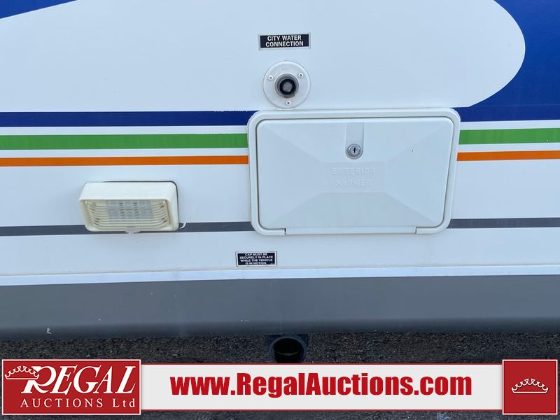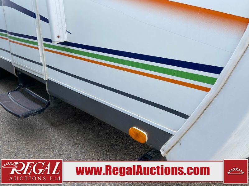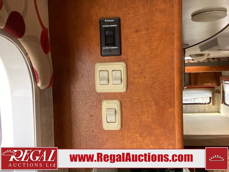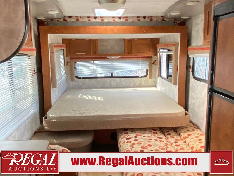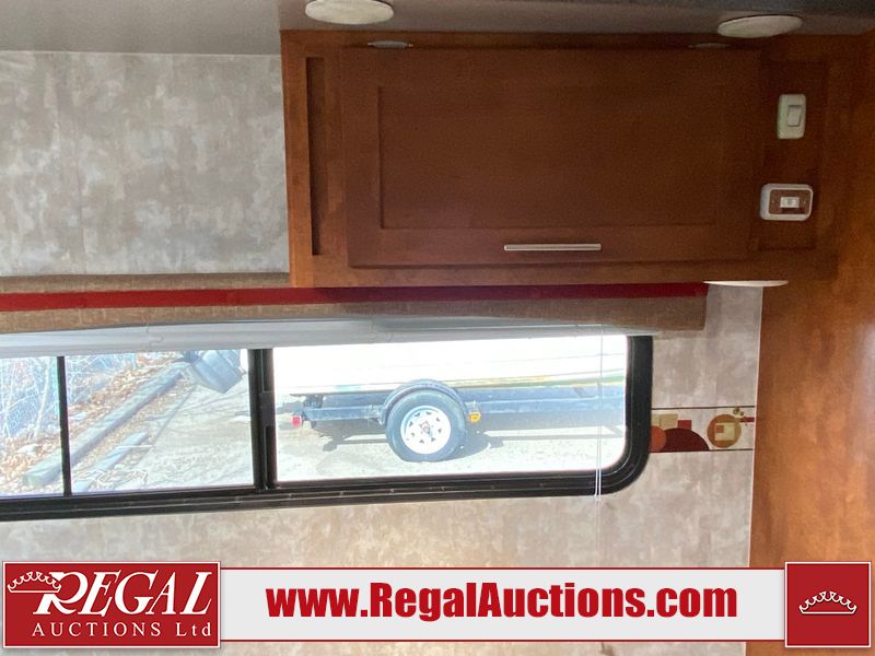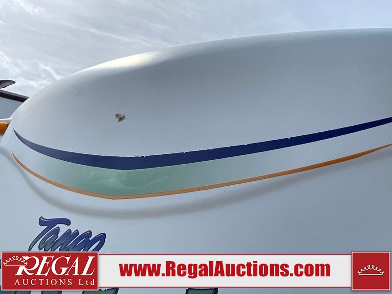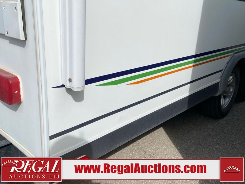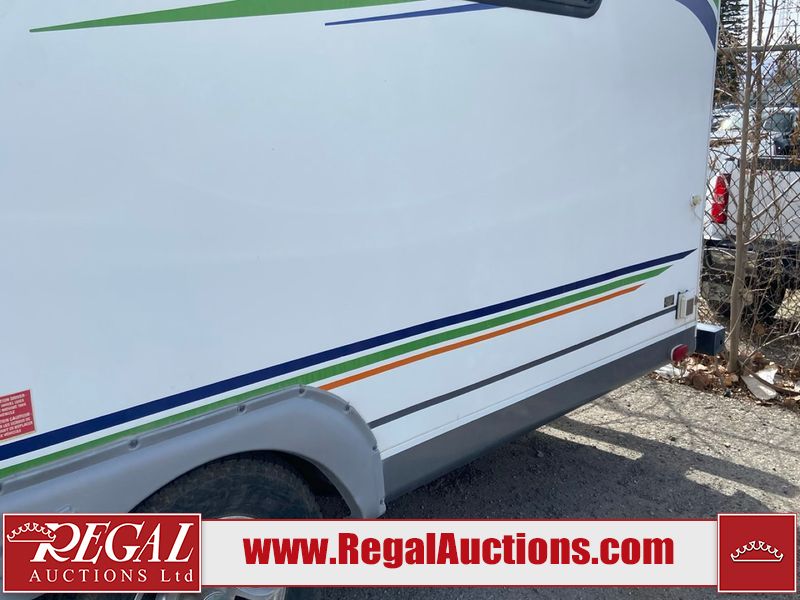 This unit is a 2010 Pacific Coachworks Twists 25BHRS model tandem axle bumper pull trailer. It has a single door entry, roof air, and a single slide out accommodating the master bedroom. The interior is dirty. The bed is torn. The wood paneling has scuffs and scratches. The wallpaper is peeling. The dinette cushions are torn. The exterior walls are made out of hard wall fiberglass. All walls are showing chips, scratches, and scuffs. Some decals are cracking. All walls are showing mildew. Both plastic fenders are cracked. This unit gets power with external power applied. The battery is removed. Tires are mounted to alloy rims and appear to be in rough condition. This unit is equipped with a three burner stove, microwave, refrigerator, and stereo system. The layout consists of a bunkhouse and bathroom at the front, kitchen and living area at the centre and a master bed at the rear.