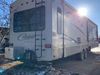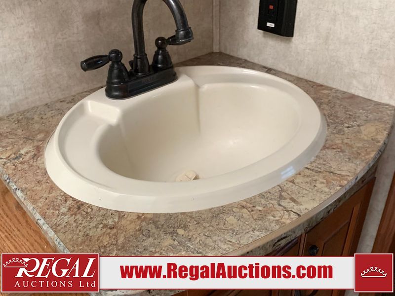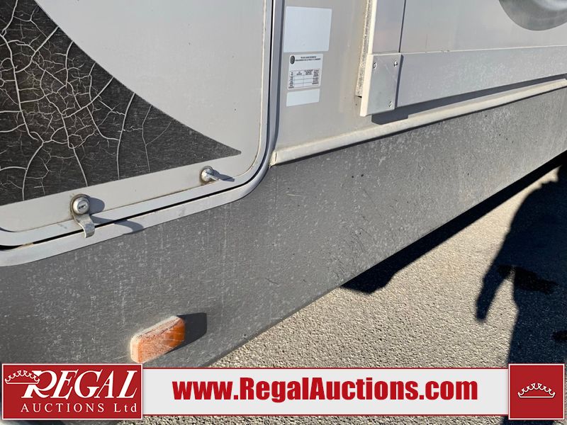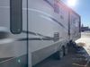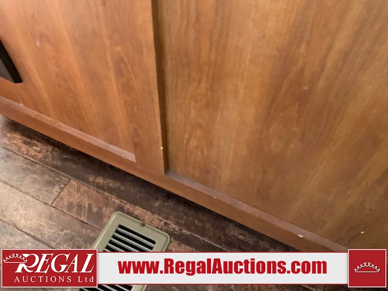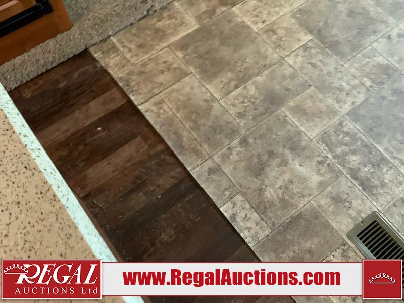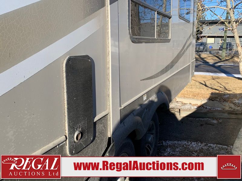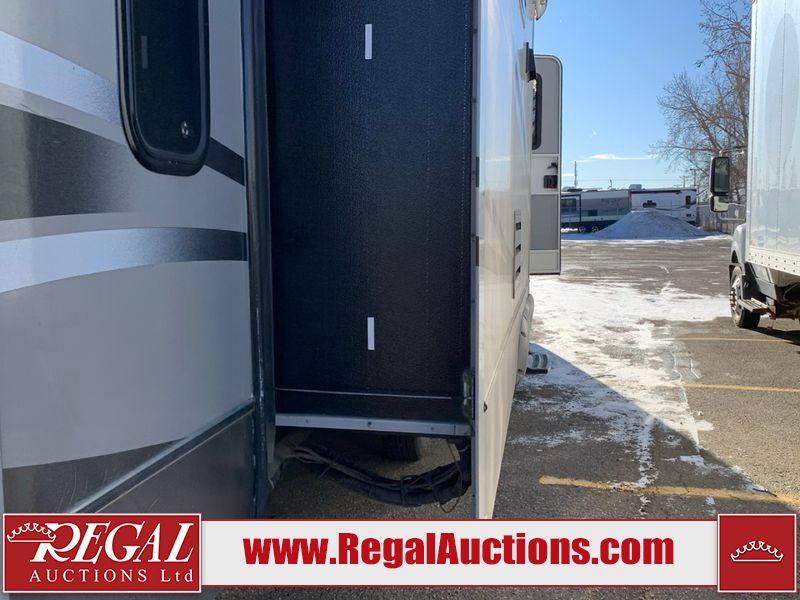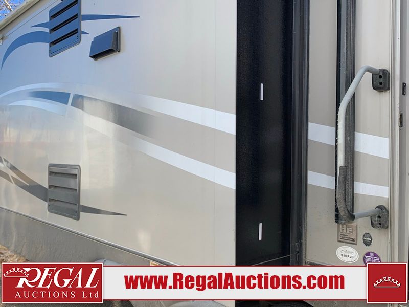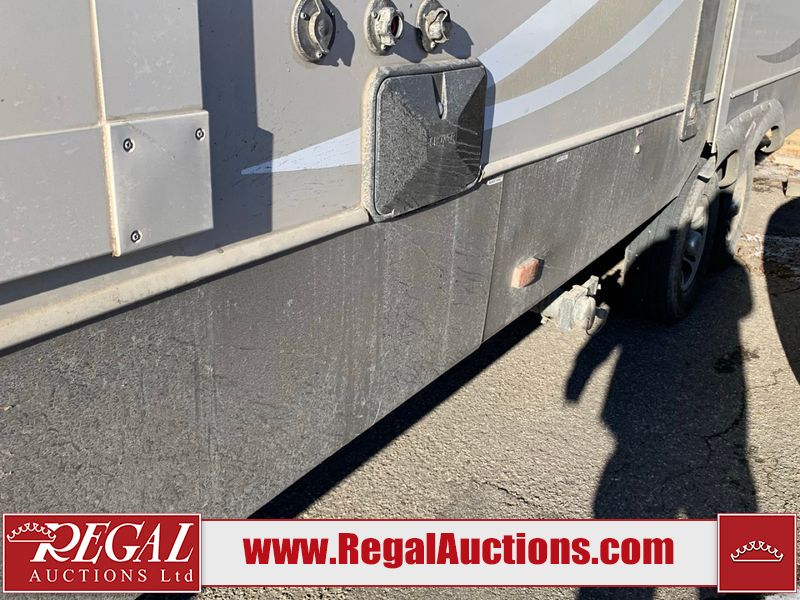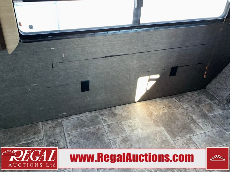 This RV is a 2013 keystone cougar series 319 RLS model bumper pull travel trailer. This unit unit has a single entry door, roof air and three slide outs accommodating the master bedroom, kitchen and living area. Interior is dirty and has a strong odor. The rear seating is missing. The floor, trim, and walls have scratches and scrapes. The rear flooring is peeling. The floor has soft spots. The kitchen cabinets and shelving have drilled holes. The leather seating is worn/torn. the hallway leading to the master bedroom has an aftermarket wall installed. The exterior walls are made of hard wall fiberglass. The propane tank compartment cover is missing. The front wall has chips. Both side walls have scratches and scuffs. Both side walls are showing water delamination. The plastic fenders have missing pieces. The decals are cracked and peeling. This RV is equipped with two batteries. Both propane tanks are missing. Alloy rims are mounted, the tires appear to be in good enough condition for use. This unit is equipped with a three burner stove, top, oven, microwave, refrigerator, flatscreen television, and a stereo system. the layout consists of a master bedroom at the front and a kitchen/living area at the rear.
