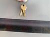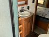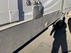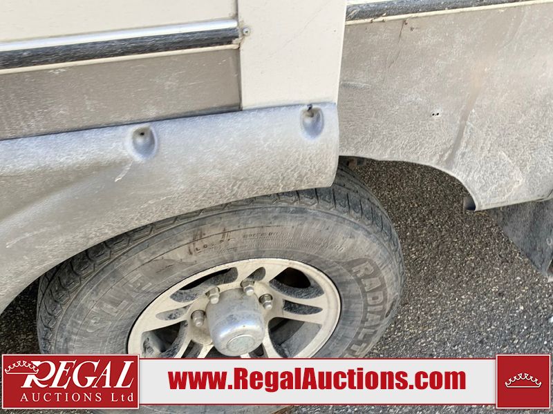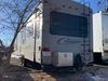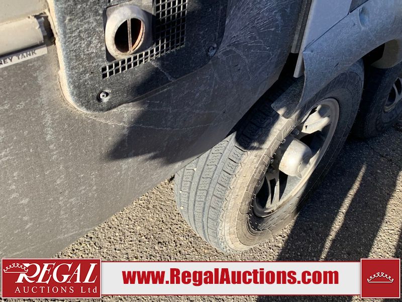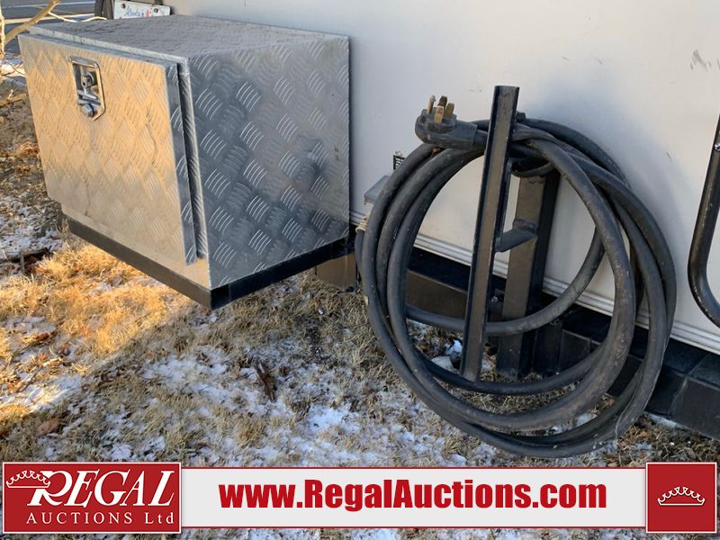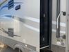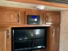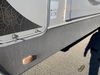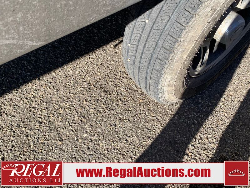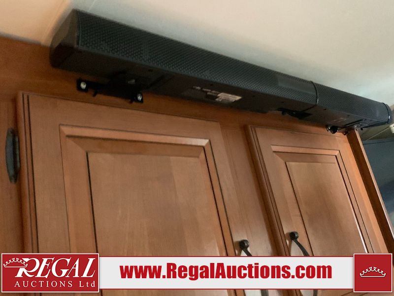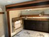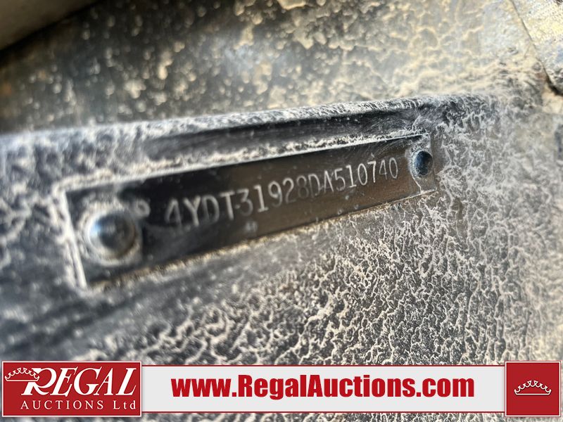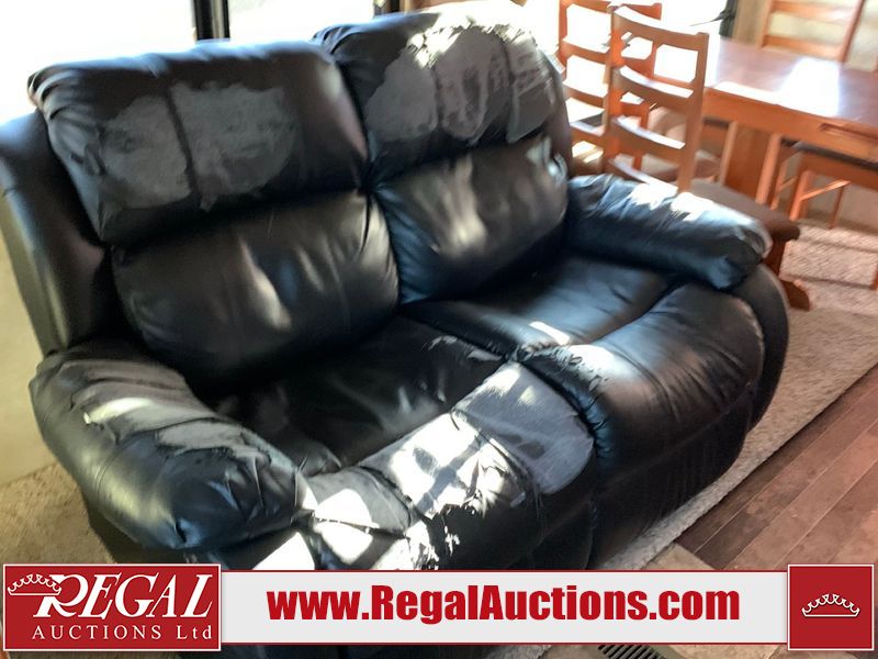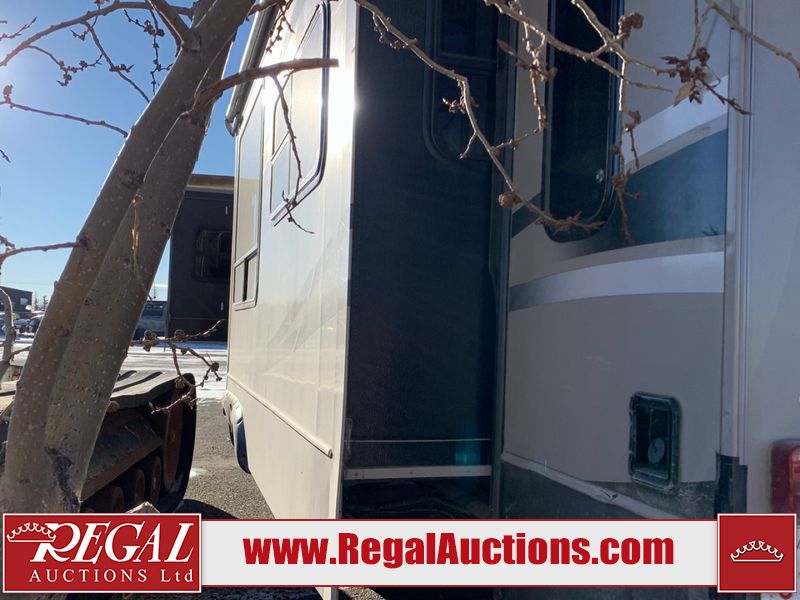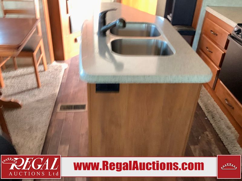 This RV is a 2013 keystone cougar series 319 RLS model bumper pull travel trailer. This unit unit has a single entry door, roof air and three slide outs accommodating the master bedroom, kitchen and living area. Interior is dirty and has a strong odor. The rear seating is missing. The floor, trim, and walls have scratches and scrapes. The rear flooring is peeling. The floor has soft spots. The kitchen cabinets and shelving have drilled holes. The leather seating is worn/torn. the hallway leading to the master bedroom has an aftermarket wall installed. The exterior walls are made of hard wall fiberglass. The propane tank compartment cover is missing. The front wall has chips. Both side walls have scratches and scuffs. Both side walls are showing water delamination. The plastic fenders have missing pieces. The decals are cracked and peeling. This RV is equipped with two batteries. Both propane tanks are missing. Alloy rims are mounted, the tires appear to be in good enough condition for use. This unit is equipped with a three burner stove, top, oven, microwave, refrigerator, flatscreen television, and a stereo system. the layout consists of a master bedroom at the front and a kitchen/living area at the rear.