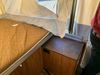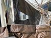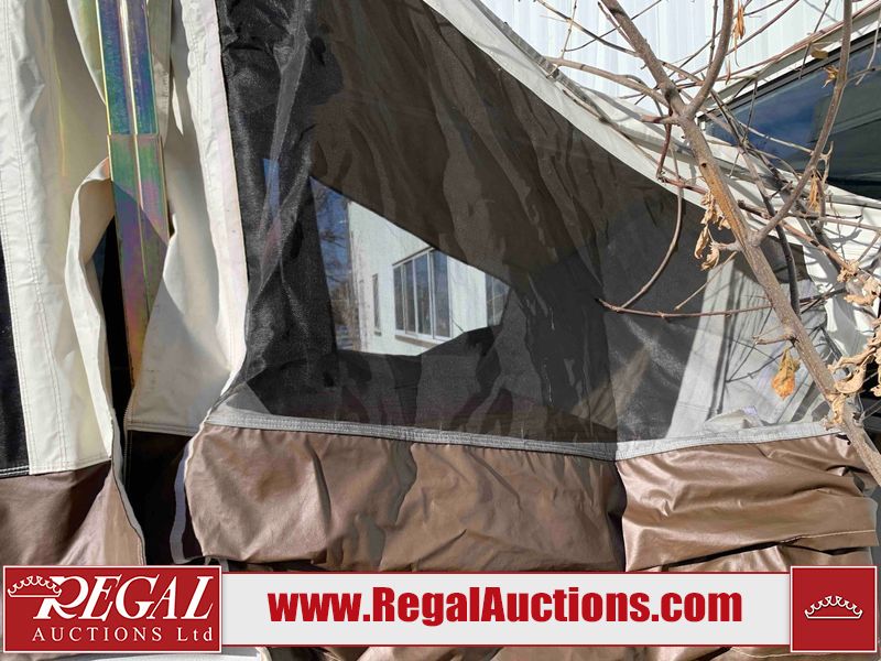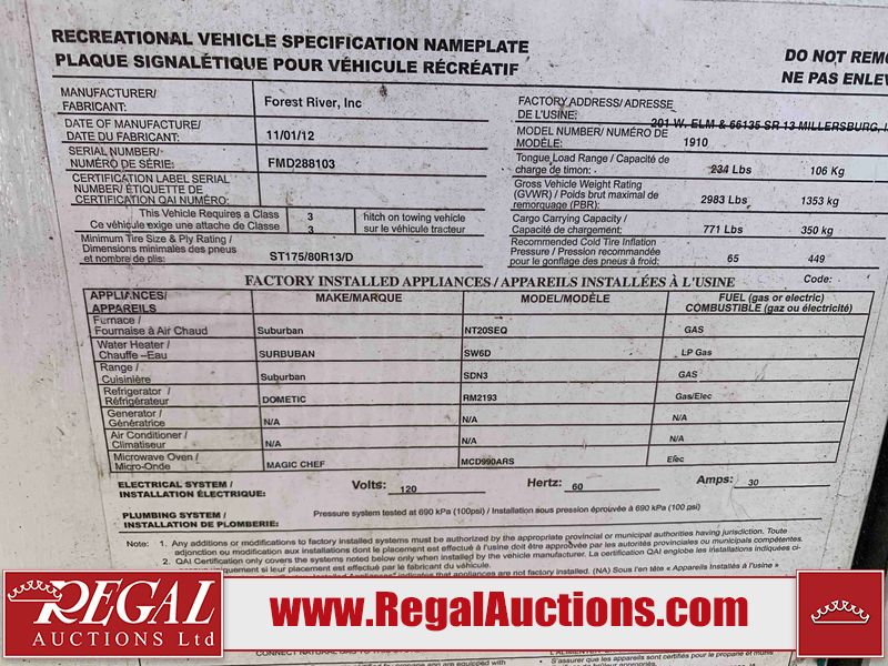 This RV is a 2013 Forest River Rockwood Freedom series 1910 model bumper Pull pop up tent trailer. It has a single door entry. The interior is dirty. All the cushions have dirt and mildew spots. All panels are showing scratches and scuffs. The tent walls are torn. The door cable slide is broken. All panels are showing scratches and scuffs. The left front corner has water damage. The left rear corner is separating. The right fender is cracked. The tires are mounted to steel rims and appear to be in good enough condition for use. This unit is equipped with a battery, and two propane tanks. This unit is equipped with a three burner, stove, top, refrigerator, and a toilet. The layout consist of two slide out beds on either side, and a kitchenette/living area in the center.