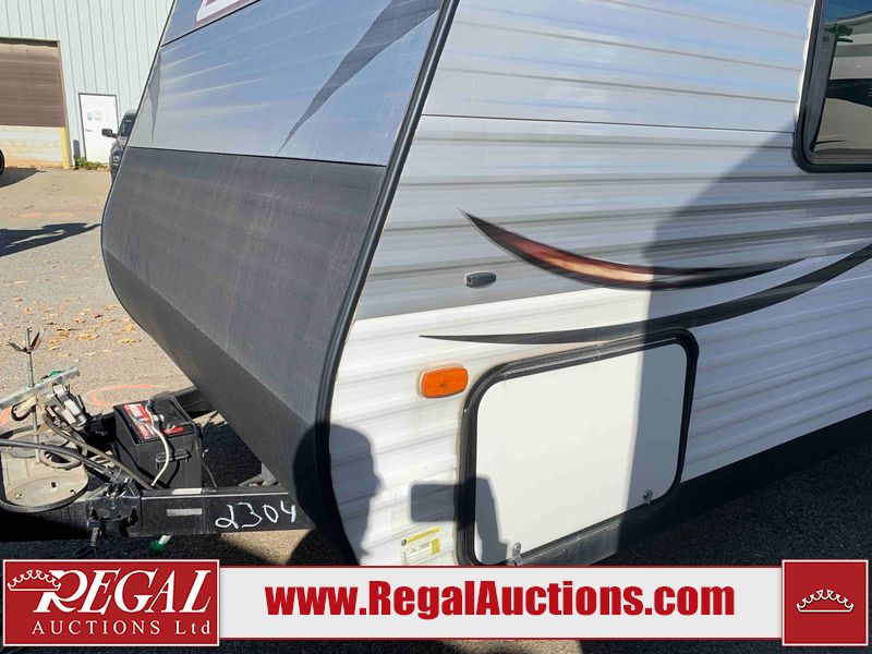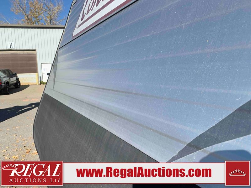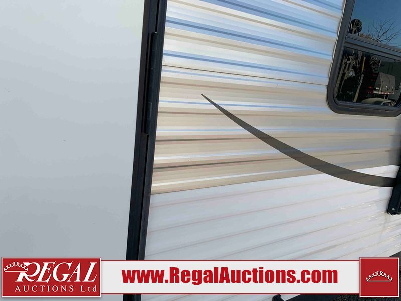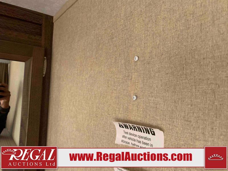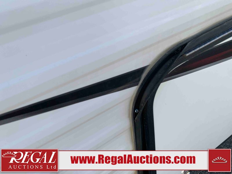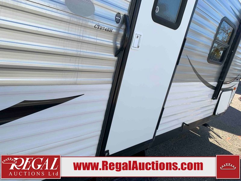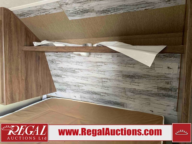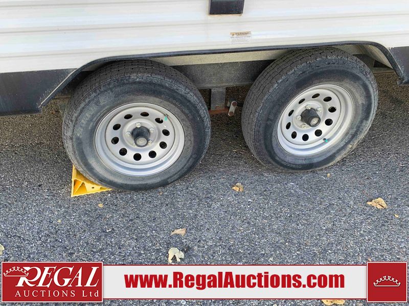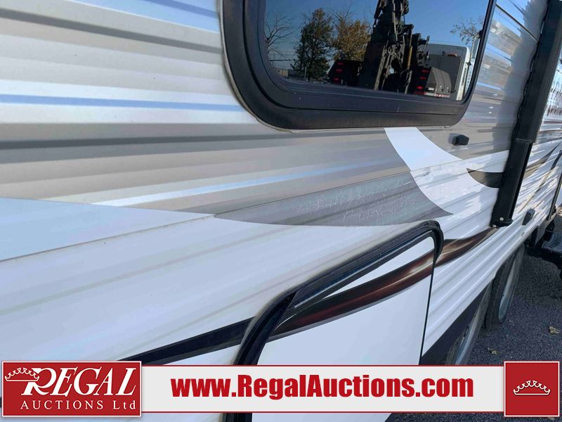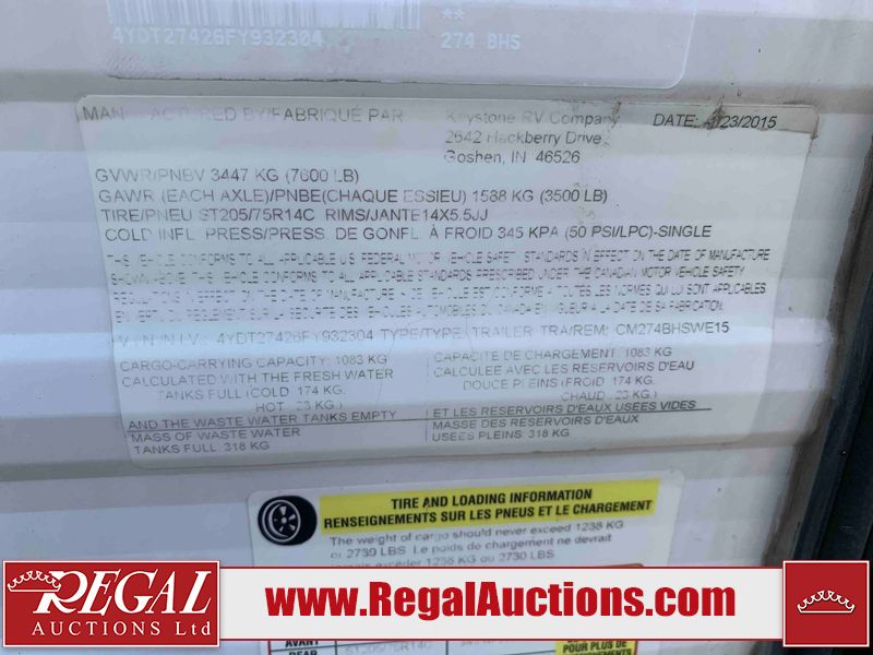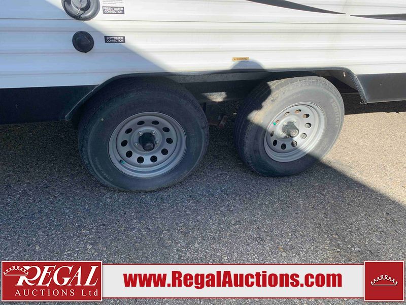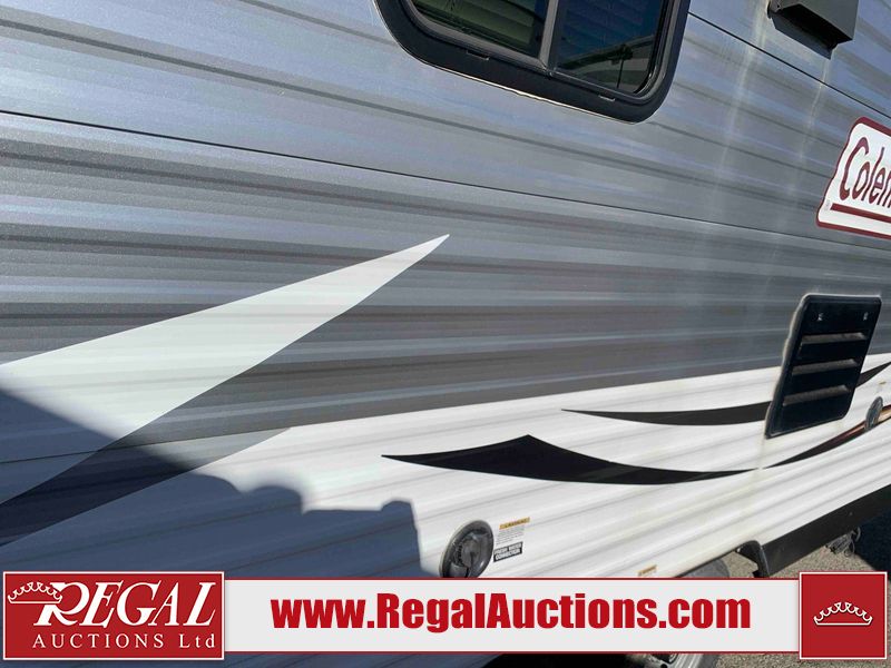 This RV is a 2015 Dutchman Coleman CT 2074BH model tandem axle bumper pull trailer. it has a single door entry, and roof air. The interior is dirty. Some walls show scratches and scuffs. The wallpaper in the master bedroom is peeling. There are two holes in the wall. There are multiple screws in each panel. The couch panel is chipped. The kitchen cabinet and dinette panel are separating. The bathroom sink trim is separating. The exterior walls are made of soft wall aluminum. Most panels are showing scratches and scuffs. The frame has peeling paint. The front, left, and rear wall are showing hail damage. The front left storage cabinet trim is peeling. The right rear wall is gouged. The right rear the right rear storage cabinet trim is peeling. The battery is dead. This unit gets power with external power applied. Both propane tanks are missing. The tires are mounted to alloy rims and appear to be in good enough condition for use. This unit is equipped with a refrigerator, microwave, three burner stove top, oven, and a battery.