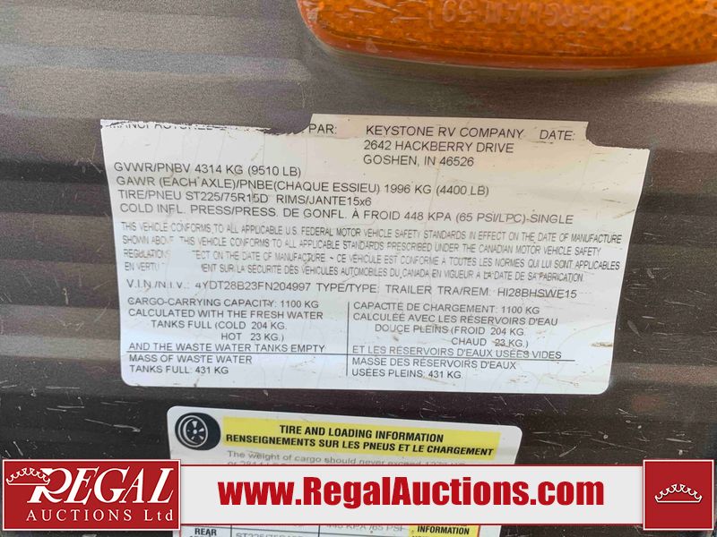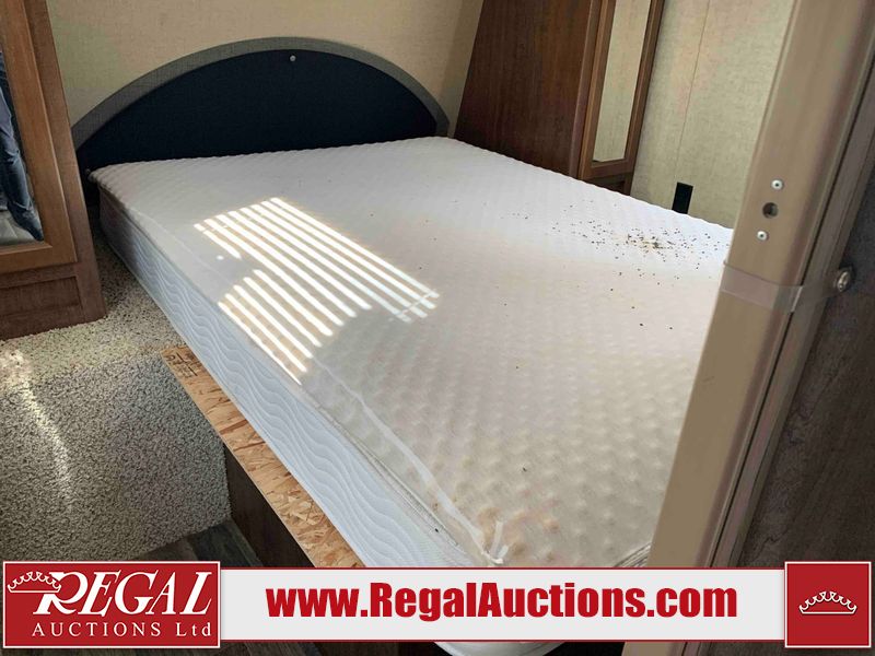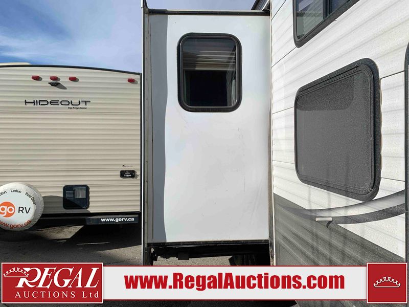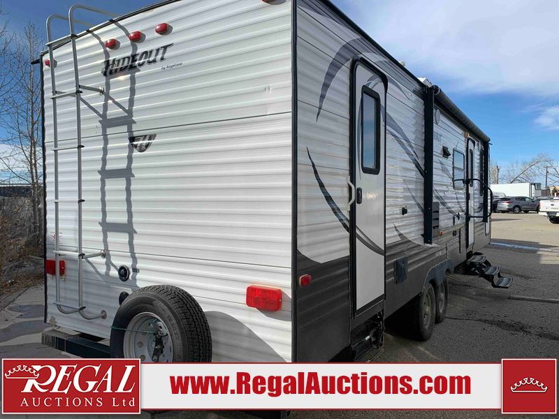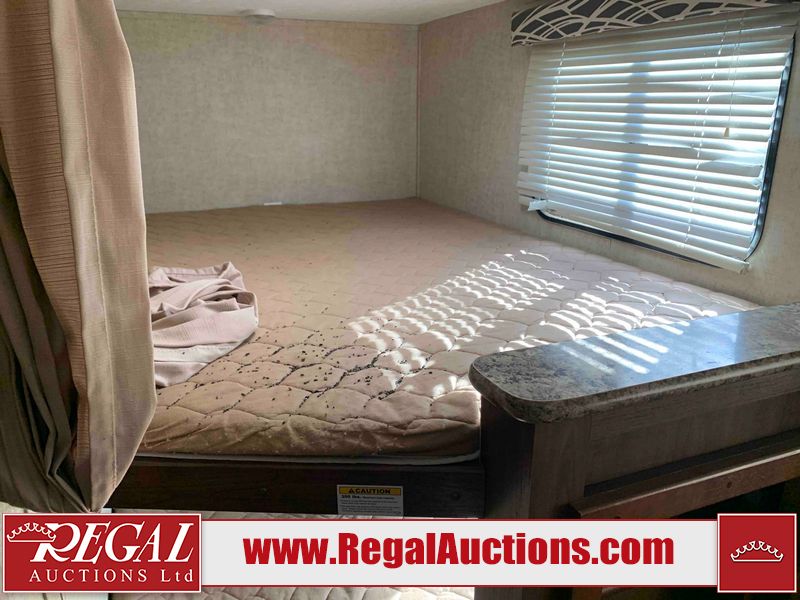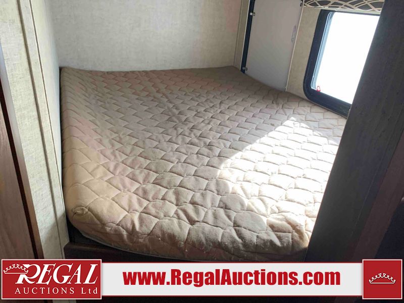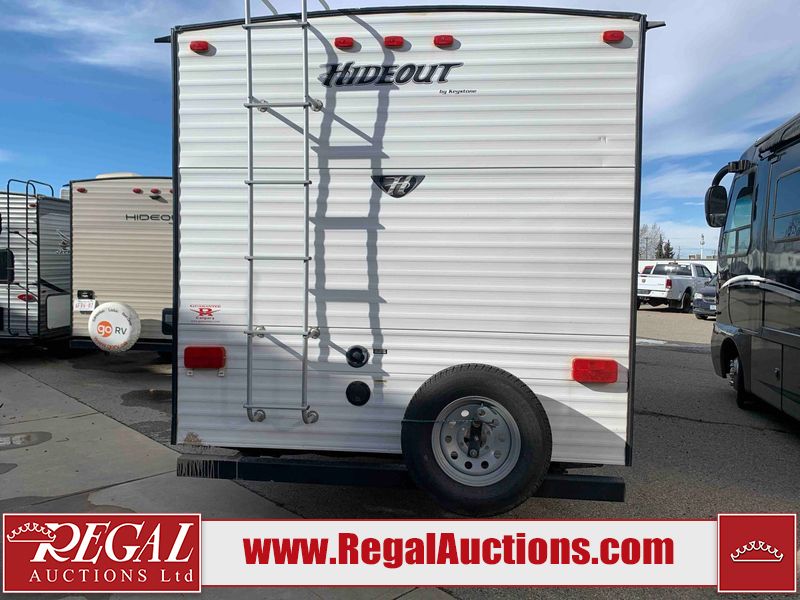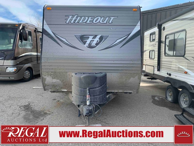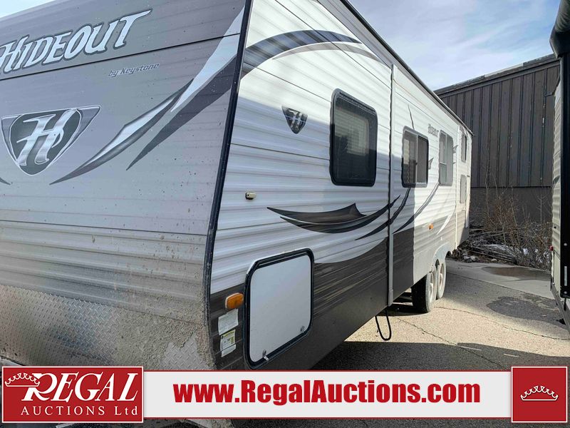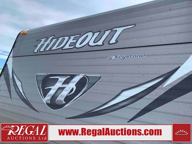 This 32' RV is a 2015 Keystone RV Hideout Series 28BHSWE model bumper pull travel trailer. It has two entry doors, roof air and a single slide out accommodating the living area. There is severe rodent activity throughout the entire trailer. The wood trims are showing scratches and scuffs. The exterior walls are made of soft wall aluminum. The front checker plate has dents. Both side walls and rear wall have dents and scratches. The curb side wall has hail damage. The slide out weather stripping is peeling. The decals are cracked. This unit comes with two batteries and two propane tanks. The tires have been mounted to steel rims and appear to be in good enough condition for use. It is equipped with a stereo system, flat screen television, three burner stove top, microwave, oven and refrigerator. The layout consists of a master bedroom at the front, kitchen/living area in the centre and bunkhouse/bathroom at the rear.