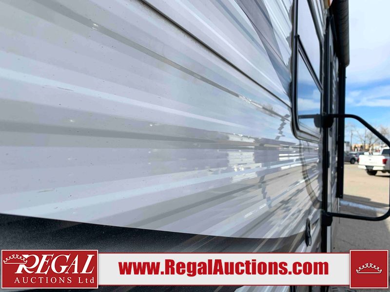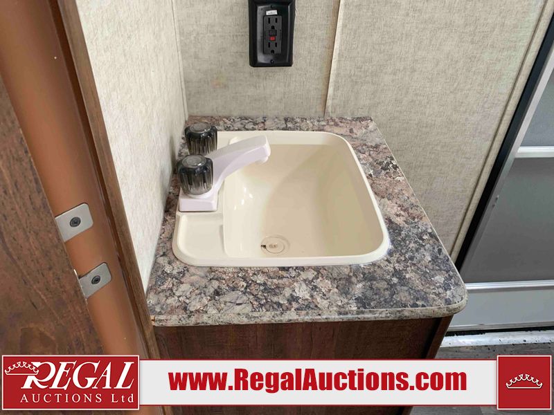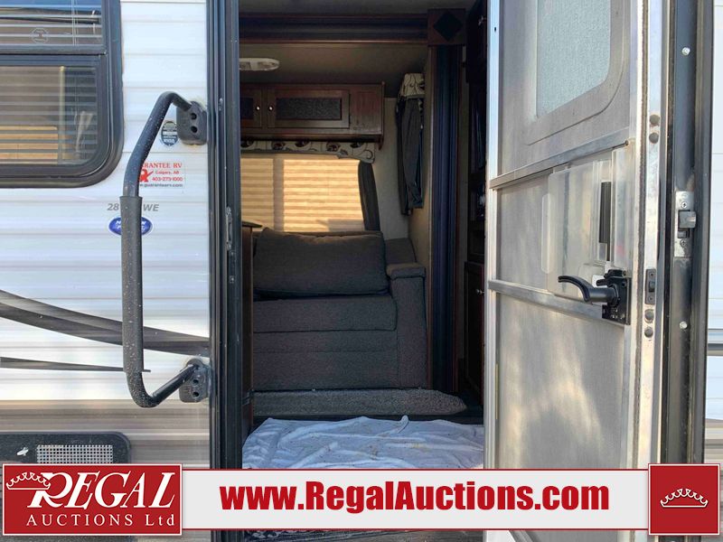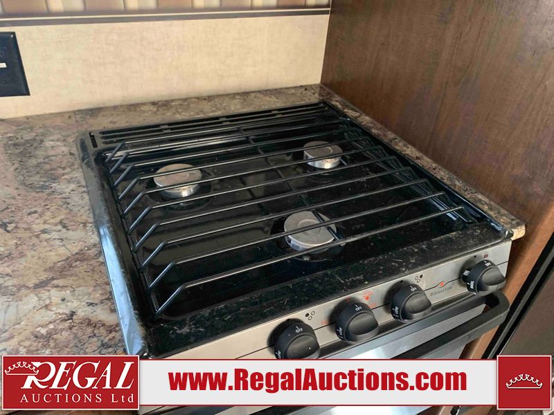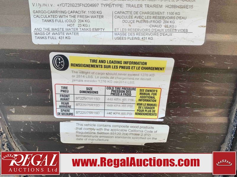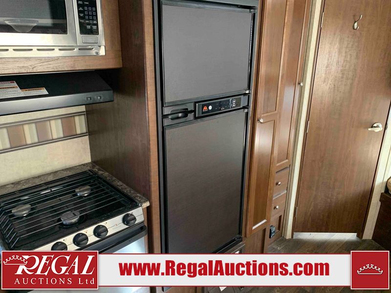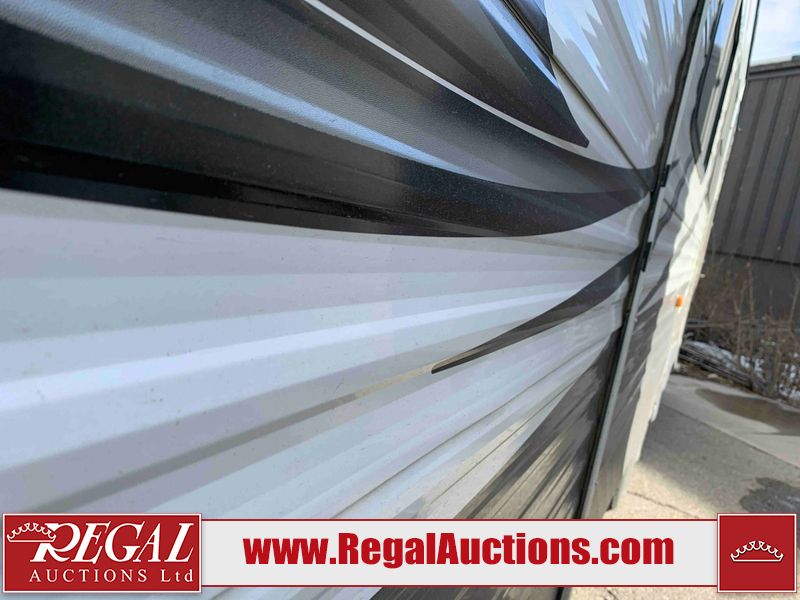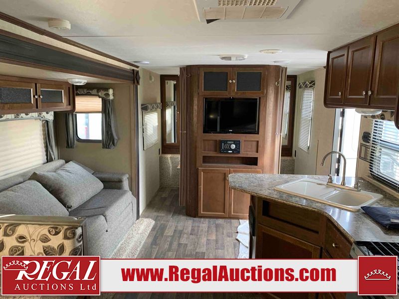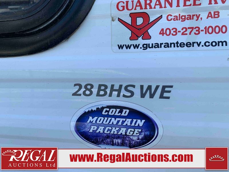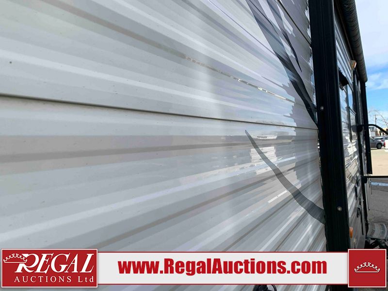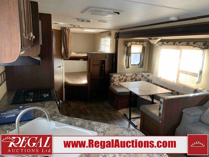 This 32' RV is a 2015 Keystone RV Hideout Series 28BHSWE model bumper pull travel trailer. It has two entry doors, roof air and a single slide out accommodating the living area. There is severe rodent activity throughout the entire trailer. The wood trims are showing scratches and scuffs. The exterior walls are made of soft wall aluminum. The front checker plate has dents. Both side walls and rear wall have dents and scratches. The curb side wall has hail damage. The slide out weather stripping is peeling. The decals are cracked. This unit comes with two batteries and two propane tanks. The tires have been mounted to steel rims and appear to be in good enough condition for use. It is equipped with a stereo system, flat screen television, three burner stove top, microwave, oven and refrigerator. The layout consists of a master bedroom at the front, kitchen/living area in the centre and bunkhouse/bathroom at the rear.