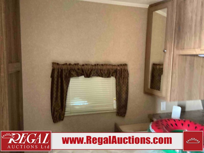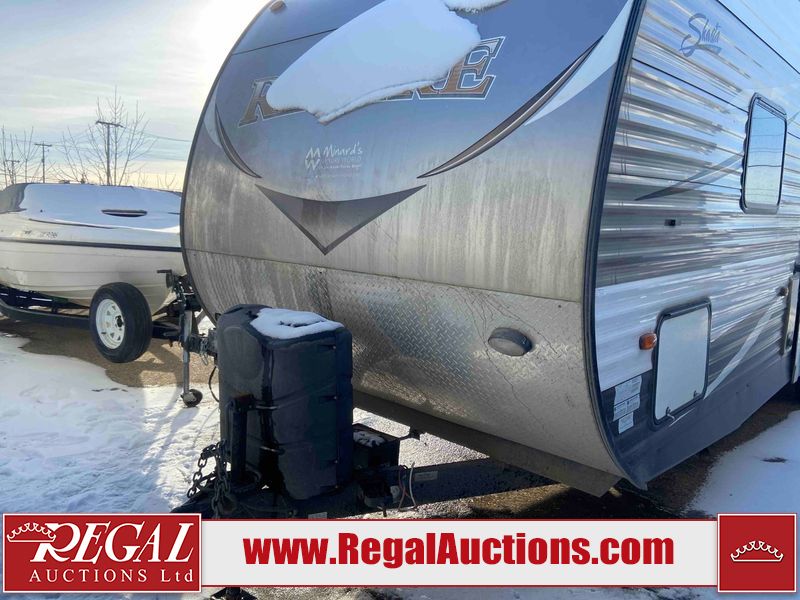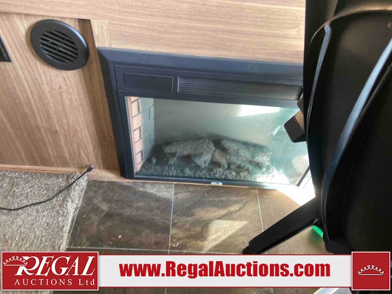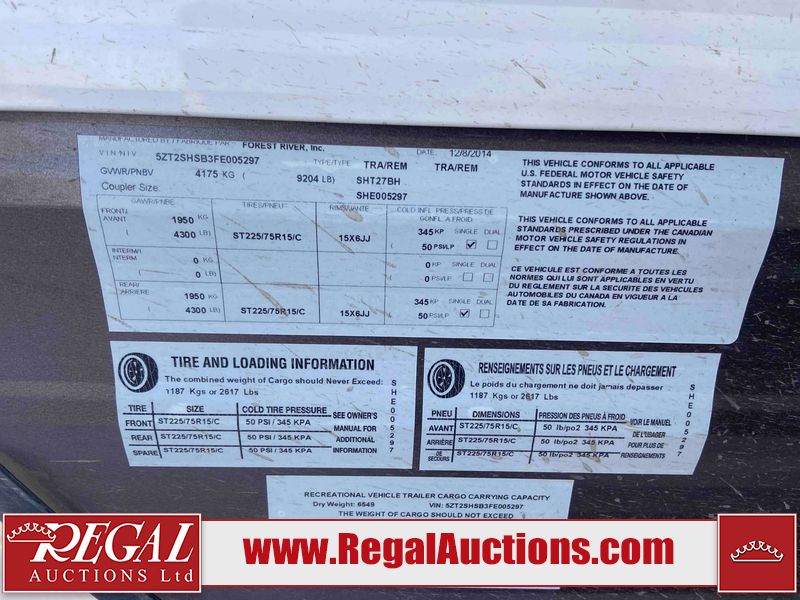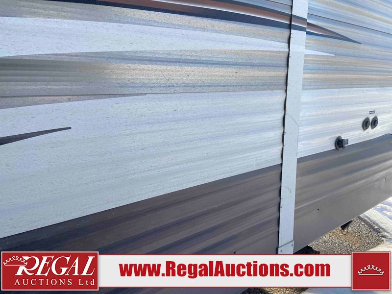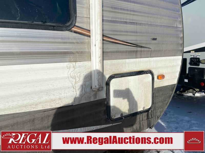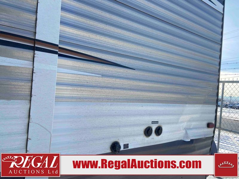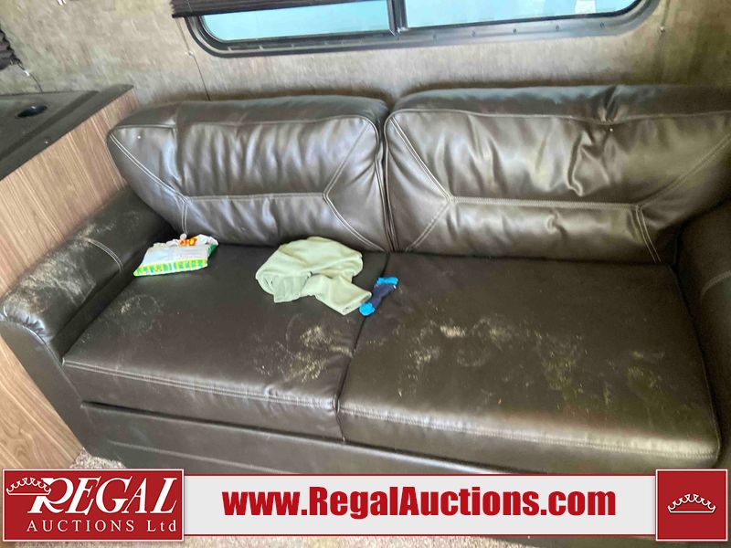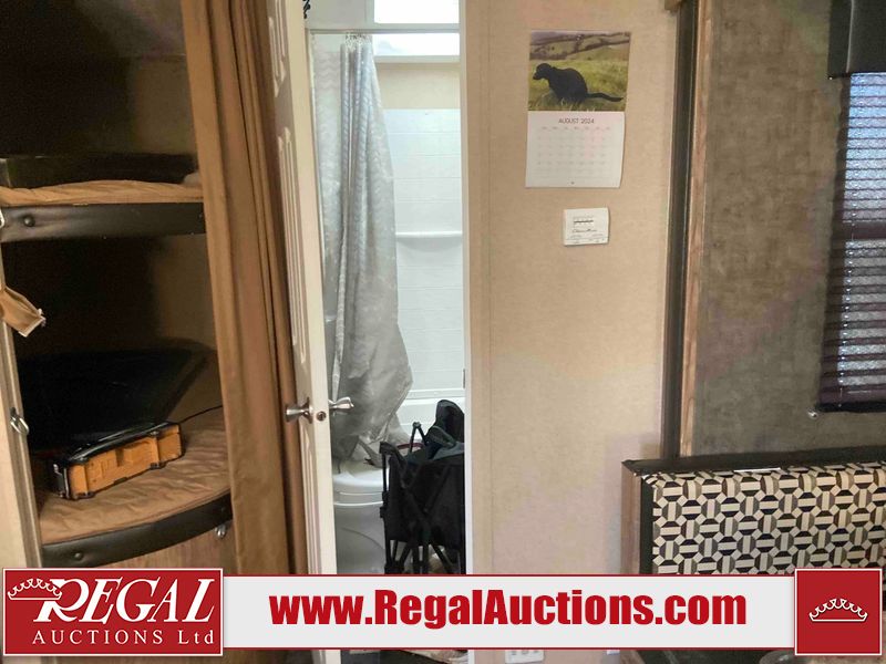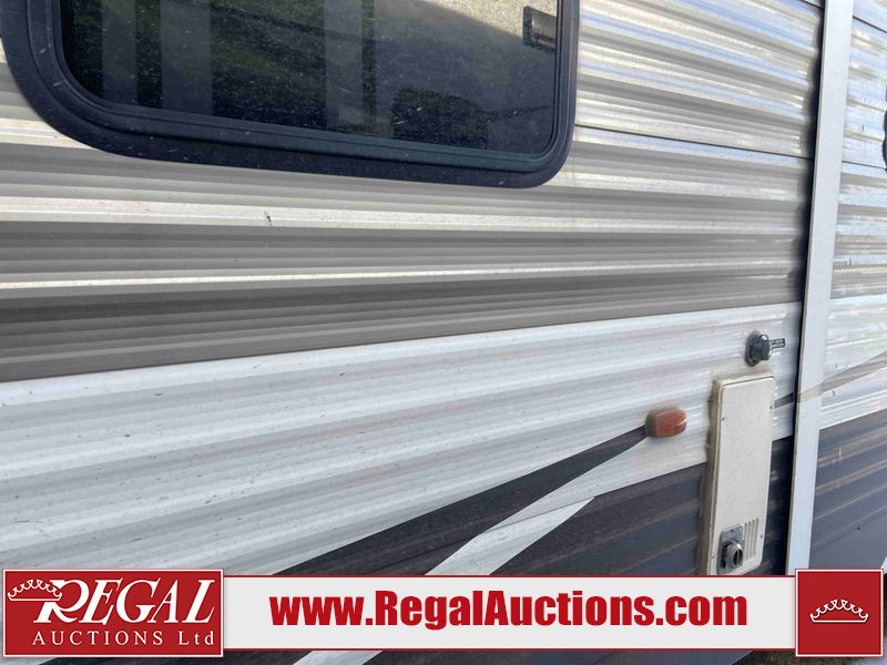 This RV is a 2015 Shasta Rivere Series 27BH model tandem axle bumper pole trailer. It has a single door entry, roof, air, and a single slide out accommodating the living area. Interior is dirty. Some walls are showing scratches and scuffs. The television wall is chipped. The bathroom sky fan is cracked. The ceiling plastics are cracked. Exterior walls are made of hard wall fiberglass. The front wall is cracked. The left wall is dented. The left fender is cracked. The left rear wall is dented. The rear bumper is dented. It gets power with external power applied. The battery is dead. The tires are mounted alloy rims, and appear being good enough condition for use. This unit is equipped with a stereo system, electrical fireplace, refrigerator, microwave, three burner, stove, top, oven, television, exterior prep station, and a solar panel. The layout consists of a master bedroom in the front, kitchenette/dinette in the center, and a bathroom/bunkhouse in the rear.