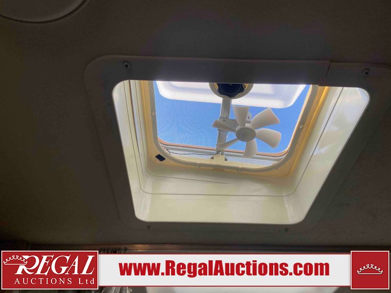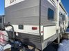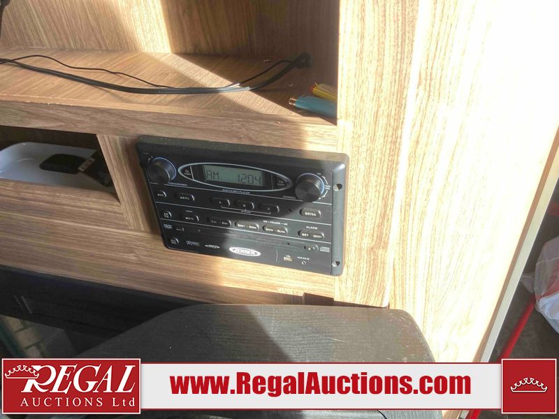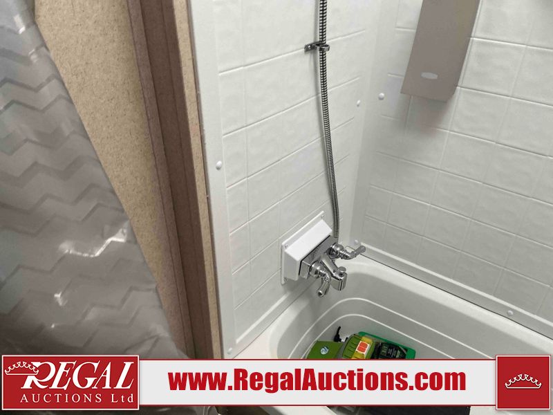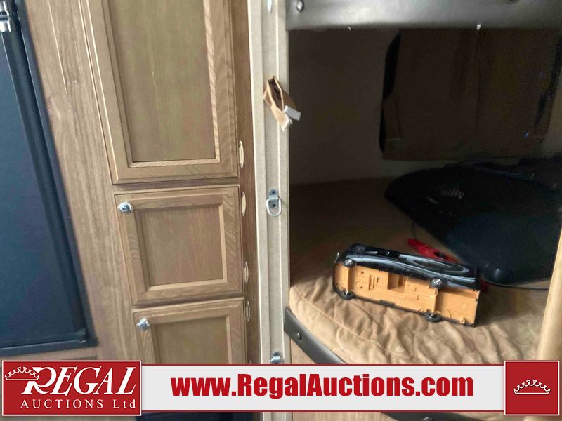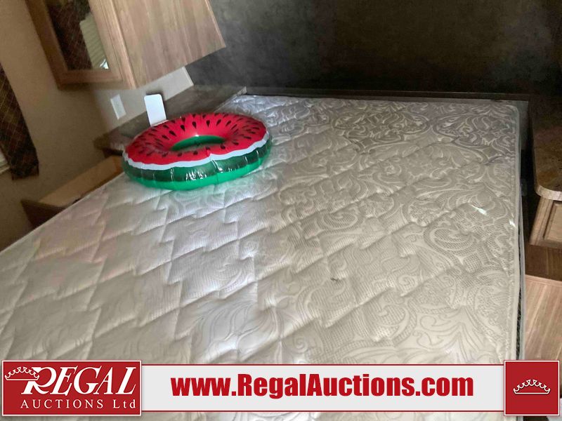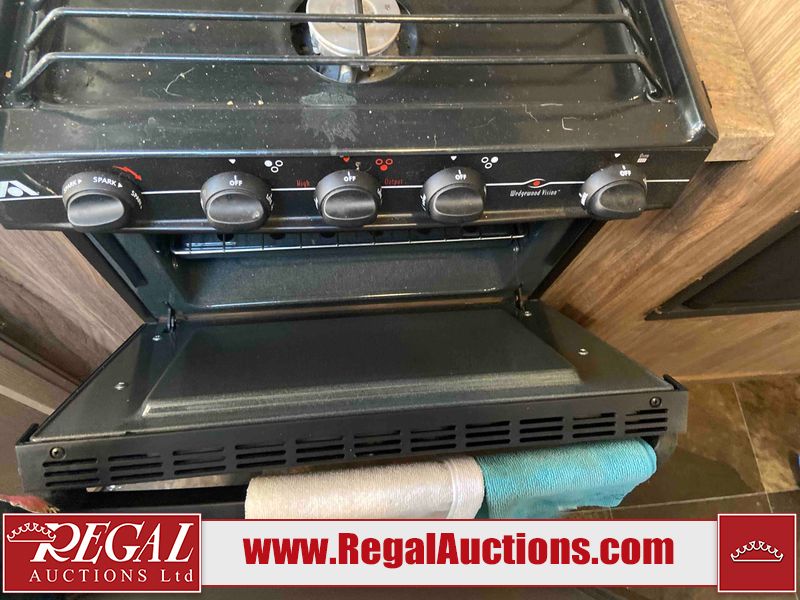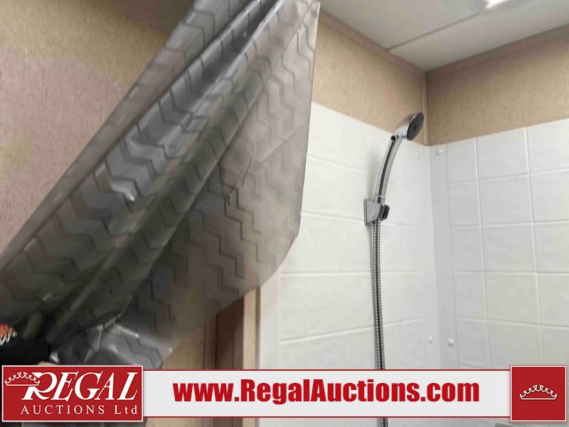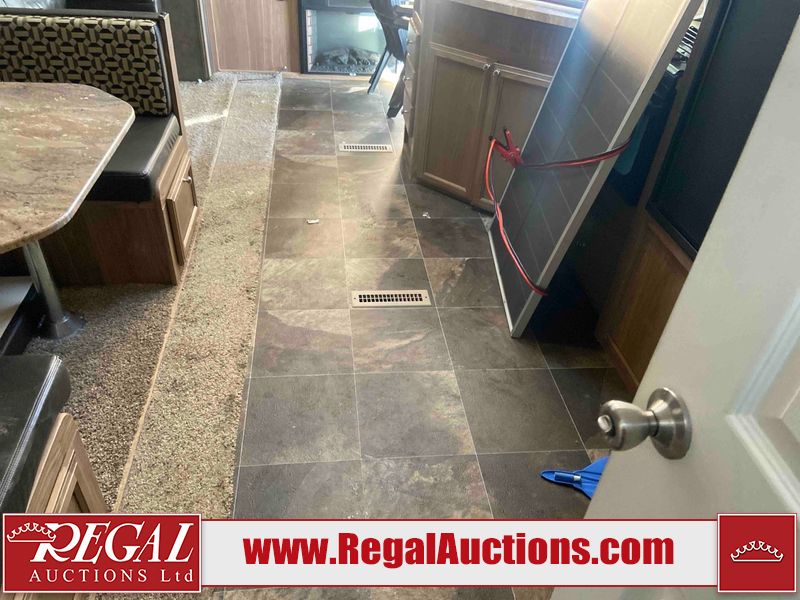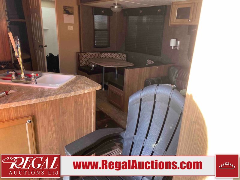 This RV is a 2015 Shasta Rivere Series 27BH model tandem axle bumper pole trailer. It has a single door entry, roof, air, and a single slide out accommodating the living area. Interior is dirty. Some walls are showing scratches and scuffs. The television wall is chipped. The bathroom sky fan is cracked. The ceiling plastics are cracked. Exterior walls are made of hard wall fiberglass. The front wall is cracked. The left wall is dented. The left fender is cracked. The left rear wall is dented. The rear bumper is dented. It gets power with external power applied. The battery is dead. The tires are mounted alloy rims, and appear being good enough condition for use. This unit is equipped with a stereo system, electrical fireplace, refrigerator, microwave, three burner, stove, top, oven, television, exterior prep station, and a solar panel. The layout consists of a master bedroom in the front, kitchenette/dinette in the center, and a bathroom/bunkhouse in the rear.