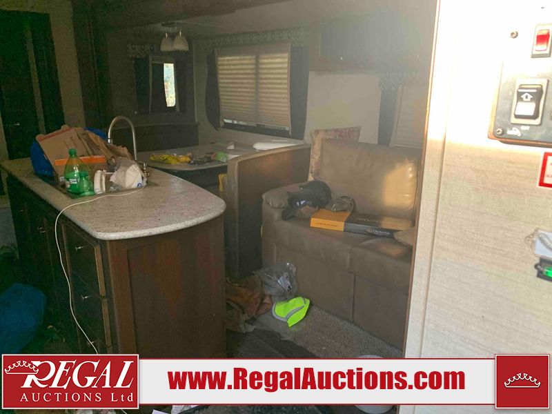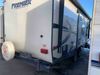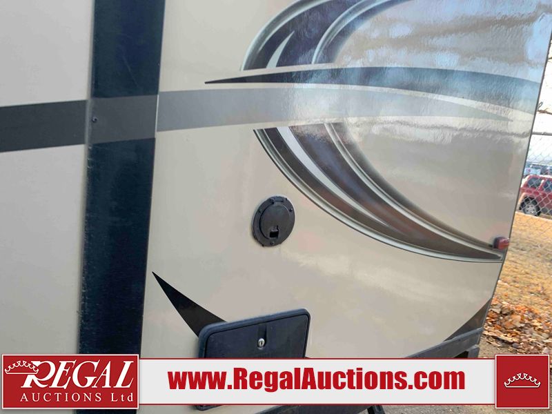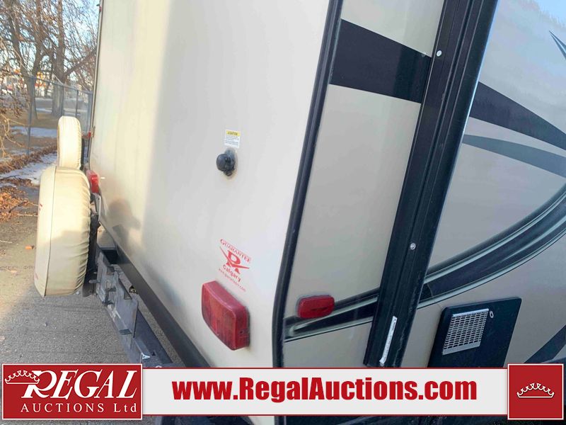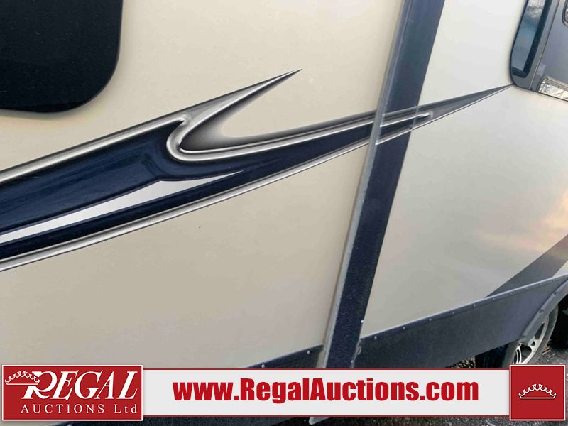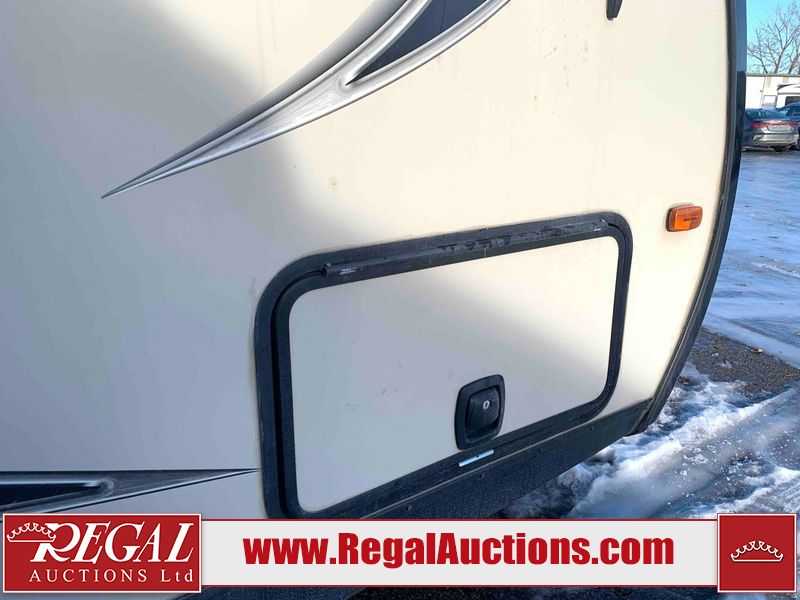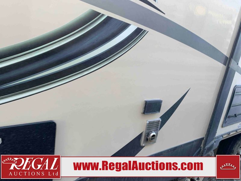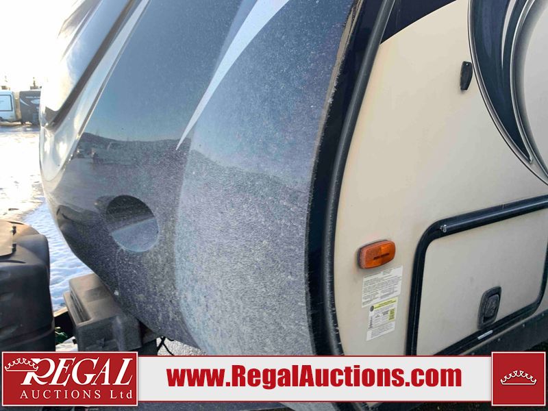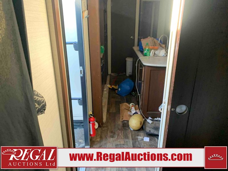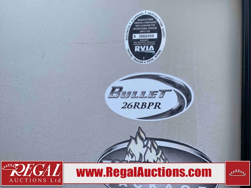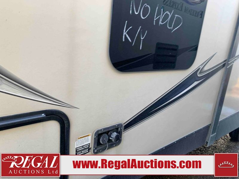This RV is a 2016 Keystone bullet premier 26RBPR model Tale bumper pull travel trailer. It has a single door entry, roof air, and two slide outs accommodating the living area. The interior is dirty. Some walls are showing scratches and scuffs. The master bed is torn. The ceiling fan is broken. Exterior walls are made of hard wall fiberglass. All walls are sewing scratches and scuffs. The left, rear, and right walls are showing water delamination. The right wall is cracked. The right fender is broken. The left wall slide out does not open all the way, diagnostics will need to be performed to determine its exact issues. This unit is equipped with two batteries, and is missing both propane tanks. The tires are mounted to alloy rims and appear to be in good enough condition for use. This unit is equipped with two televisions, microwave, refrigerator, three burner stove top, oven, and a stereo system. The layout consists of a master bedroom in the front, a kitchenette/dinette in the center, and a bathroom in the rear.