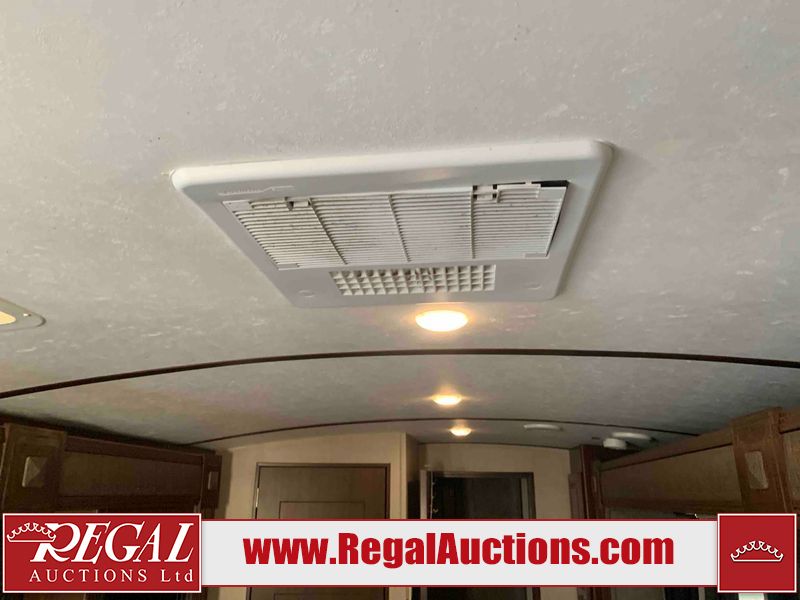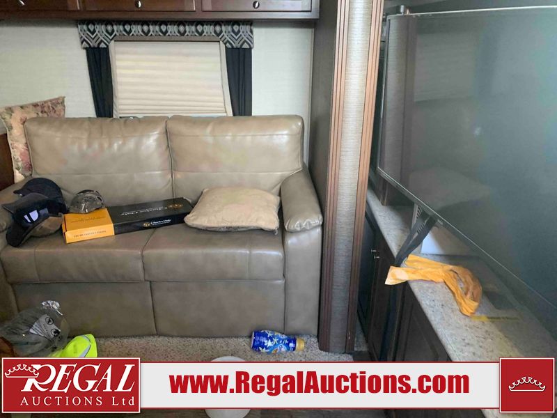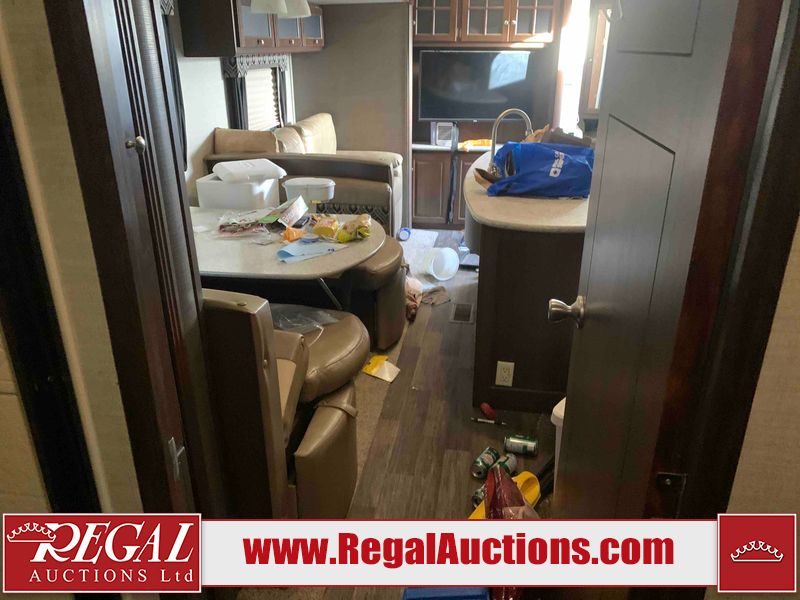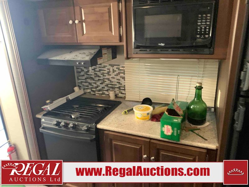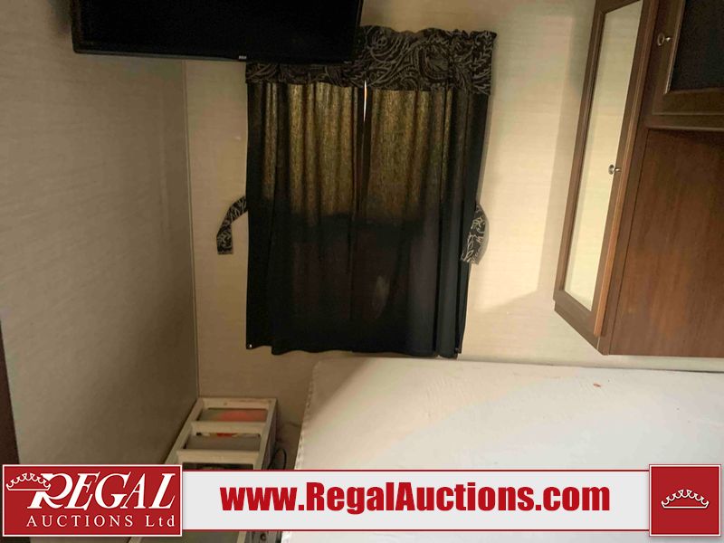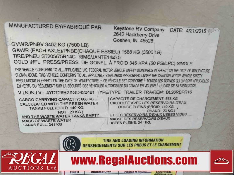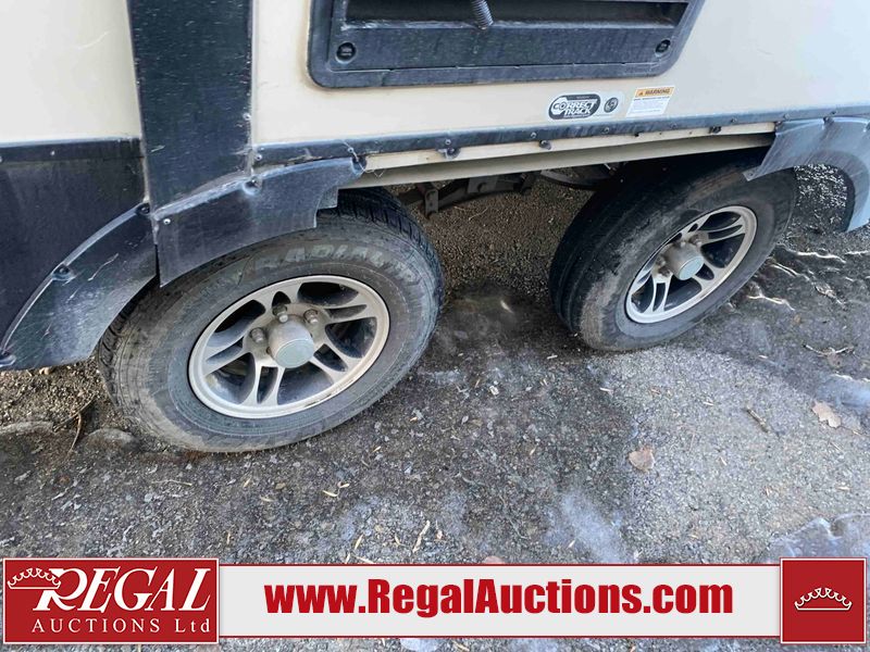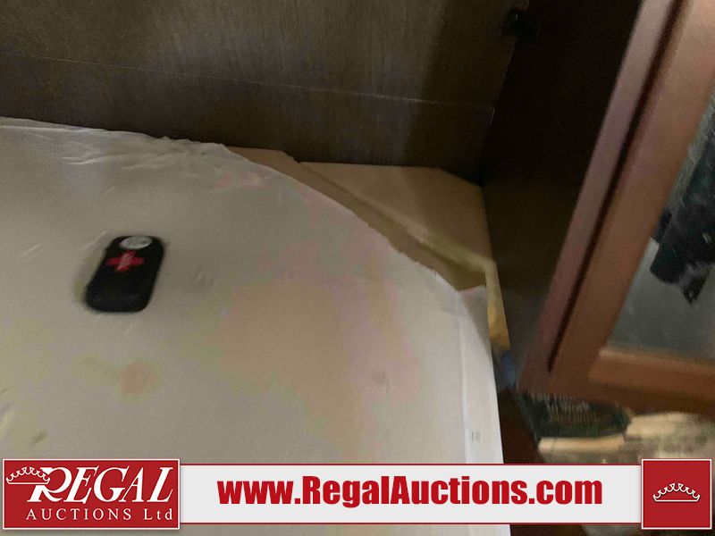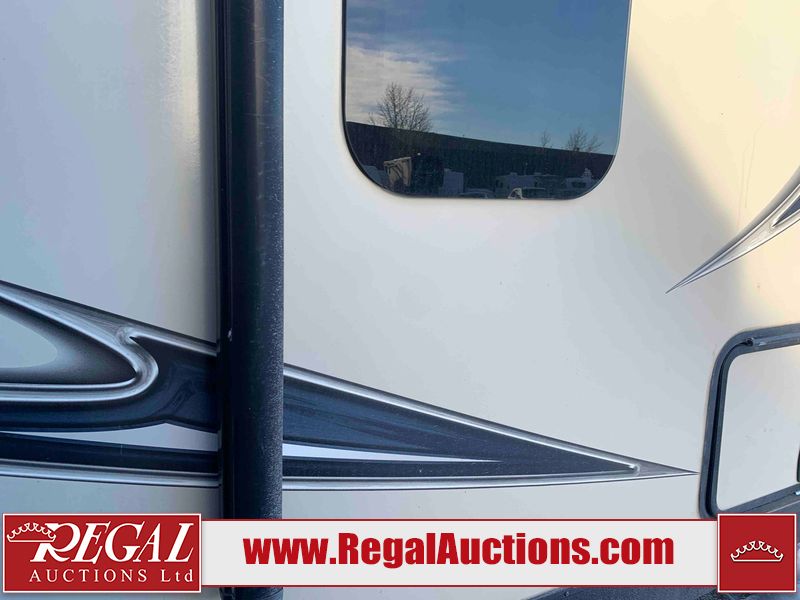 This RV is a 2016 Keystone bullet premier 26RBPR model Tale bumper pull travel trailer. It has a single door entry, roof air, and two slide outs accommodating the living area. The interior is dirty. Some walls are showing scratches and scuffs. The master bed is torn. The ceiling fan is broken. Exterior walls are made of hard wall fiberglass. All walls are sewing scratches and scuffs. The left, rear, and right walls are showing water delamination. The right wall is cracked. The right fender is broken. The left wall slide out does not open all the way, diagnostics will need to be performed to determine its exact issues. This unit is equipped with two batteries, and is missing both propane tanks. The tires are mounted to alloy rims and appear to be in good enough condition for use. This unit is equipped with two televisions, microwave, refrigerator, three burner stove top, oven, and a stereo system. The layout consists of a master bedroom in the front, a kitchenette/dinette in the center, and a bathroom in the rear.