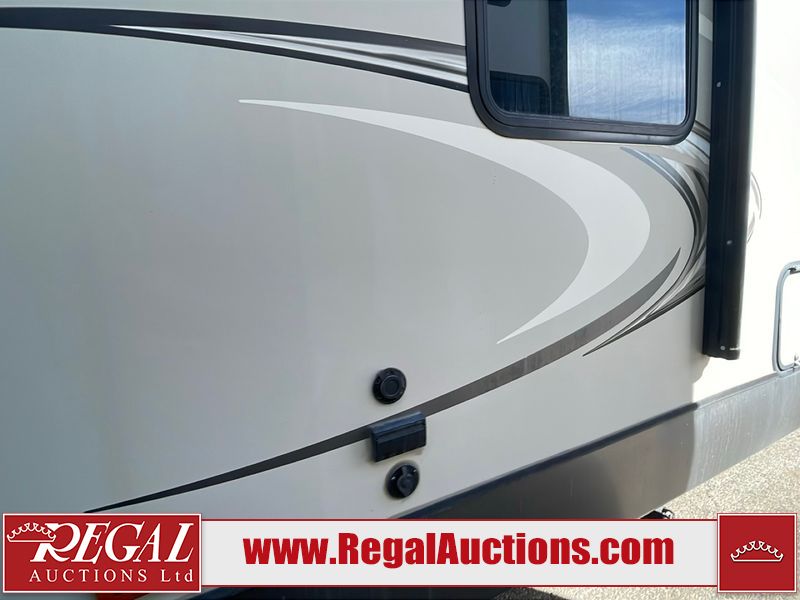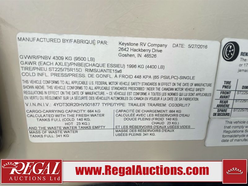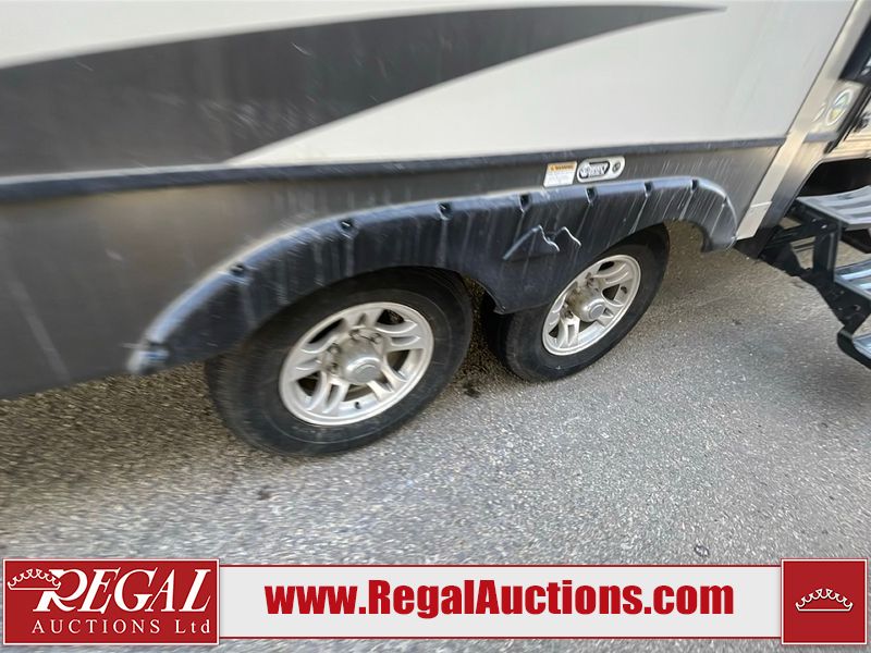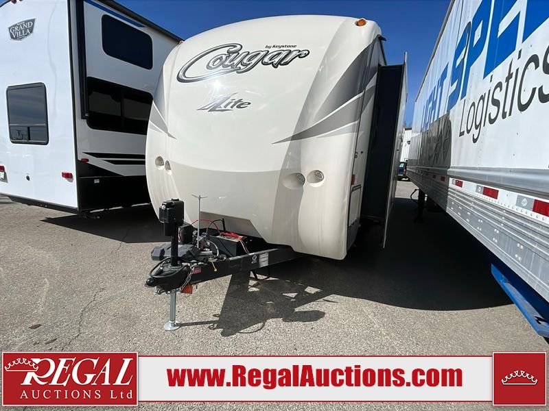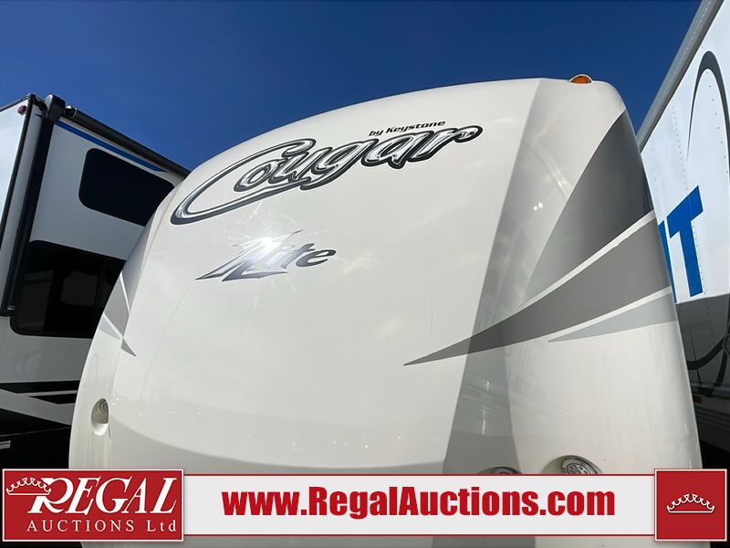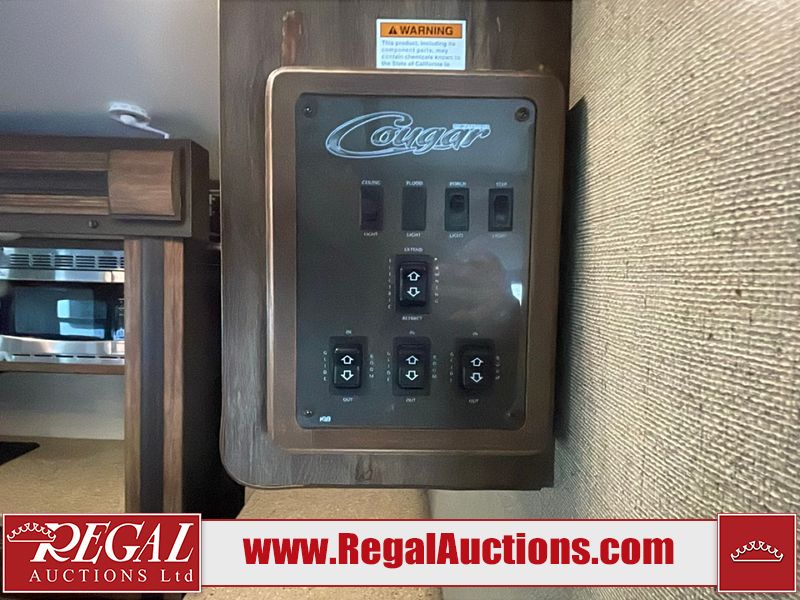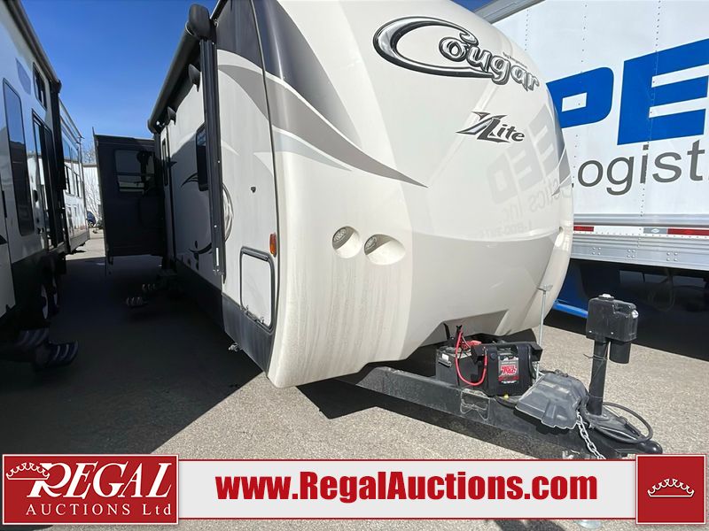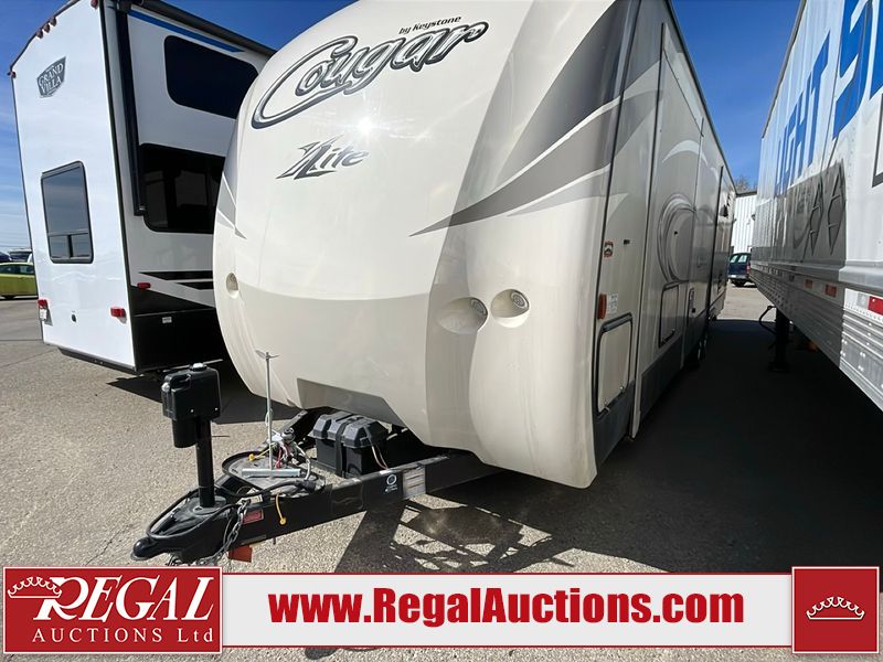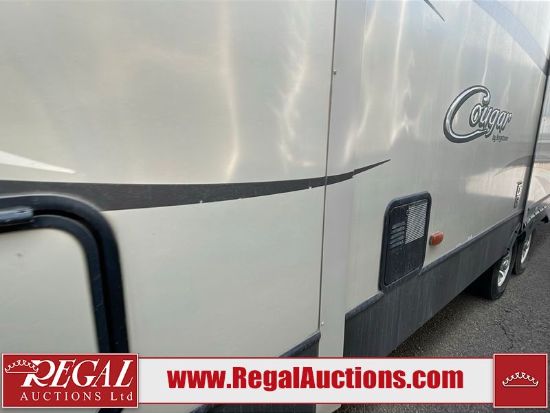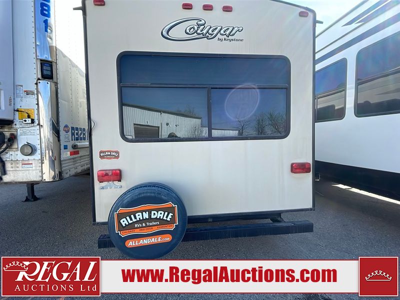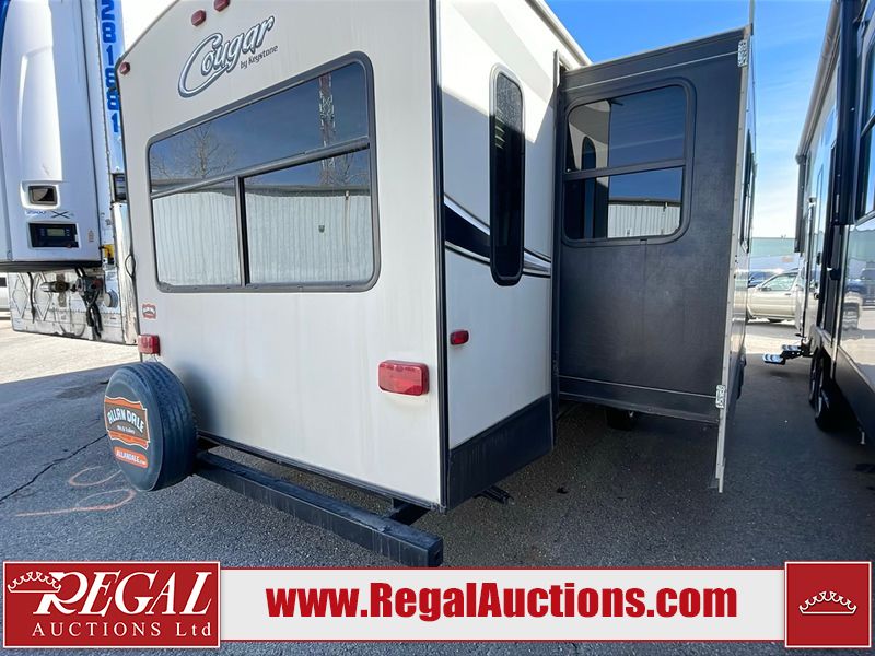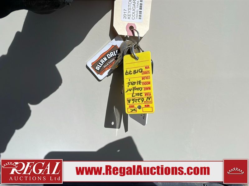 This unit is a 2017 Keystone cougar 30RLI model tandem axle bumper pull trailer. It has a single door entry, roof air, and three slide outs accommodating the living area. The floor has a soft spot by the water pump from an old leak. The interior is clean. Some walls are showing scratches and scuffs. The mattress sustained. The exterior walls are made of hard wall fiberglass. The front end is showing chips. Some walls are showing scratches and scuffs. The right wall is showing water delamination. This unit is equipped with a battery. Both propane tanks are missing. The tires are mounted to alloy rims and appeared to be in good enough condition for use. This unit is cooked with a refrigerator, microwave, three burner stove, top, oven, television, stereo system, and a electrical fireplace. The layout consists of a master bedroom/bathroom in the front, and a kitchenette/living area in the rear.