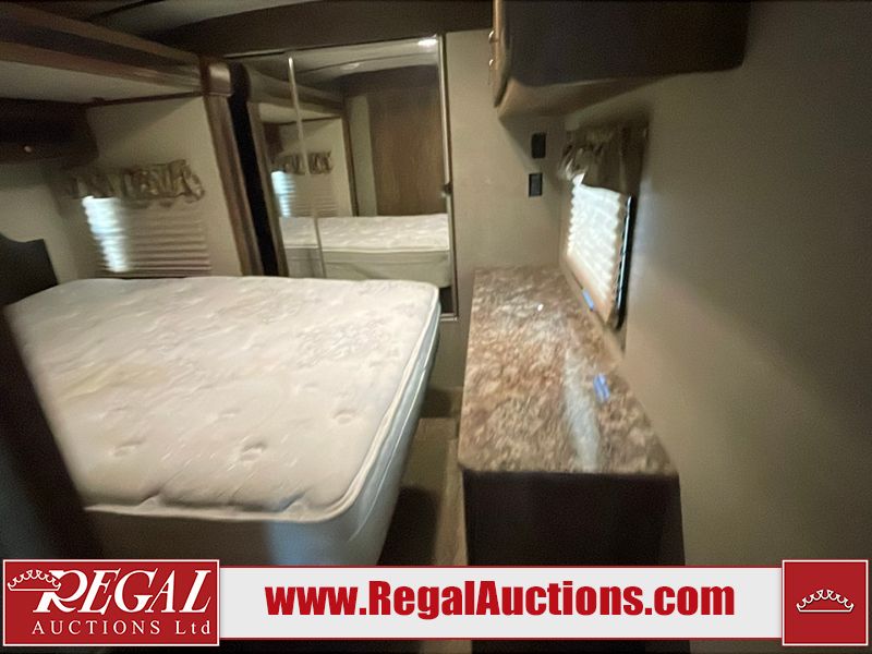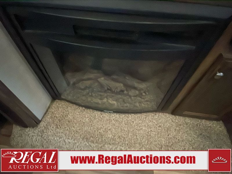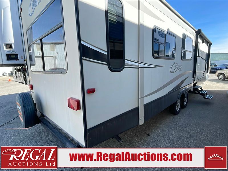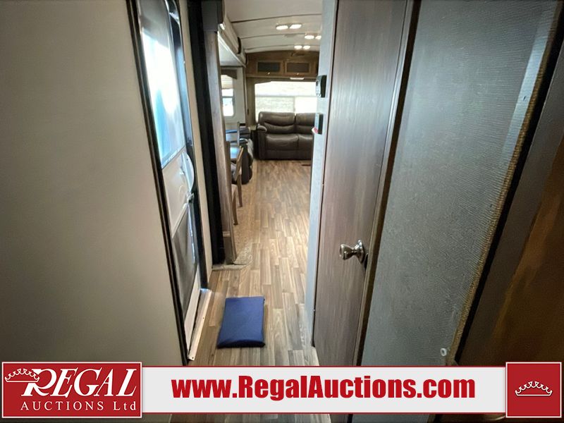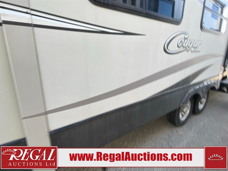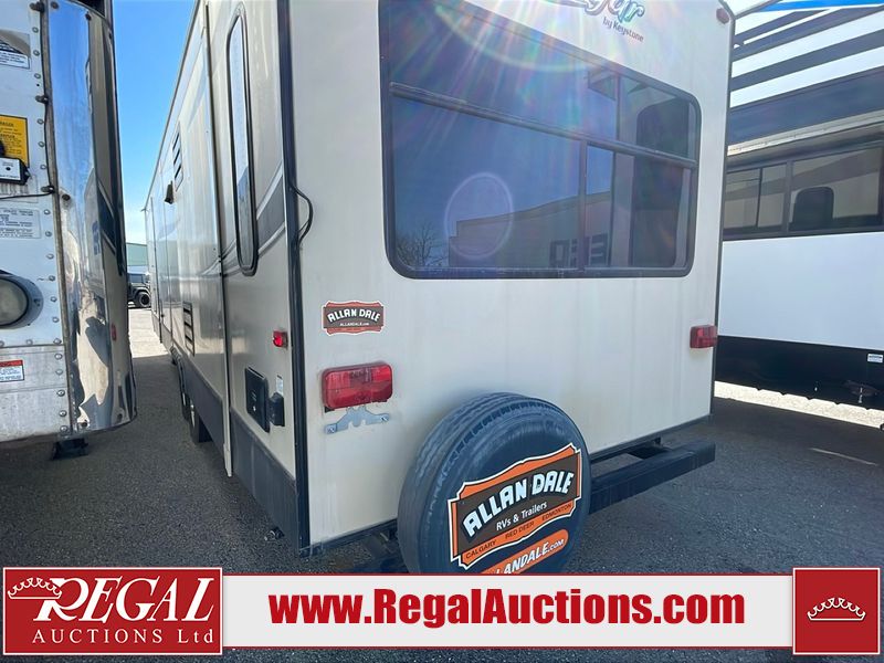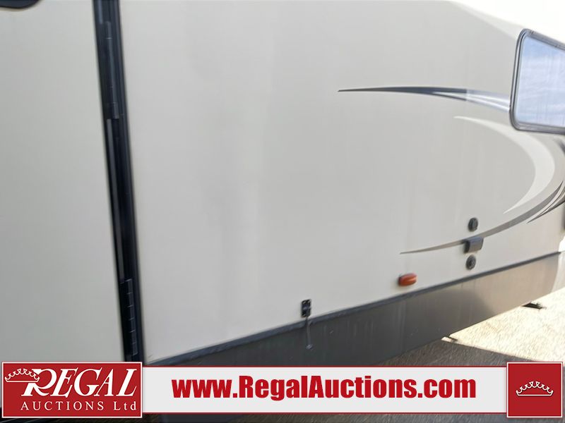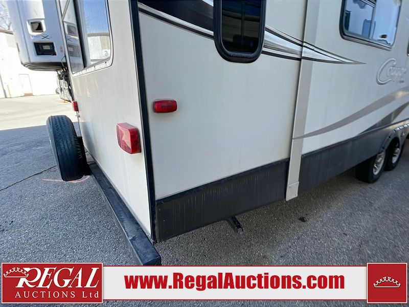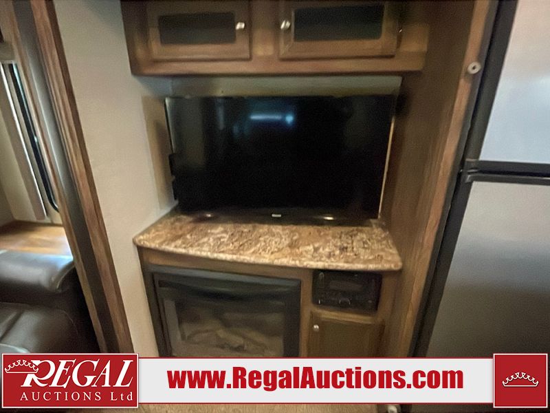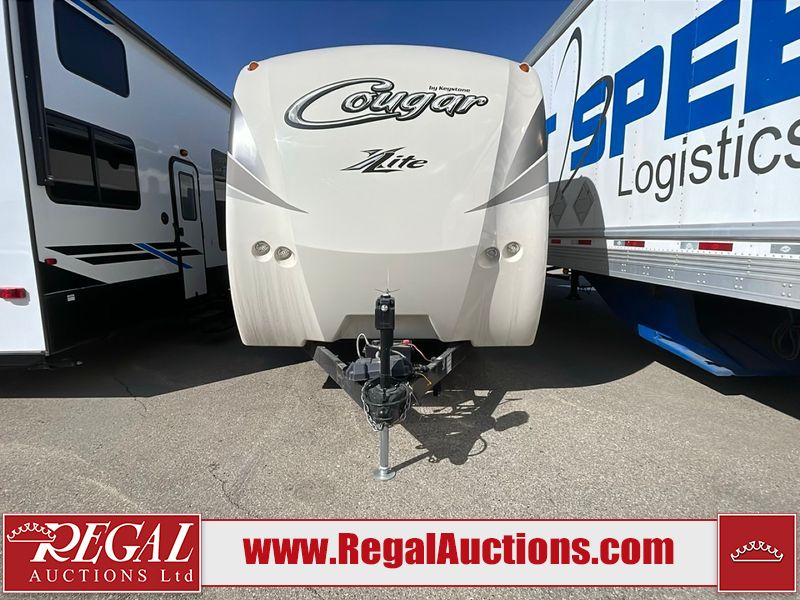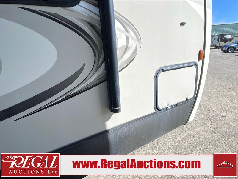 This unit is a 2017 Keystone cougar 30RLI model tandem axle bumper pull trailer. It has a single door entry, roof air, and three slide outs accommodating the living area. The floor has a soft spot by the water pump from an old leak. The interior is clean. Some walls are showing scratches and scuffs. The mattress sustained. The exterior walls are made of hard wall fiberglass. The front end is showing chips. Some walls are showing scratches and scuffs. The right wall is showing water delamination. This unit is equipped with a battery. Both propane tanks are missing. The tires are mounted to alloy rims and appeared to be in good enough condition for use. This unit is cooked with a refrigerator, microwave, three burner stove, top, oven, television, stereo system, and a electrical fireplace. The layout consists of a master bedroom/bathroom in the front, and a kitchenette/living area in the rear.