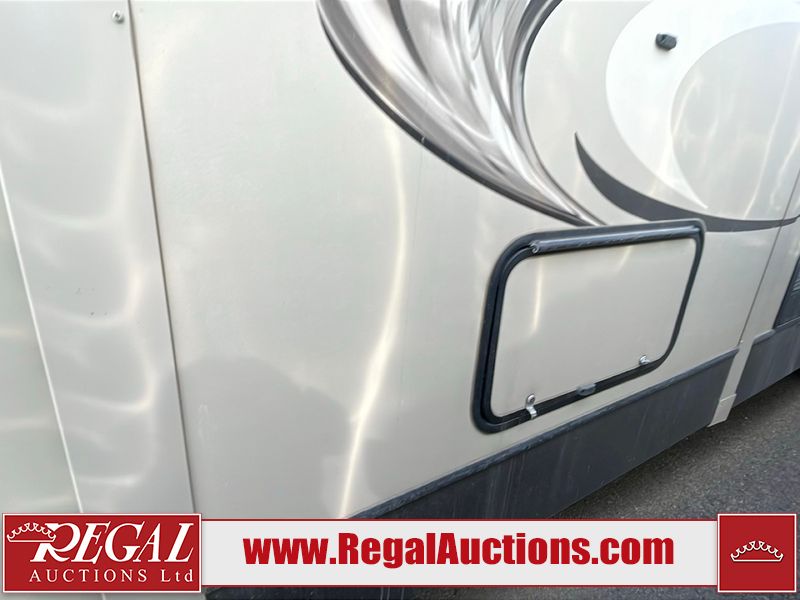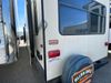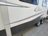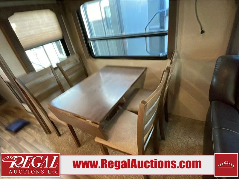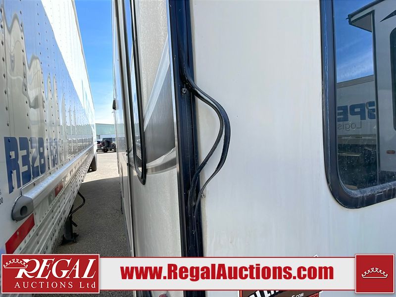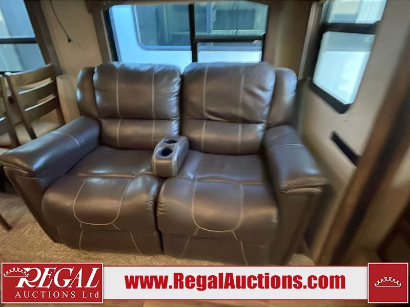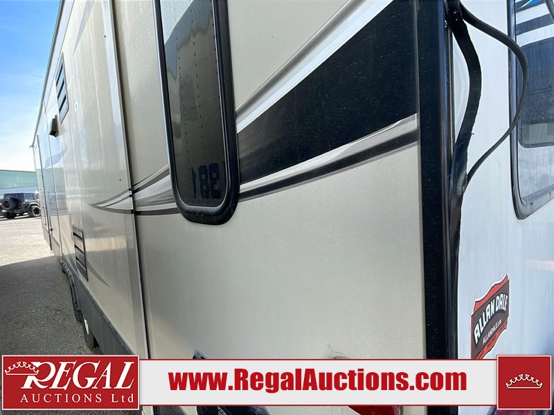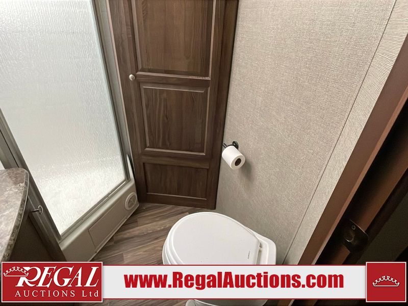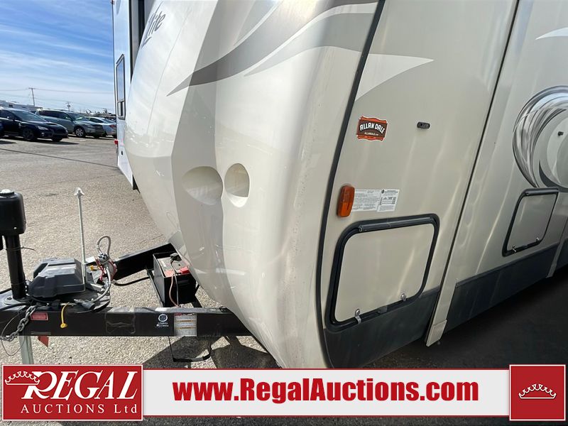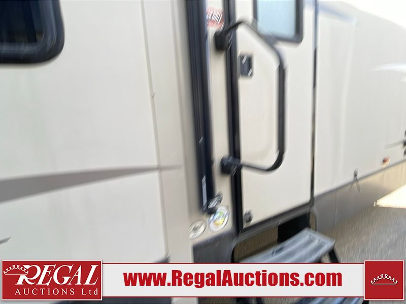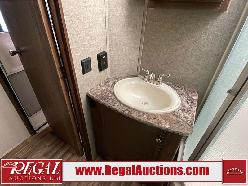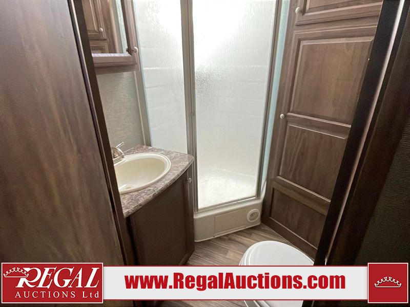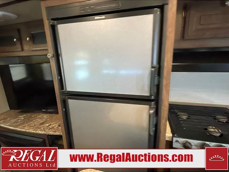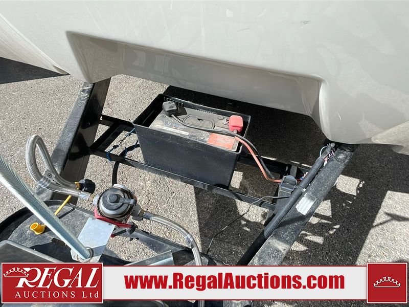 This unit is a 2017 Keystone cougar 30RLI model tandem axle bumper pull trailer. It has a single door entry, roof air, and three slide outs accommodating the living area. The floor has a soft spot by the water pump from an old leak. The interior is clean. Some walls are showing scratches and scuffs. The mattress sustained. The exterior walls are made of hard wall fiberglass. The front end is showing chips. Some walls are showing scratches and scuffs. The right wall is showing water delamination. This unit is equipped with a battery. Both propane tanks are missing. The tires are mounted to alloy rims and appeared to be in good enough condition for use. This unit is cooked with a refrigerator, microwave, three burner stove, top, oven, television, stereo system, and a electrical fireplace. The layout consists of a master bedroom/bathroom in the front, and a kitchenette/living area in the rear.