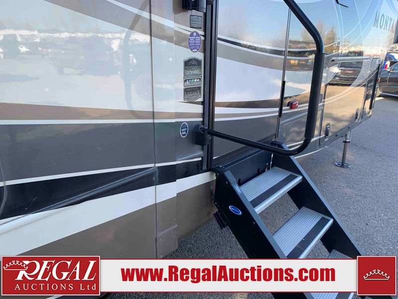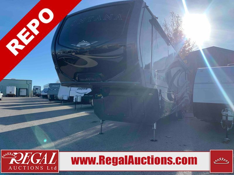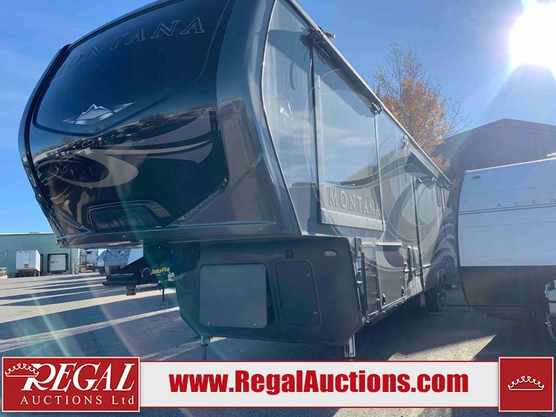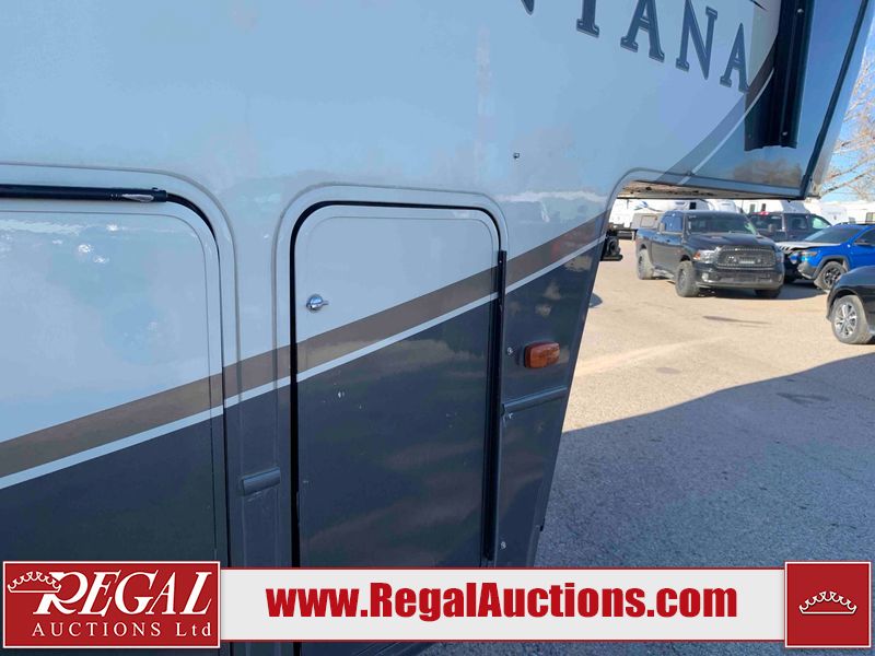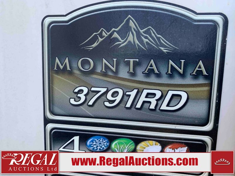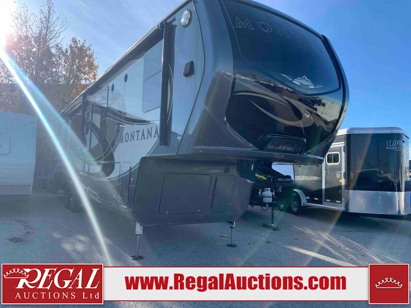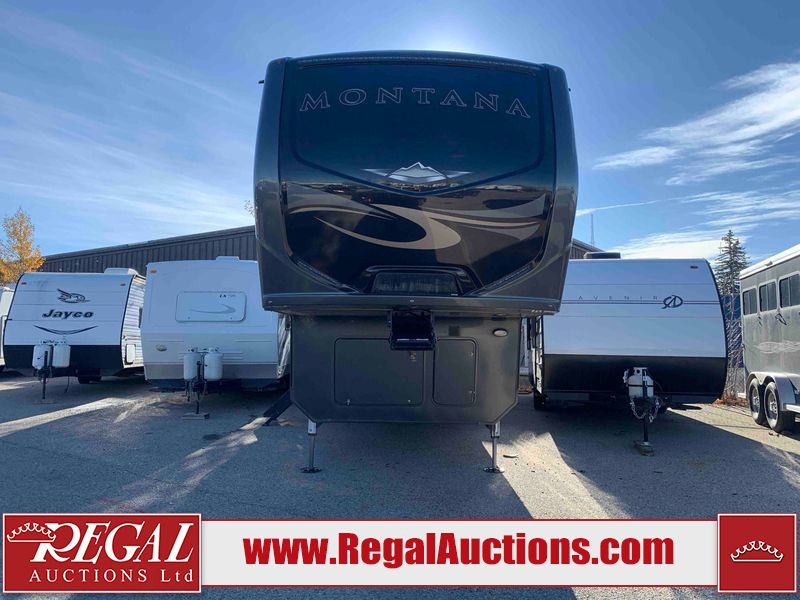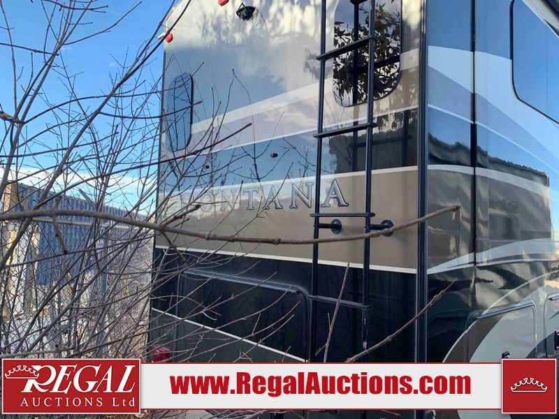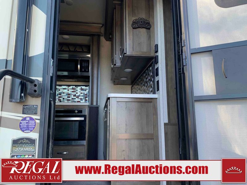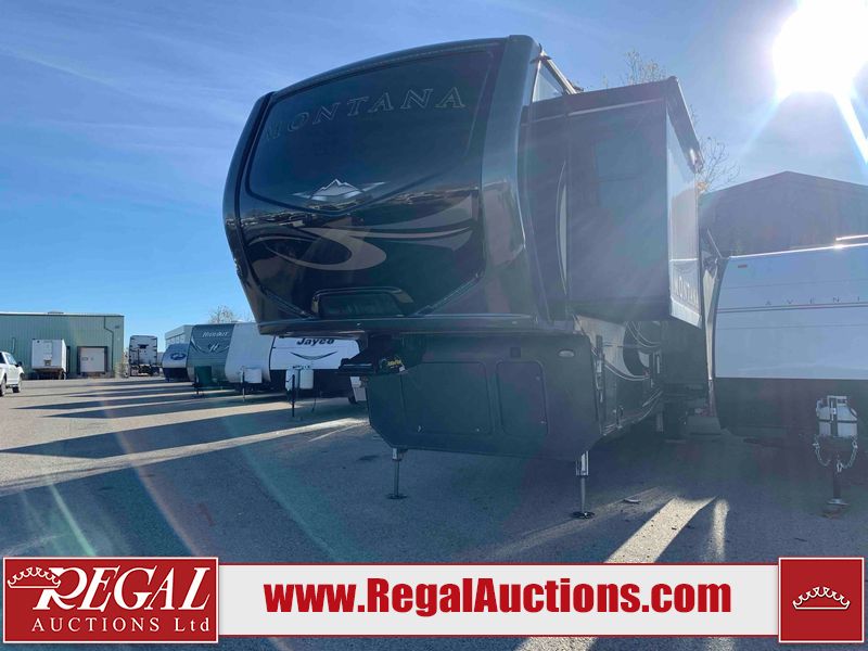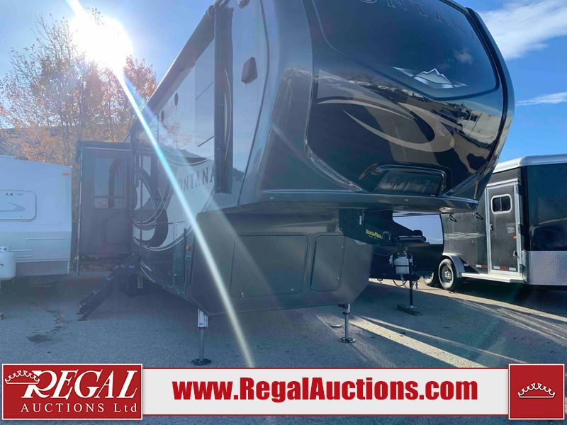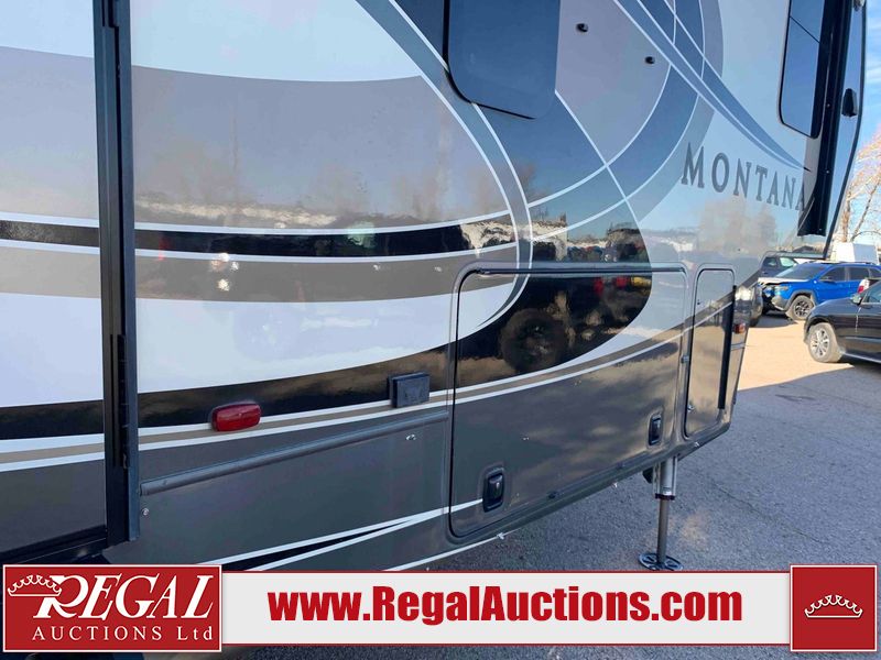 This unit is a 2018 Keystone Montana 3791RD model fifth wheel trailer. It has a single door entry and five slide outs accommodating the master bedroom, kitchenette/dying it, and living area. The interior is dirty. Some walls are showing scratches and scuffs. The master bed is missing. The bathroom skylight is broken. The bathroom fan trim is cracked. The kitchenette cupboards have paint peeling. The stove counter top is cracked. The dinette counter is stained and scuffed. Exterior walls are made of hard wall fibreglass. All walls are showing scratches and scuffs. The front wall and weatherstripping is cracked. The left wall has water de-lamination. The left wall storage compartment has peeling paint. The left fender is cracked. The left front and right rear reflectors are broken. The right front panel has dents. The tires are mounted to alloy rims and appear to be in good enough condition for use. This unit is missing one propane tank. This unit is equipped with a two televisions, microwave, three burner stove top, oven, refrigerator, and an electrical fireplace. The layout consist of a master bedroom/bathroom in the front, kitchenette/dinette in the centre, and a living area in the rear.