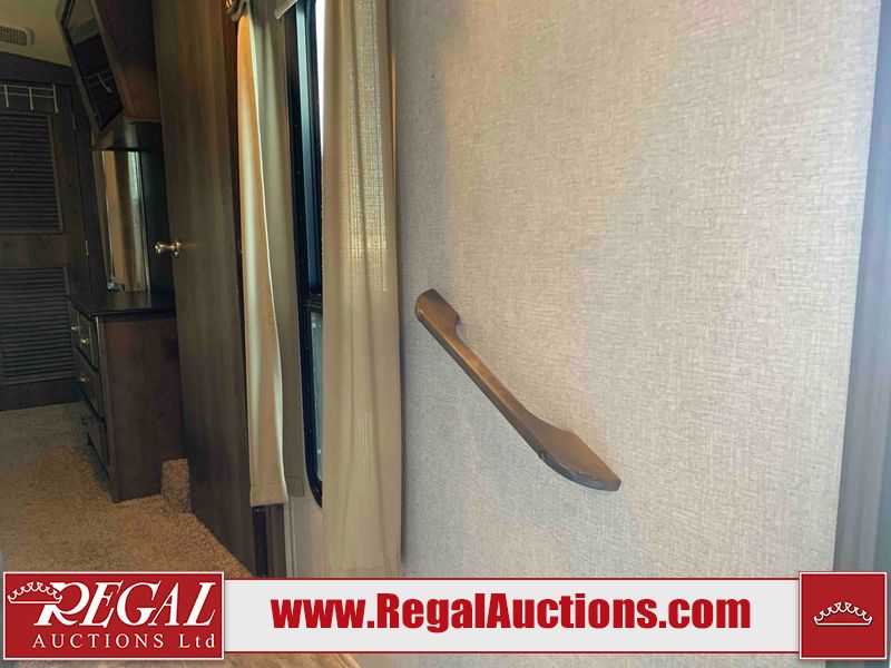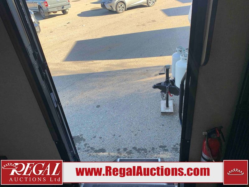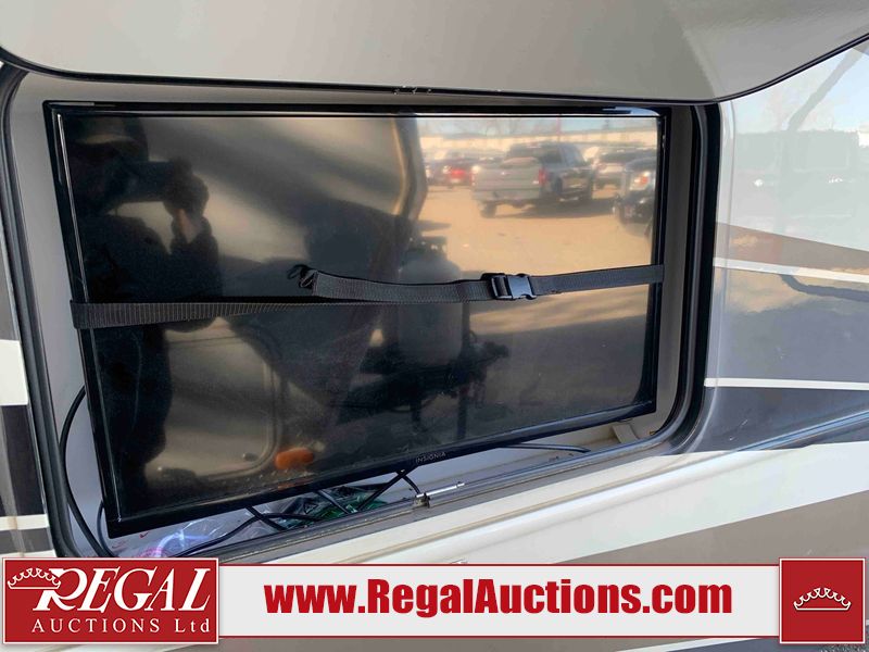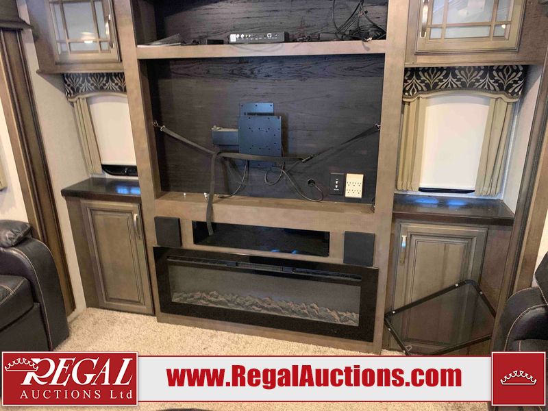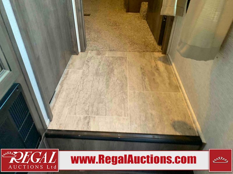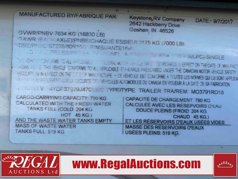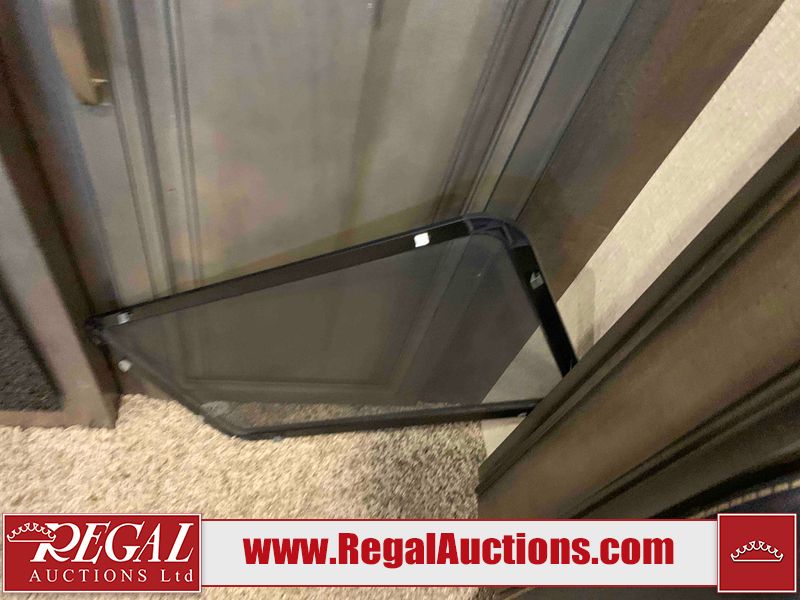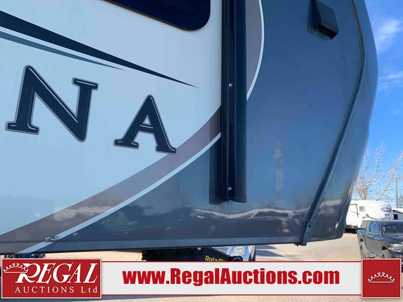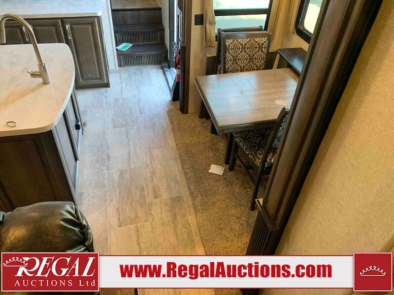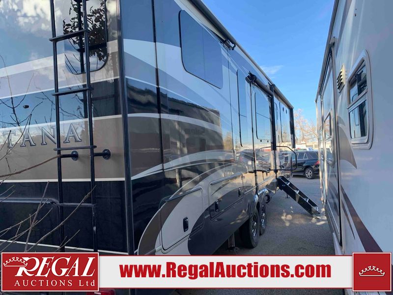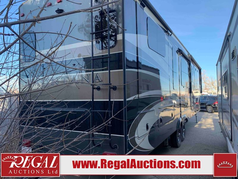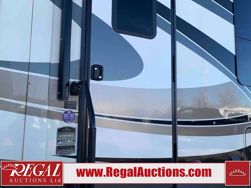 This unit is a 2018 Keystone Montana 3791RD model fifth wheel trailer. It has a single door entry and five slide outs accommodating the master bedroom, kitchenette/dying it, and living area. The interior is dirty. Some walls are showing scratches and scuffs. The master bed is missing. The bathroom skylight is broken. The bathroom fan trim is cracked. The kitchenette cupboards have paint peeling. The stove counter top is cracked. The dinette counter is stained and scuffed. Exterior walls are made of hard wall fibreglass. All walls are showing scratches and scuffs. The front wall and weatherstripping is cracked. The left wall has water de-lamination. The left wall storage compartment has peeling paint. The left fender is cracked. The left front and right rear reflectors are broken. The right front panel has dents. The tires are mounted to alloy rims and appear to be in good enough condition for use. This unit is missing one propane tank. This unit is equipped with a two televisions, microwave, three burner stove top, oven, refrigerator, and an electrical fireplace. The layout consist of a master bedroom/bathroom in the front, kitchenette/dinette in the centre, and a living area in the rear.