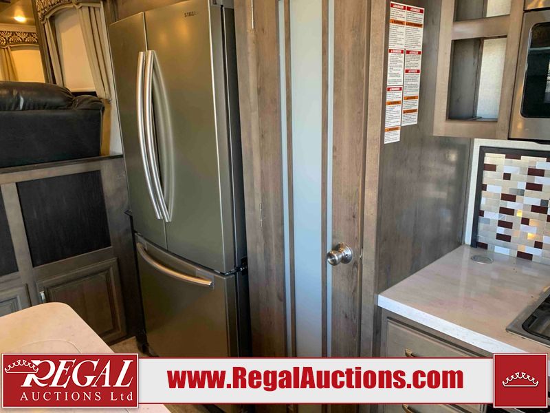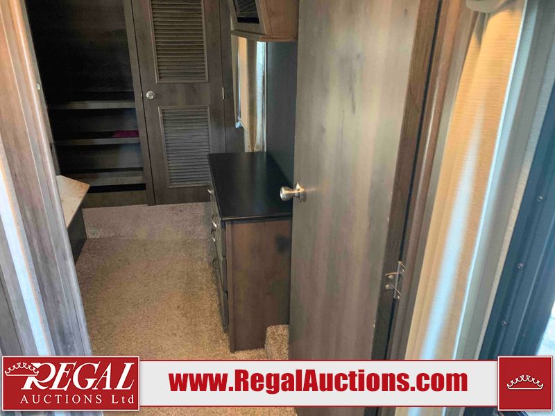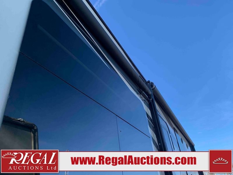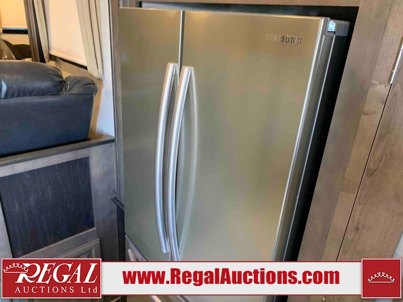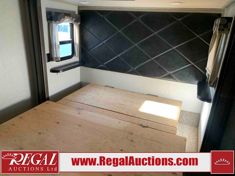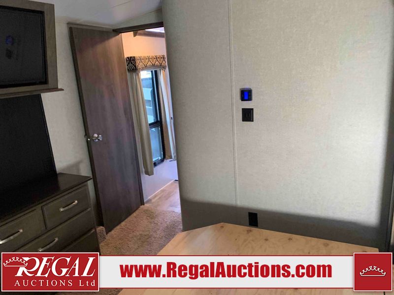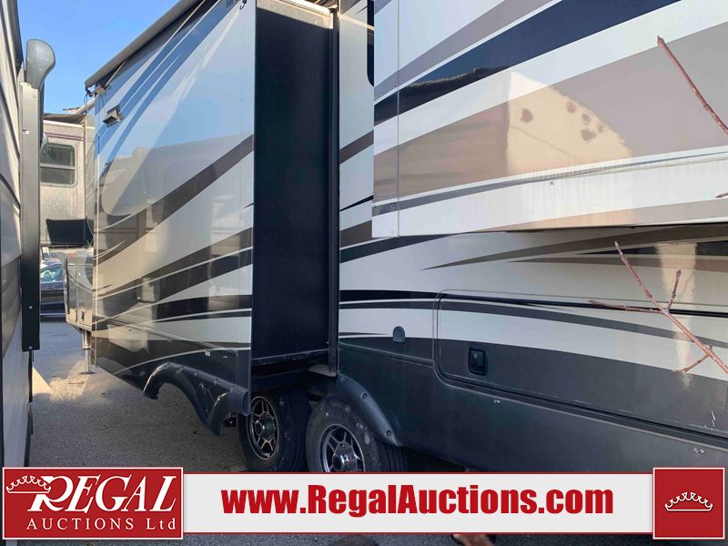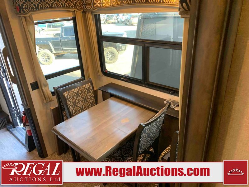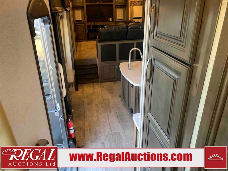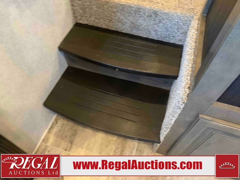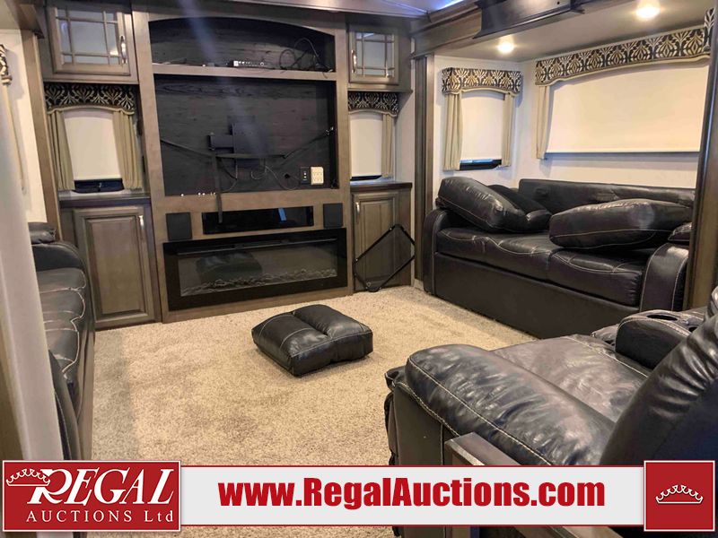 This unit is a 2018 Keystone Montana 3791RD model fifth wheel trailer. It has a single door entry and five slide outs accommodating the master bedroom, kitchenette/dying it, and living area. The interior is dirty. Some walls are showing scratches and scuffs. The master bed is missing. The bathroom skylight is broken. The bathroom fan trim is cracked. The kitchenette cupboards have paint peeling. The stove counter top is cracked. The dinette counter is stained and scuffed. Exterior walls are made of hard wall fibreglass. All walls are showing scratches and scuffs. The front wall and weatherstripping is cracked. The left wall has water de-lamination. The left wall storage compartment has peeling paint. The left fender is cracked. The left front and right rear reflectors are broken. The right front panel has dents. The tires are mounted to alloy rims and appear to be in good enough condition for use. This unit is missing one propane tank. This unit is equipped with a two televisions, microwave, three burner stove top, oven, refrigerator, and an electrical fireplace. The layout consist of a master bedroom/bathroom in the front, kitchenette/dinette in the centre, and a living area in the rear.