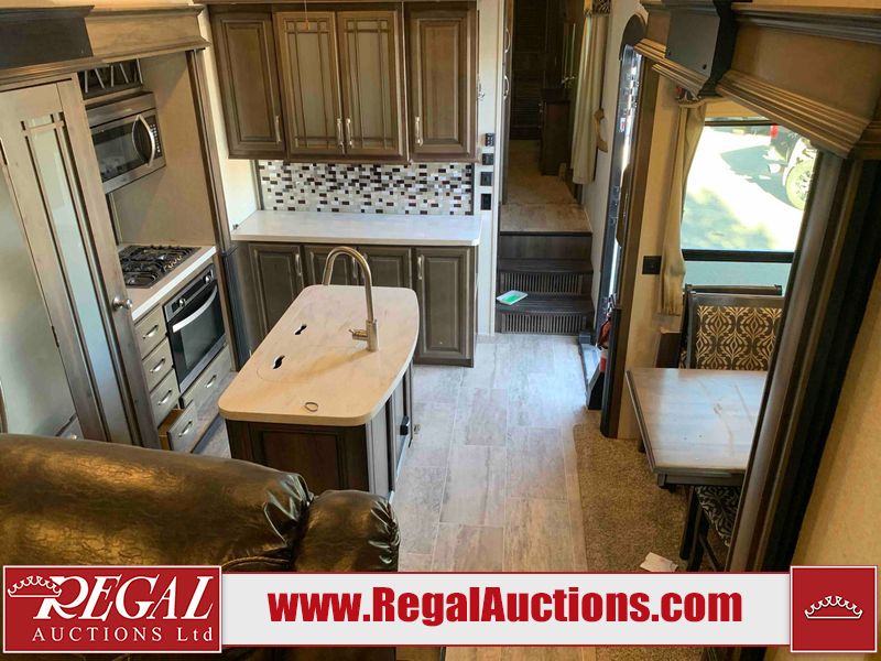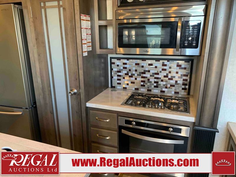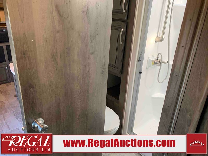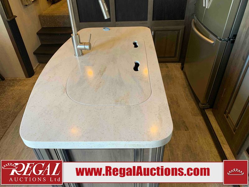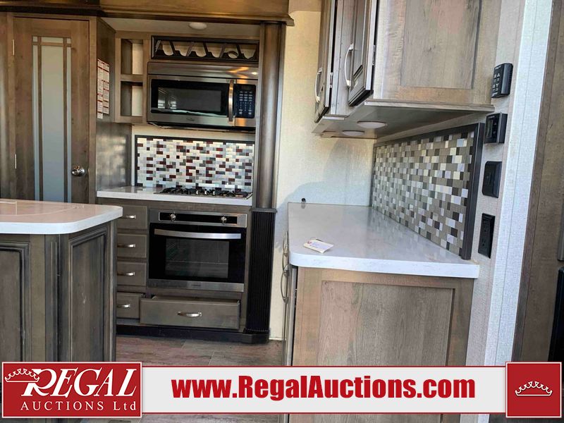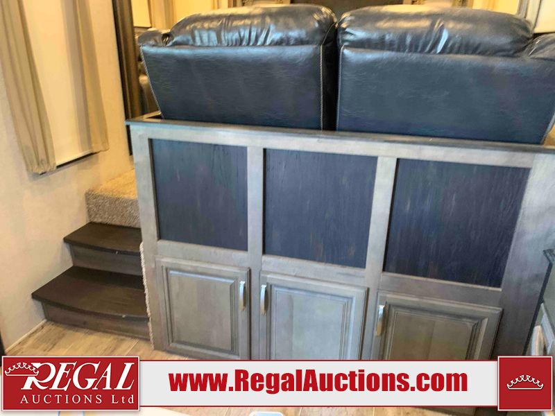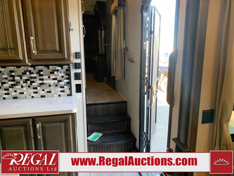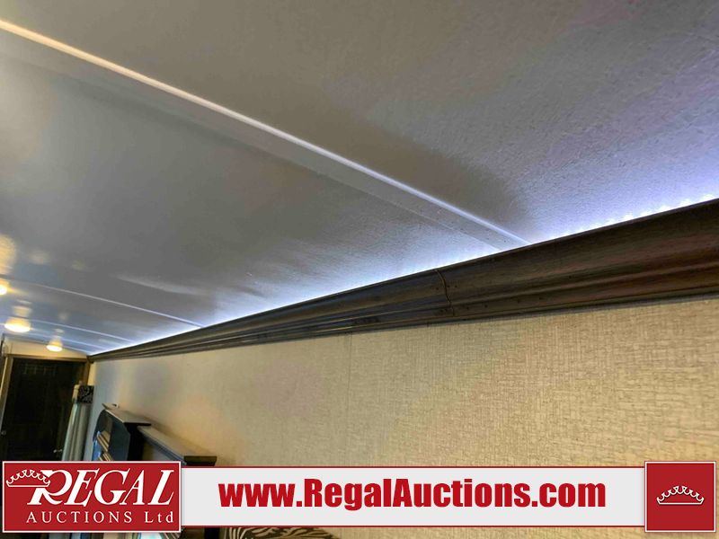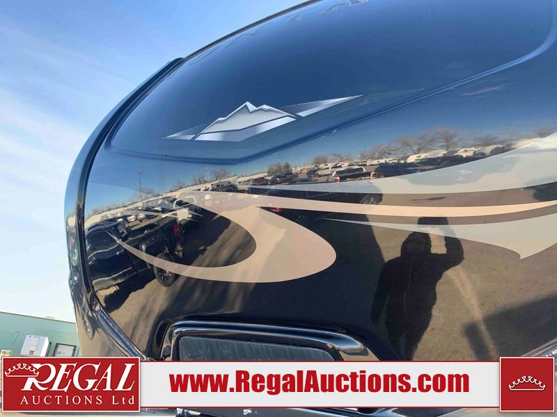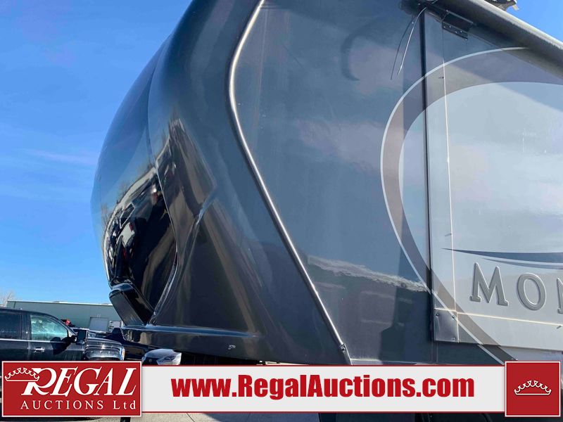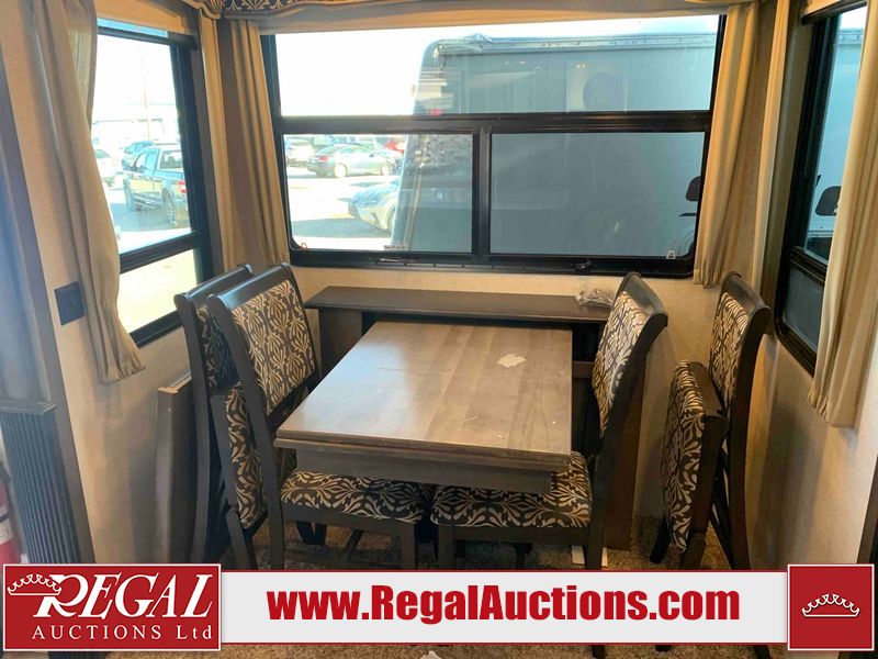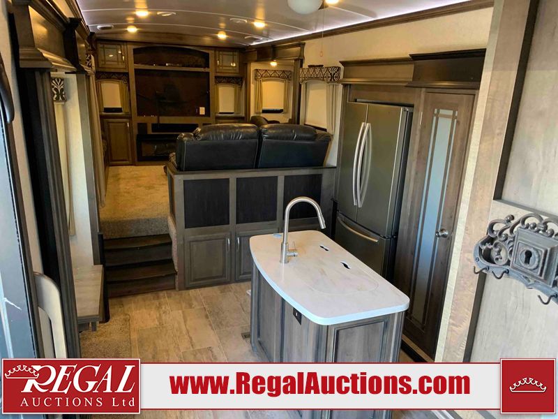 This unit is a 2018 Keystone Montana 3791RD model fifth wheel trailer. It has a single door entry and five slide outs accommodating the master bedroom, kitchenette/dying it, and living area. The interior is dirty. Some walls are showing scratches and scuffs. The master bed is missing. The bathroom skylight is broken. The bathroom fan trim is cracked. The kitchenette cupboards have paint peeling. The stove counter top is cracked. The dinette counter is stained and scuffed. Exterior walls are made of hard wall fibreglass. All walls are showing scratches and scuffs. The front wall and weatherstripping is cracked. The left wall has water de-lamination. The left wall storage compartment has peeling paint. The left fender is cracked. The left front and right rear reflectors are broken. The right front panel has dents. The tires are mounted to alloy rims and appear to be in good enough condition for use. This unit is missing one propane tank. This unit is equipped with a two televisions, microwave, three burner stove top, oven, refrigerator, and an electrical fireplace. The layout consist of a master bedroom/bathroom in the front, kitchenette/dinette in the centre, and a living area in the rear.
