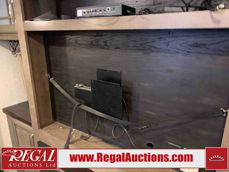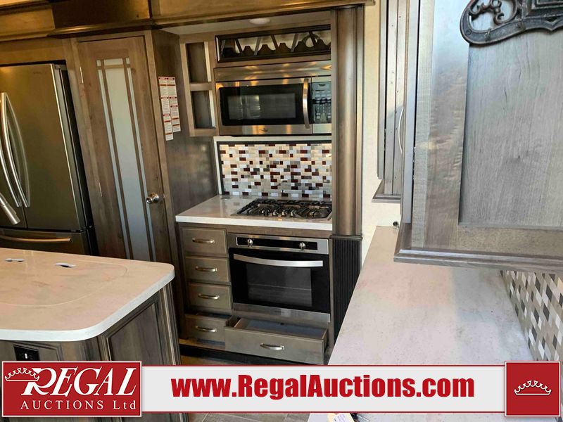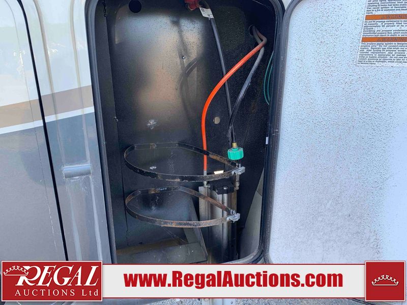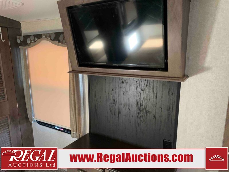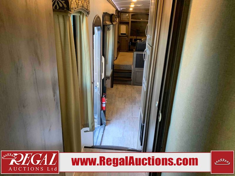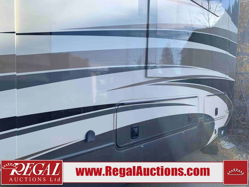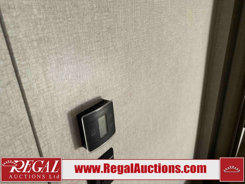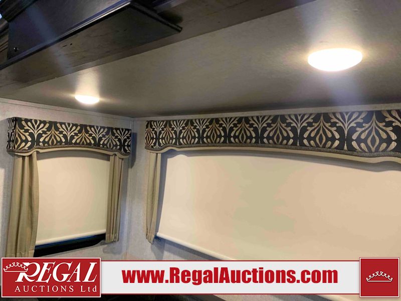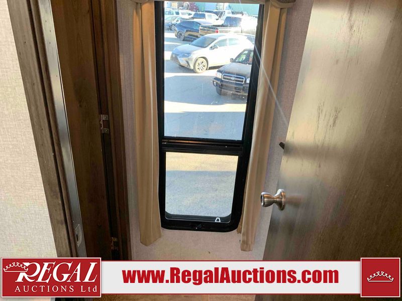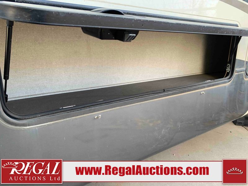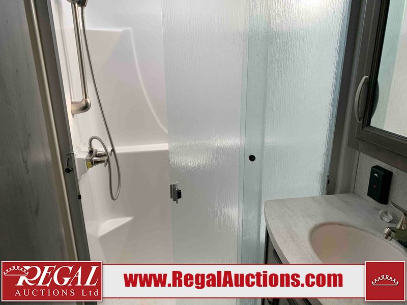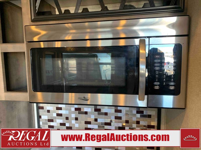This unit is a 2018 Keystone Montana 3791RD model fifth wheel trailer. It has a single door entry and five slide outs accommodating the master bedroom, kitchenette/dying it, and living area. The interior is dirty. Some walls are showing scratches and scuffs. The master bed is missing. The bathroom skylight is broken. The bathroom fan trim is cracked. The kitchenette cupboards have paint peeling. The stove counter top is cracked. The dinette counter is stained and scuffed. Exterior walls are made of hard wall fibreglass. All walls are showing scratches and scuffs. The front wall and weatherstripping is cracked. The left wall has water de-lamination. The left wall storage compartment has peeling paint. The left fender is cracked. The left front and right rear reflectors are broken. The right front panel has dents. The tires are mounted to alloy rims and appear to be in good enough condition for use. This unit is missing one propane tank. This unit is equipped with a two televisions, microwave, three burner stove top, oven, refrigerator, and an electrical fireplace. The layout consist of a master bedroom/bathroom in the front, kitchenette/dinette in the centre, and a living area in the rear.