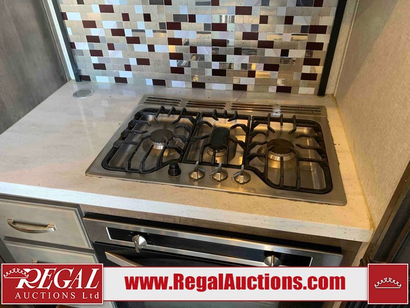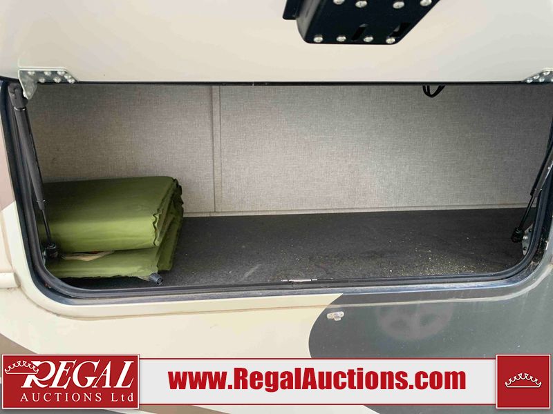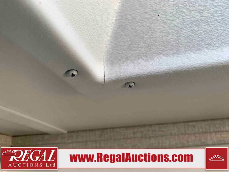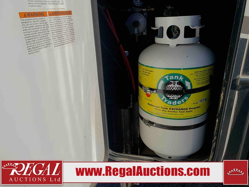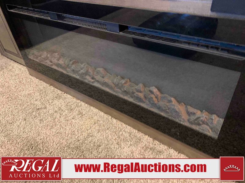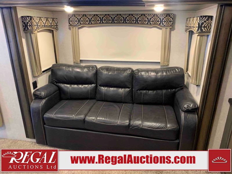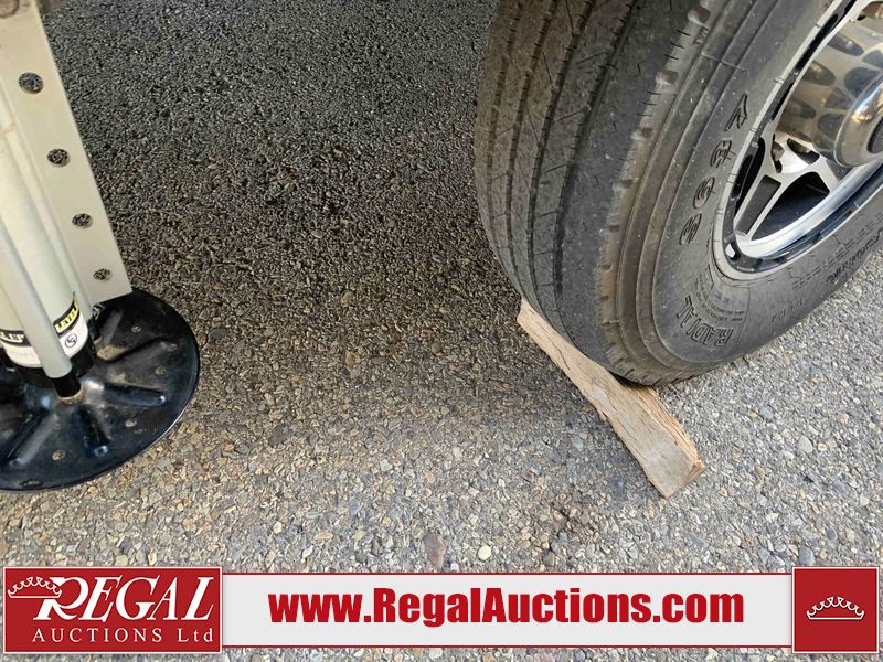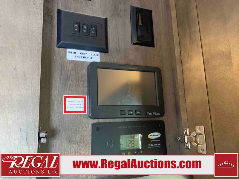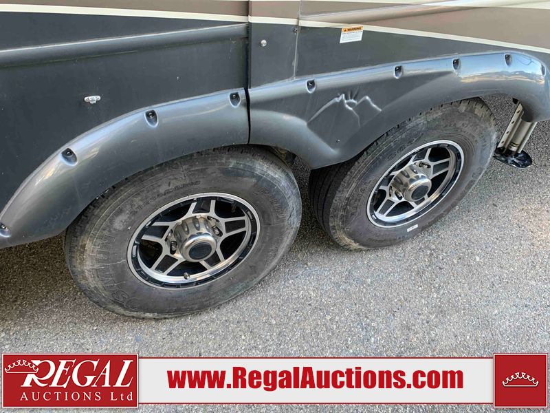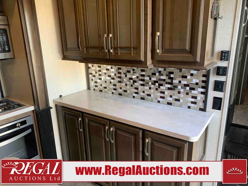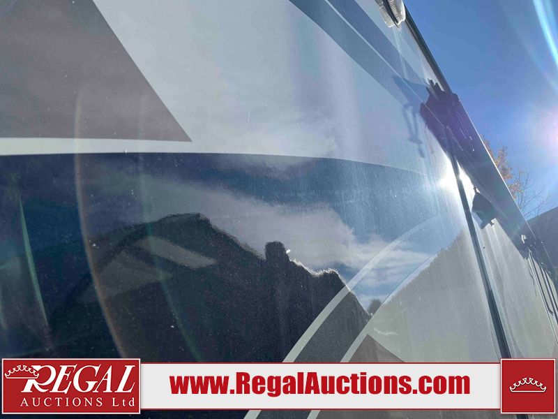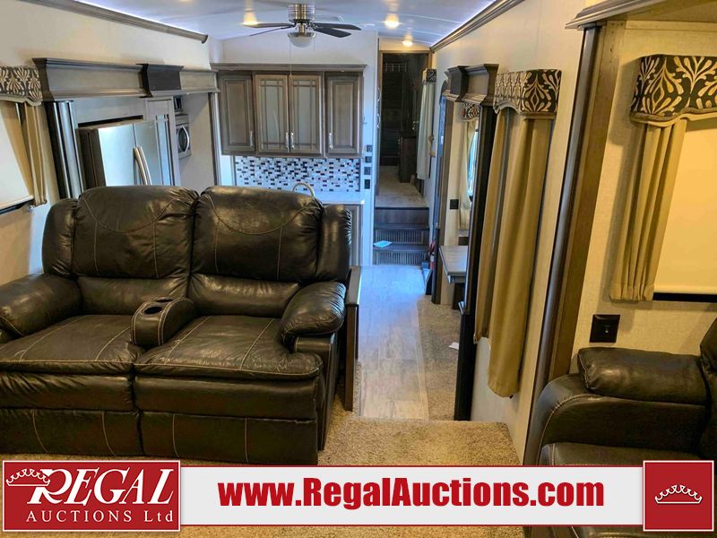 This unit is a 2018 Keystone Montana 3791RD model fifth wheel trailer. It has a single door entry and five slide outs accommodating the master bedroom, kitchenette/dying it, and living area. The interior is dirty. Some walls are showing scratches and scuffs. The master bed is missing. The bathroom skylight is broken. The bathroom fan trim is cracked. The kitchenette cupboards have paint peeling. The stove counter top is cracked. The dinette counter is stained and scuffed. Exterior walls are made of hard wall fibreglass. All walls are showing scratches and scuffs. The front wall and weatherstripping is cracked. The left wall has water de-lamination. The left wall storage compartment has peeling paint. The left fender is cracked. The left front and right rear reflectors are broken. The right front panel has dents. The tires are mounted to alloy rims and appear to be in good enough condition for use. This unit is missing one propane tank. This unit is equipped with a two televisions, microwave, three burner stove top, oven, refrigerator, and an electrical fireplace. The layout consist of a master bedroom/bathroom in the front, kitchenette/dinette in the centre, and a living area in the rear.