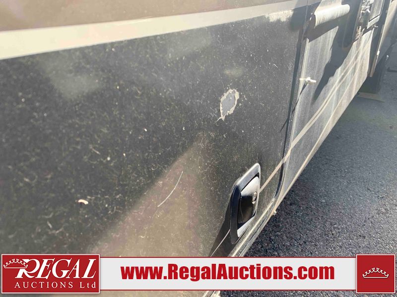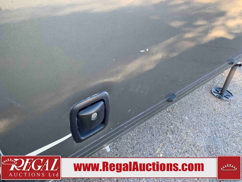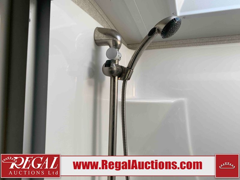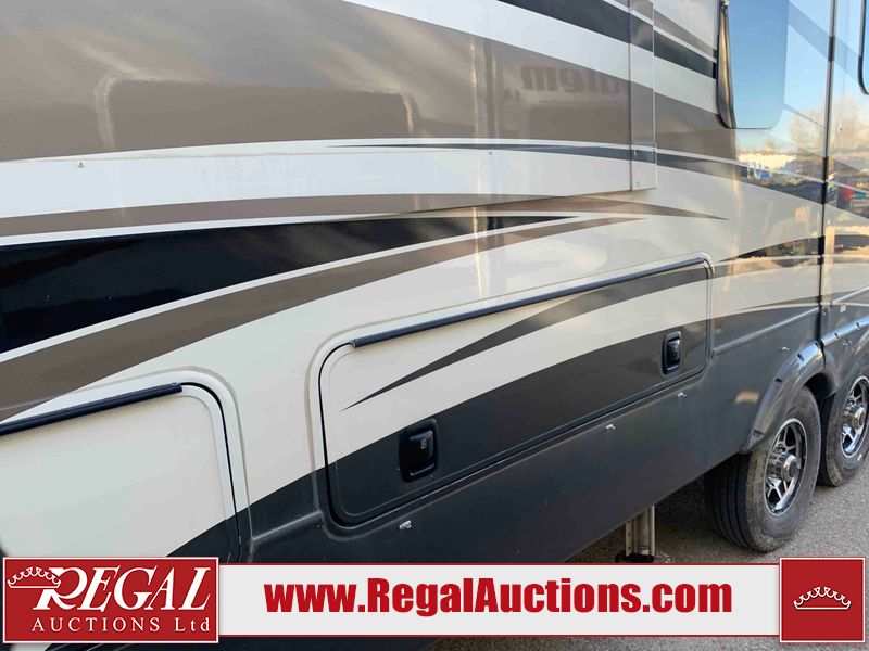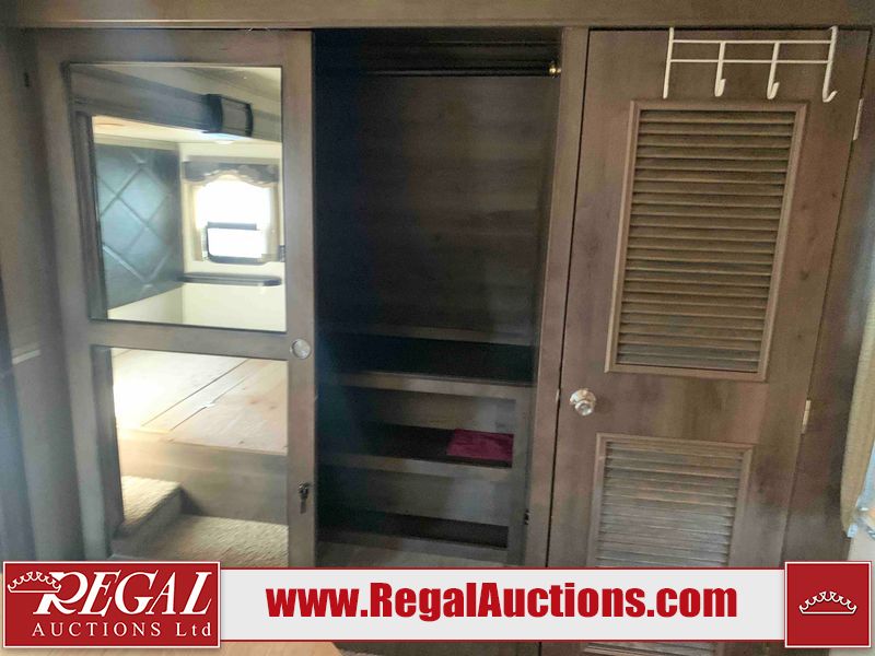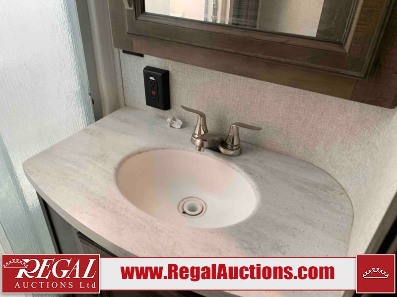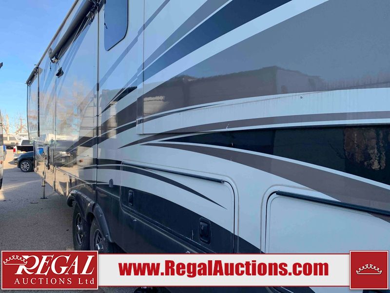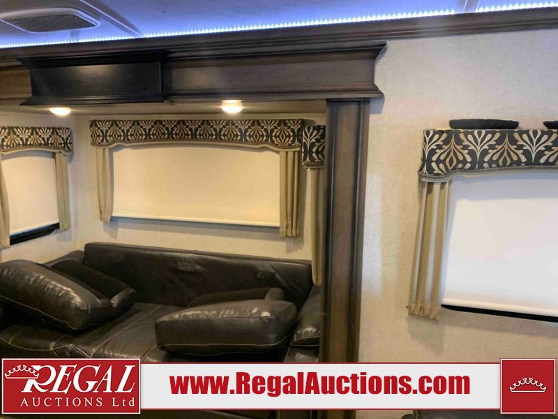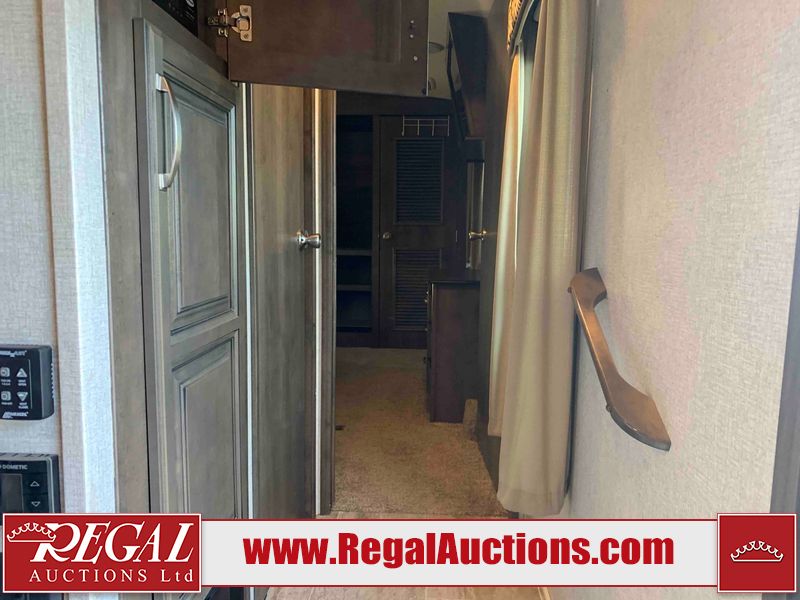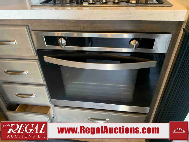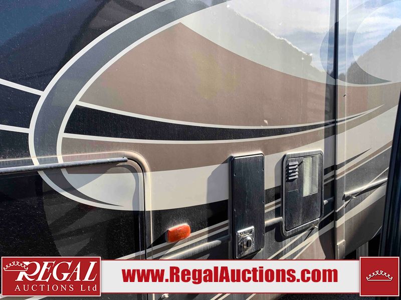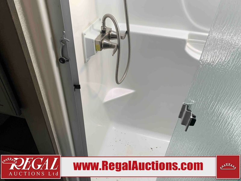 This unit is a 2018 Keystone Montana 3791RD model fifth wheel trailer. It has a single door entry and five slide outs accommodating the master bedroom, kitchenette/dying it, and living area. The interior is dirty. Some walls are showing scratches and scuffs. The master bed is missing. The bathroom skylight is broken. The bathroom fan trim is cracked. The kitchenette cupboards have paint peeling. The stove counter top is cracked. The dinette counter is stained and scuffed. Exterior walls are made of hard wall fibreglass. All walls are showing scratches and scuffs. The front wall and weatherstripping is cracked. The left wall has water de-lamination. The left wall storage compartment has peeling paint. The left fender is cracked. The left front and right rear reflectors are broken. The right front panel has dents. The tires are mounted to alloy rims and appear to be in good enough condition for use. This unit is missing one propane tank. This unit is equipped with a two televisions, microwave, three burner stove top, oven, refrigerator, and an electrical fireplace. The layout consist of a master bedroom/bathroom in the front, kitchenette/dinette in the centre, and a living area in the rear.