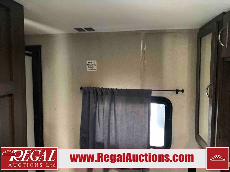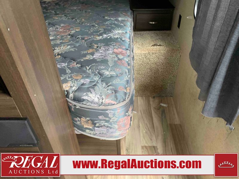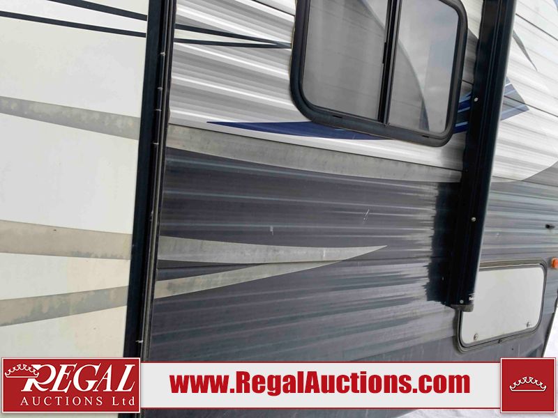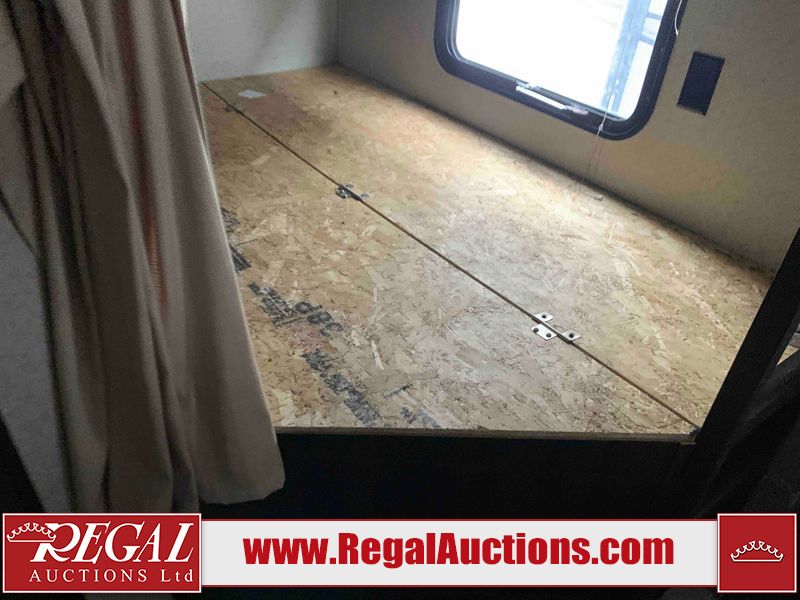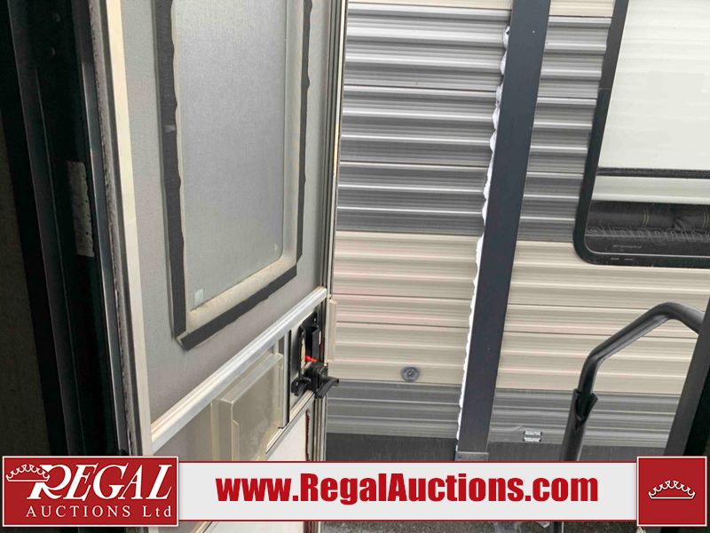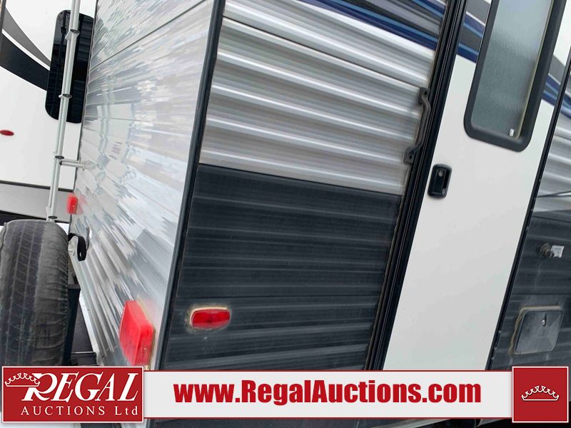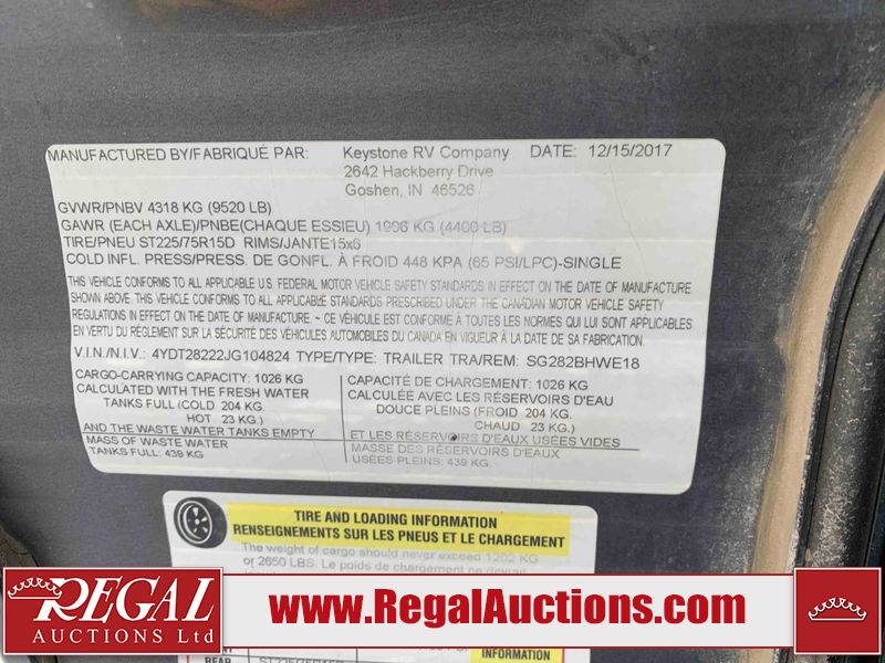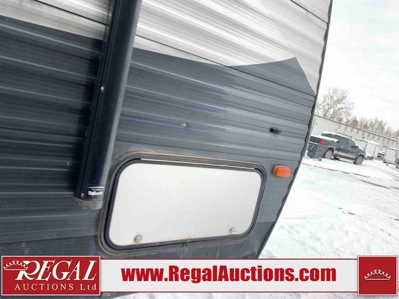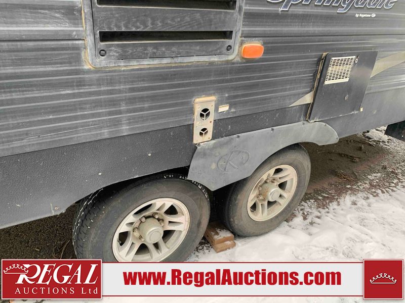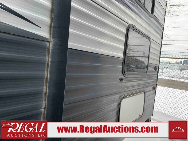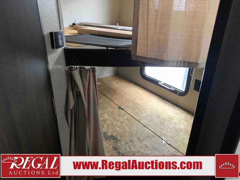 This RV is a 2018 Keystone Springdale 282 model tandem axle bumper pull trailer. It has a double door entry, roof air, and one light out accommodating the living area. The interior is dirty. The screen door is torn. All walls are showing scratches and scuffs. The roof is showing water damage. The master bedroom ceiling fan, and cabinet wall are broken. The right wallpaper trim is peeling. The separating wall has drill holes. The couch is missing. The bunkhouse is missing both mattresses. The bathroom ceiling fan is broken. The exterior walls are made of soft wall aluminum. The front, and left wall are showing hail damage. The left wall is dented. Some decals are peeling. The left fender is separating. The right fender is broken. The right front lower wall is gouged. The battery is dead. The slide out cannot be tested. The battery utility box has been screwed shut. The condition of the battery cannot be determined. This unit is equipped with a battery, and two propane tanks. The tires are mounted to all rims and appear to be in good enough condition for use. This unit is equipped with a microwave, three burner stove top, oven, refrigerator, and a stereo system. The layout consists of a master bedroom in the front, kitchenette/dinette in the center, and a bunkhouse/bathroom in the rear.