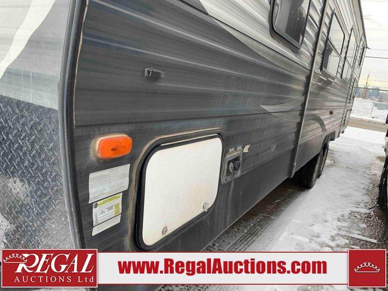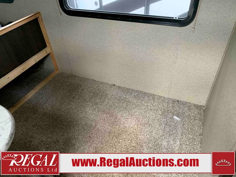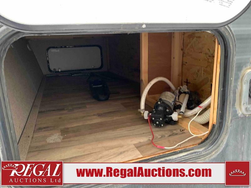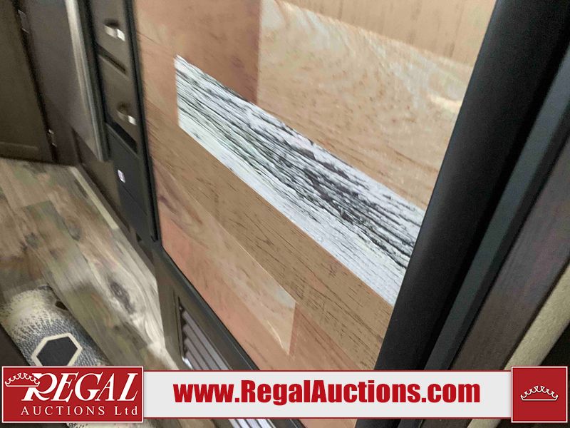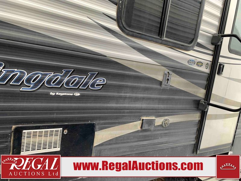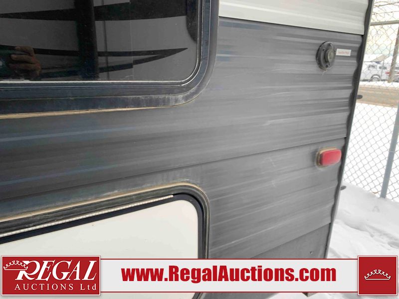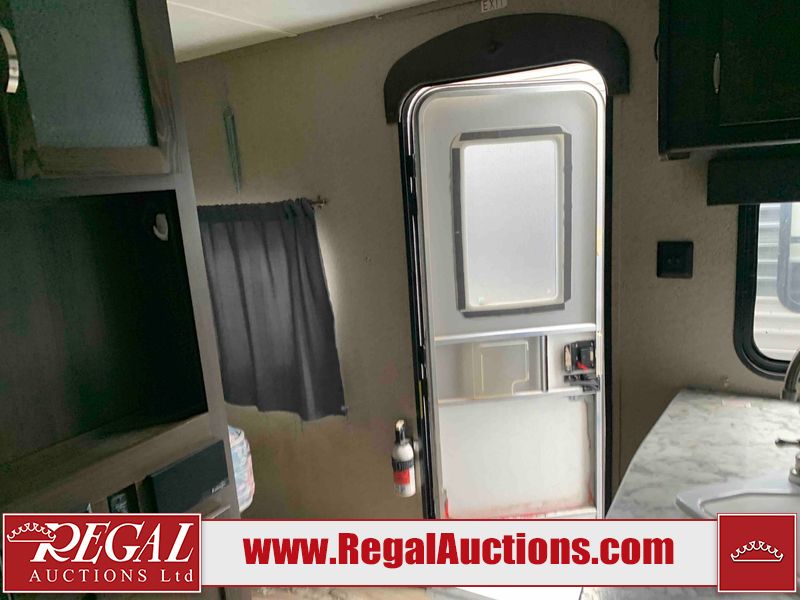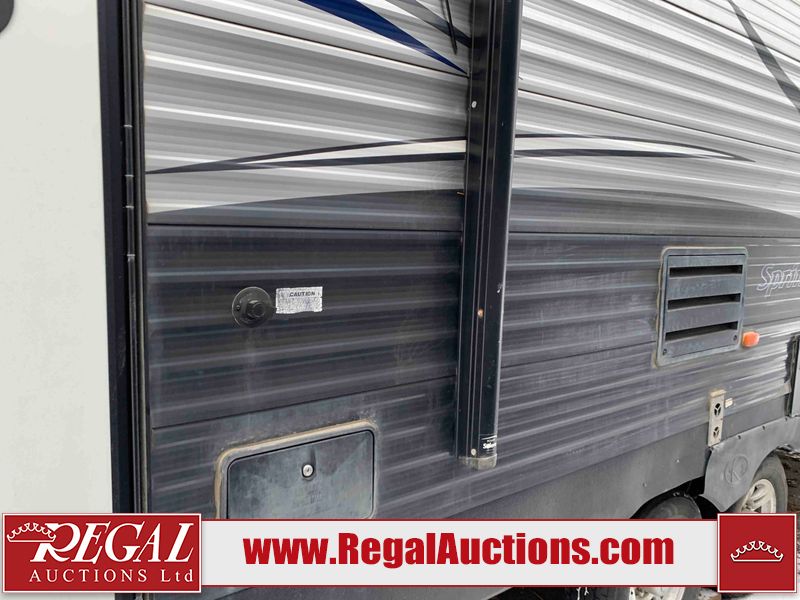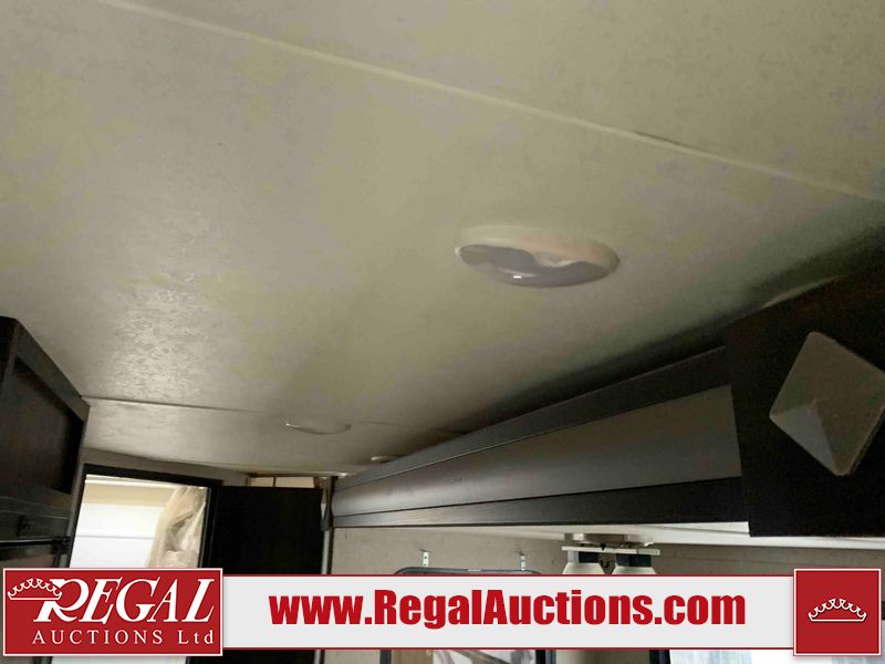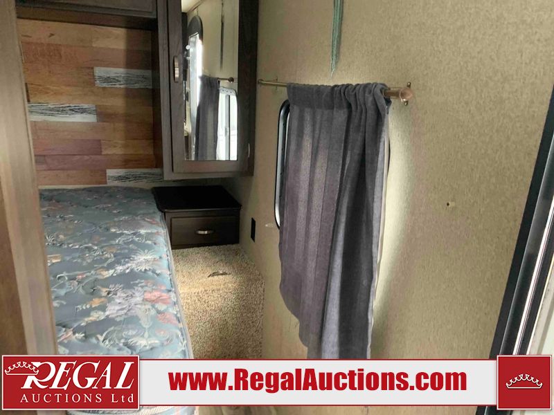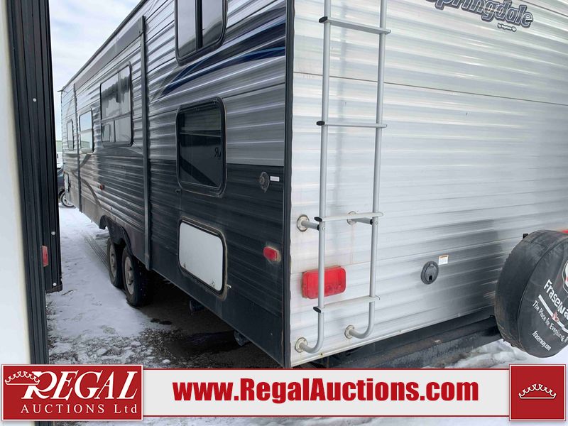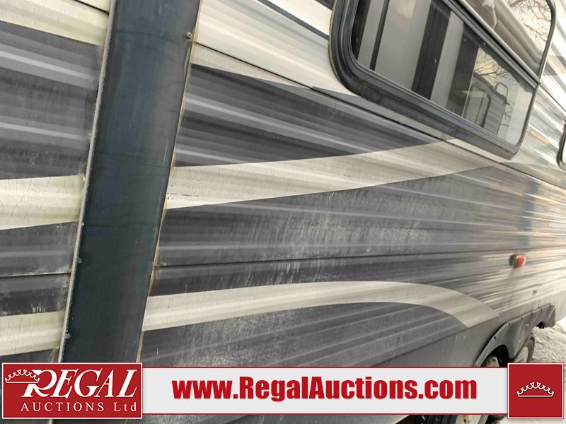 This RV is a 2018 Keystone Springdale 282 model tandem axle bumper pull trailer. It has a double door entry, roof air, and one light out accommodating the living area. The interior is dirty. The screen door is torn. All walls are showing scratches and scuffs. The roof is showing water damage. The master bedroom ceiling fan, and cabinet wall are broken. The right wallpaper trim is peeling. The separating wall has drill holes. The couch is missing. The bunkhouse is missing both mattresses. The bathroom ceiling fan is broken. The exterior walls are made of soft wall aluminum. The front, and left wall are showing hail damage. The left wall is dented. Some decals are peeling. The left fender is separating. The right fender is broken. The right front lower wall is gouged. The battery is dead. The slide out cannot be tested. The battery utility box has been screwed shut. The condition of the battery cannot be determined. This unit is equipped with a battery, and two propane tanks. The tires are mounted to all rims and appear to be in good enough condition for use. This unit is equipped with a microwave, three burner stove top, oven, refrigerator, and a stereo system. The layout consists of a master bedroom in the front, kitchenette/dinette in the center, and a bunkhouse/bathroom in the rear.