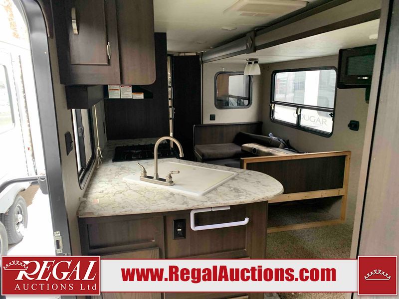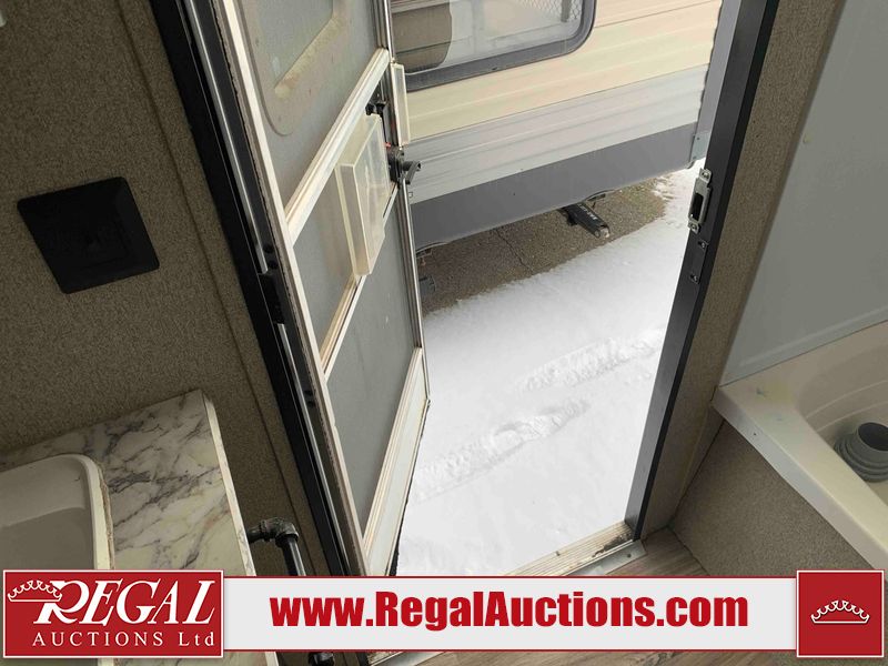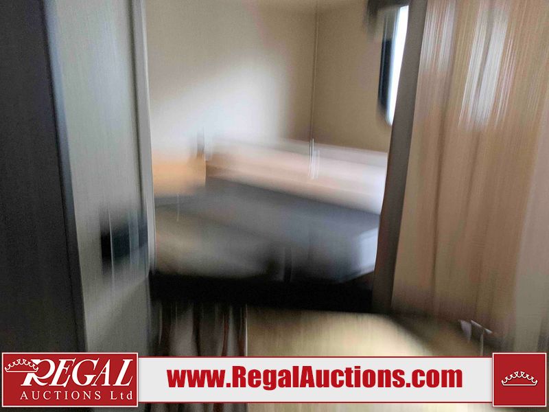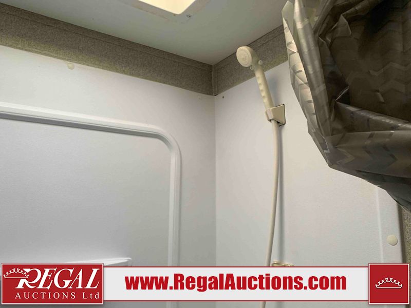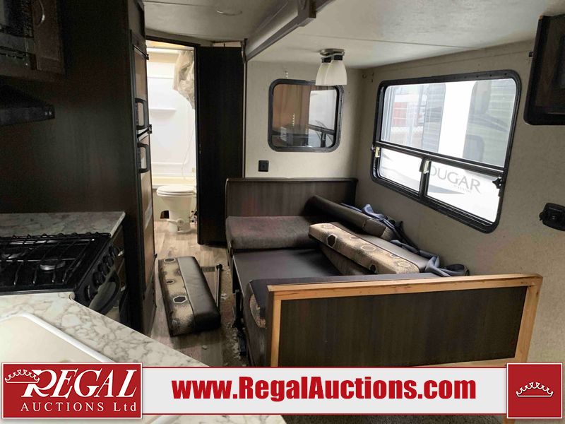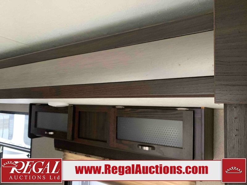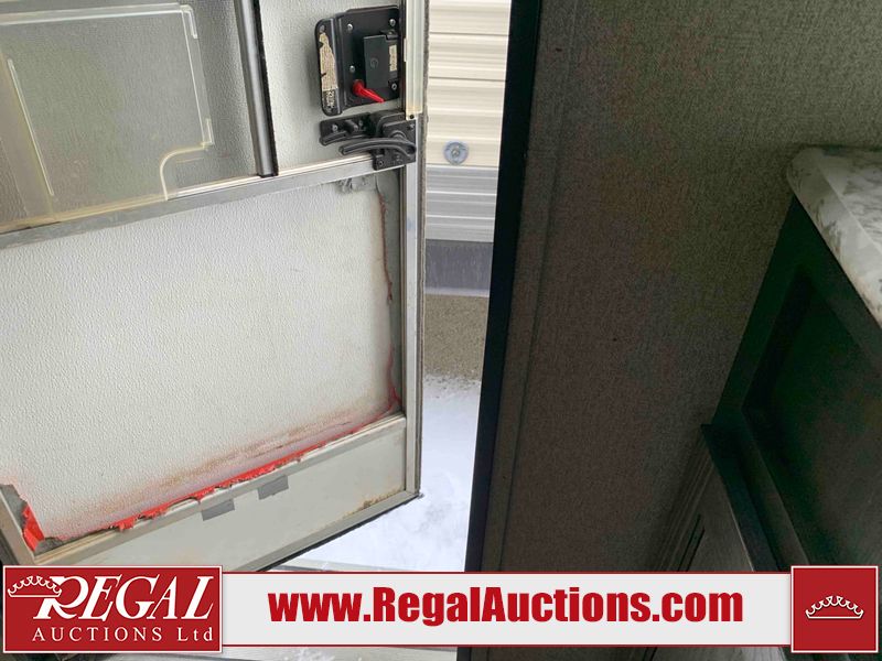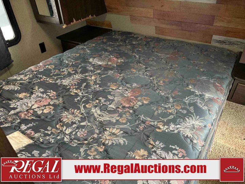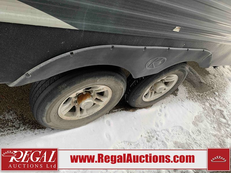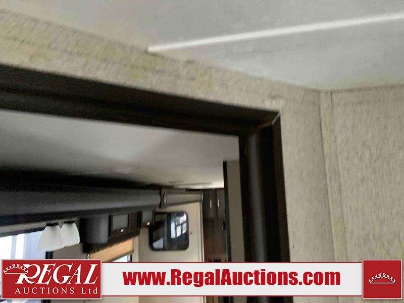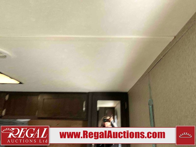 This RV is a 2018 Keystone Springdale 282 model tandem axle bumper pull trailer. It has a double door entry, roof air, and one light out accommodating the living area. The interior is dirty. The screen door is torn. All walls are showing scratches and scuffs. The roof is showing water damage. The master bedroom ceiling fan, and cabinet wall are broken. The right wallpaper trim is peeling. The separating wall has drill holes. The couch is missing. The bunkhouse is missing both mattresses. The bathroom ceiling fan is broken. The exterior walls are made of soft wall aluminum. The front, and left wall are showing hail damage. The left wall is dented. Some decals are peeling. The left fender is separating. The right fender is broken. The right front lower wall is gouged. The battery is dead. The slide out cannot be tested. The battery utility box has been screwed shut. The condition of the battery cannot be determined. This unit is equipped with a battery, and two propane tanks. The tires are mounted to all rims and appear to be in good enough condition for use. This unit is equipped with a microwave, three burner stove top, oven, refrigerator, and a stereo system. The layout consists of a master bedroom in the front, kitchenette/dinette in the center, and a bunkhouse/bathroom in the rear.