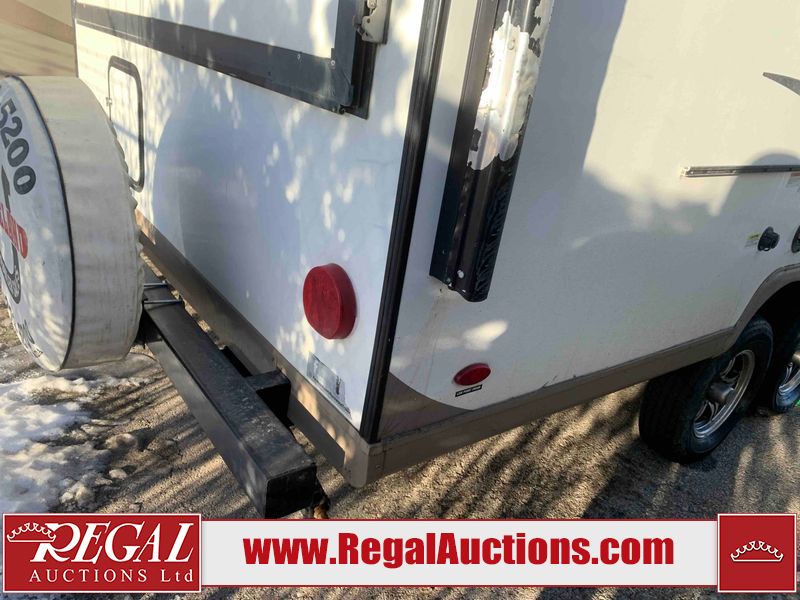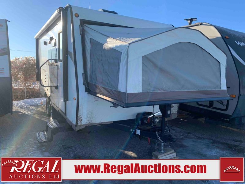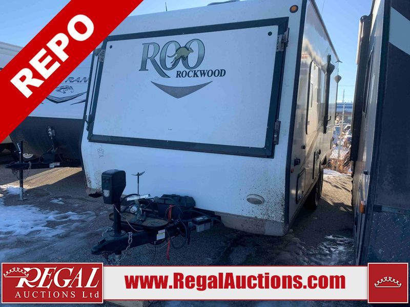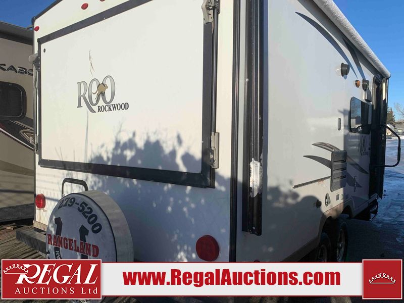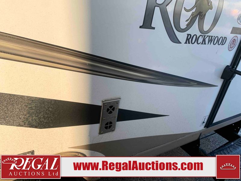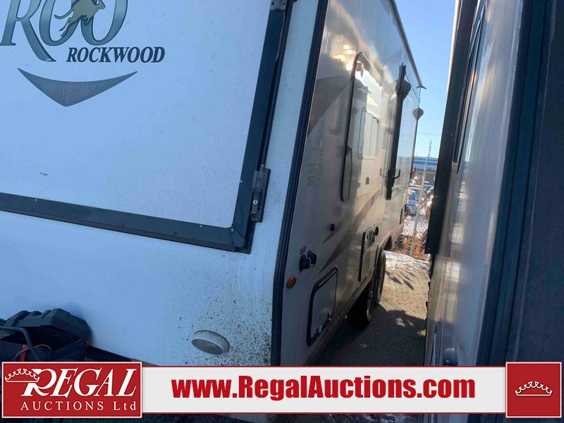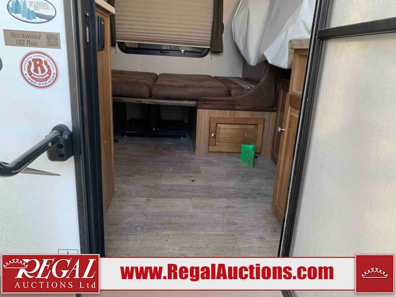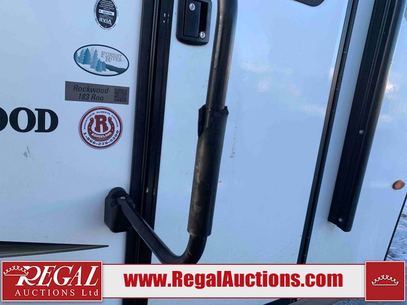RV is a 2018 Rockwood 183 modelbumper bumper pole travel trailer. This unit has a single door entry, roof air, and three pop out tent slides. The interior is dirty. Some walls are showing scratches and scuffs. There is a corner trim that has been broken off. The exterior bathroom wall is separating. One of the tiedown pivots for the pop out is missing. All three mattresses are missing. Exterior walls are made of hard wall fiberglass. Both the front lower plastics are cracked and broken. All walls are showing scratches and scuffs. Some decals are peeling. The left wall weatherstripping has been poorly resealed. Both fenders are cracked. The entry door trim is gouged. This unit is missing both propane tanks, and a battery. The tires are mounted to steel rims and appear to be in good enough condition for you. This unit is equipped with a three burner stove top, oven, microwave, refrigerator, and a stereo system. The layout consists of a pop out mattress in the front, dinette/kitchenette in the center, and a two-piece pop out/bathroom in the rear.