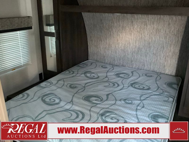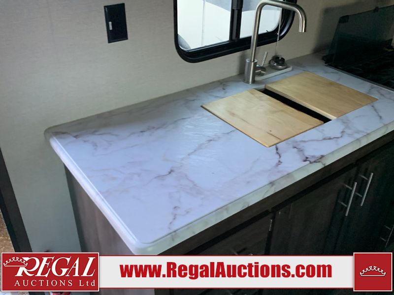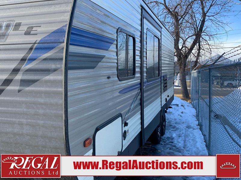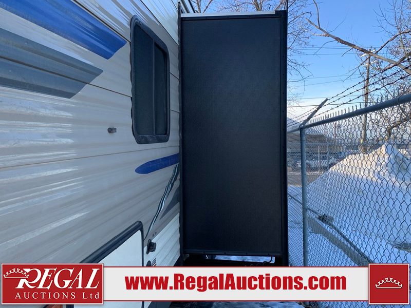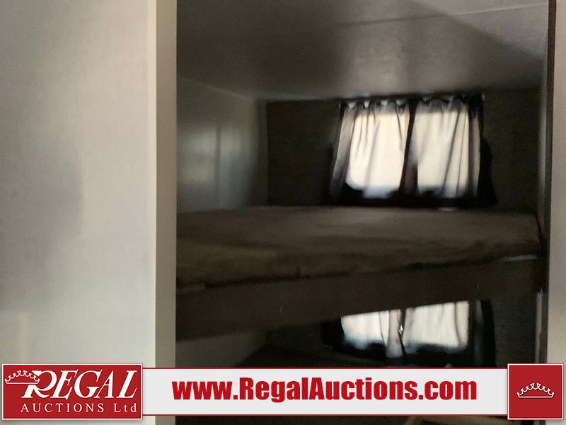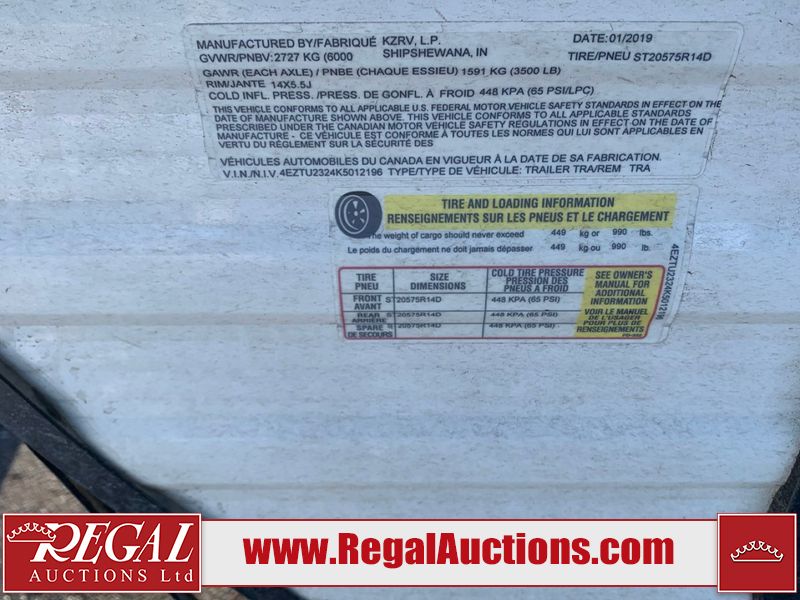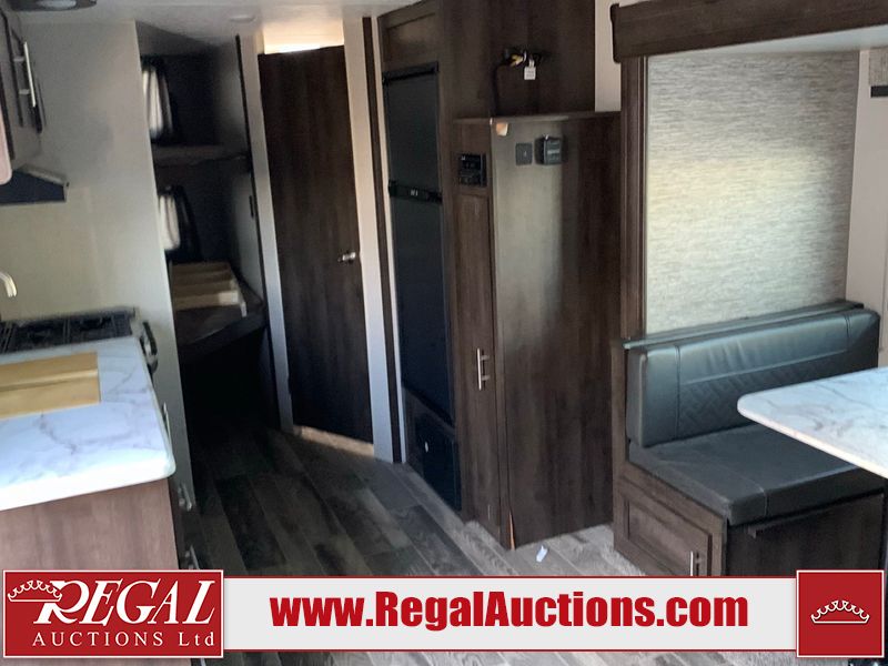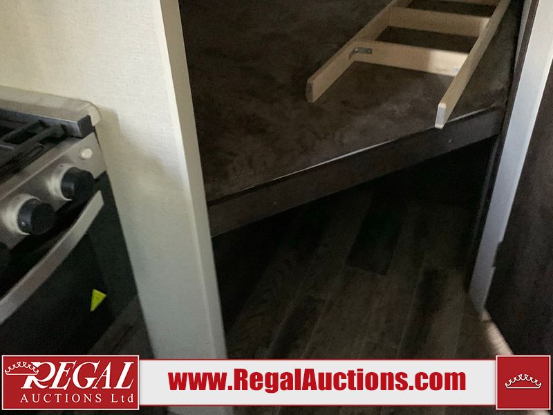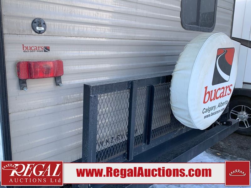 This RV is a 2019 KZ INC. Sportsman LE series 231BHKLE model bumper pull travel trailer. This unit has a single entry door, roof air, and a single slide out accommodating the dinette. The interior is dirty. Some of the wooden trim edges are curling and healing. The wallpaper is peeling. There are scratches and scuffs on the cabinets. The exterior walls are made of soft wall aluminum. The plastic side fenders have cracks. The lower metal trim panel has dents. The sidewall have light scuffs. The front wall corner trim is peeling. This unit is equipped with two propane tanks and a single battery. Alloy rims are mounted, the tires appear to be in good enough condition for use. This unit is equipped with a stereo system, three burner gas stove top, oven, microwave and a refrigerator. This unit also has exterior speakers, and a foldable rear cargo rack. The layout consist of a master bed at the front, a kitchen/dinette at the center and a bunkhouse/washroom at the rear.