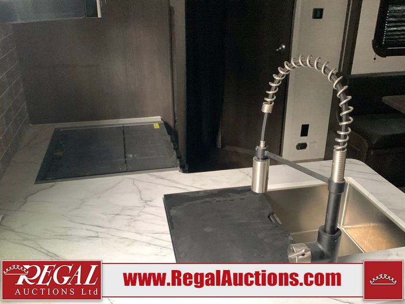 This RV is a 2021 Crossroads RV Cruiser series 22BBH model bumper pull travel trailer. It has a single entry door, roof air and a single sign out accommodating the living area/dinette. The interior is clean. There are light scuffs on the wood trim. The exterior walls are made of hard wall fiberglass. The front panel has chips and adhesive residue. The side walls have scuffs. This unit is equipped with a single propane tank and two batteries. One of the propane tanks are missing. Alloy rims are mounted, the tires appear to be in good enough condition for use. The slide is operational. This unit is equipped with a microwave, refrigerator, three burner stove top, oven, flatscreen television and a stereo system. The layout consist of a master bedroom at the front and a bunkhouse/washroom at the rear. This unit also comes equipped with an exterior speaker system and exterior kitchen, including a mini refrigerator and a two burner stove top.
