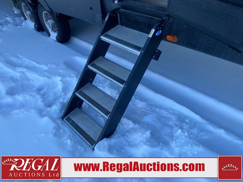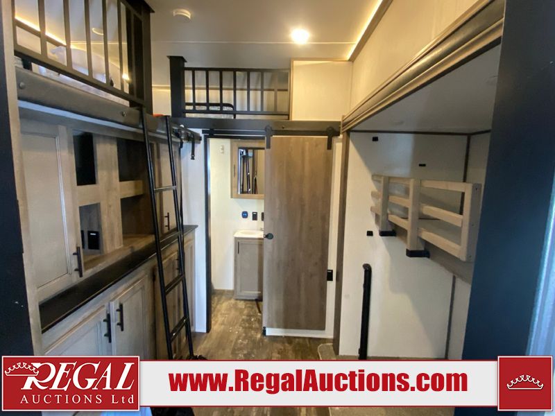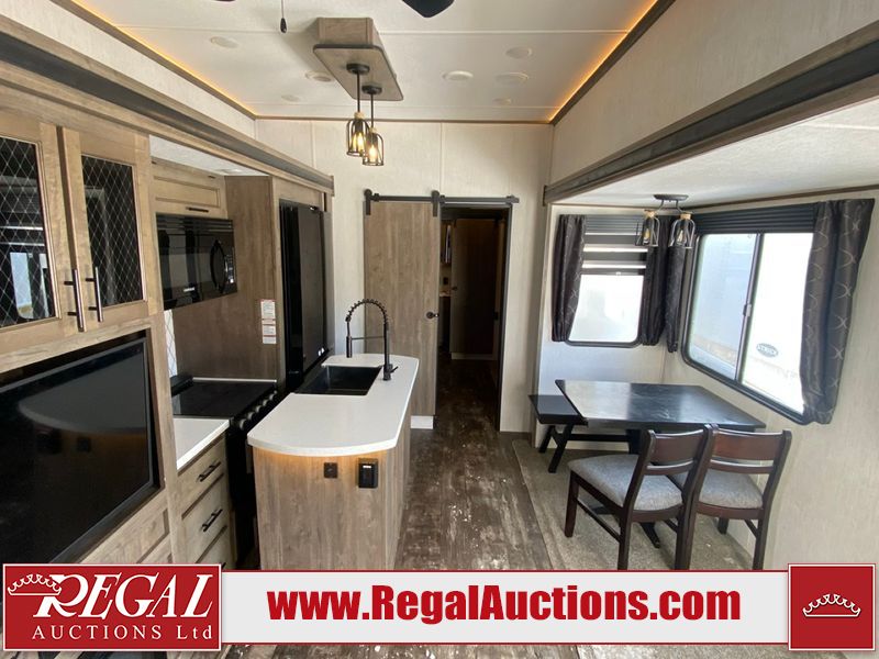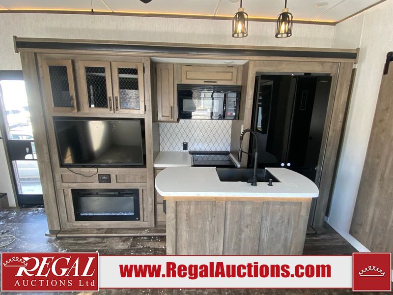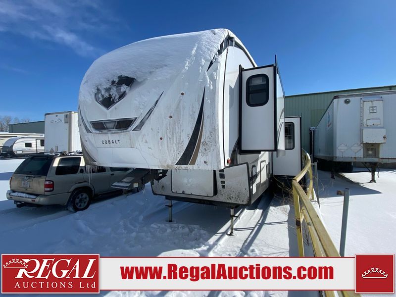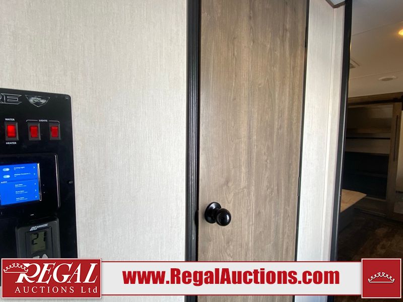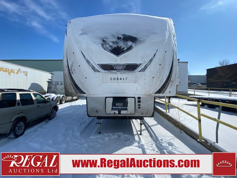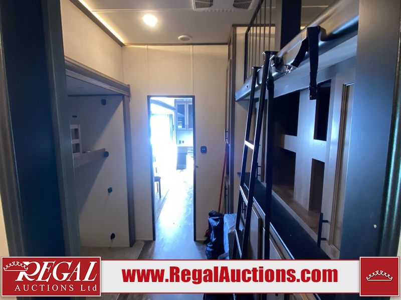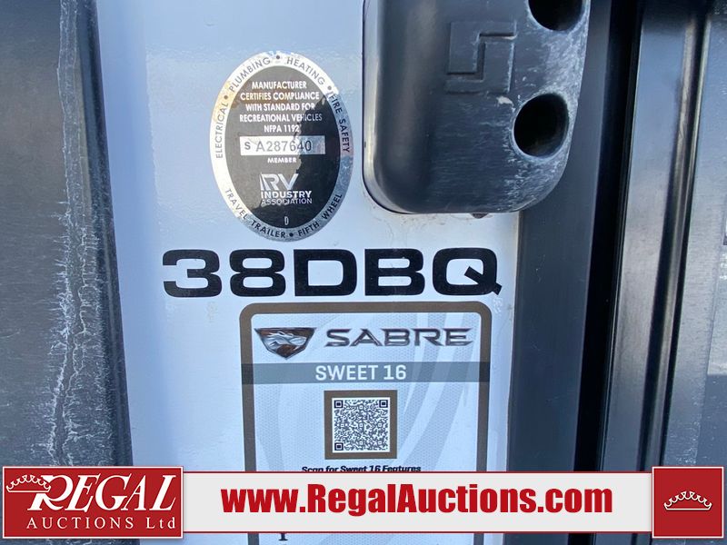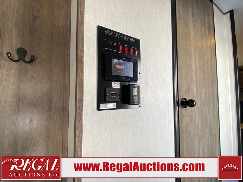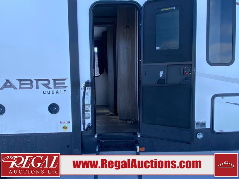 This unit is a 2022 Forest River Sabre Cobalt Series 38DBQ model tandem axel fifth wheel trailer. It has two door entry, roof air, and three slide outs accommodating the living area, kitchen, bunkhouse and master bedroom. The interior is clean. The exterior is made out of hard fiberglass. All walls are showing minor chips and scratches. The battery is dead. This unit gets power with external power applied. Tires are mounted on alloy rims and appear to be in good enough condition for use. This unit is equipped with a three burner stove, microwave, refrigerator, television, stereo system, and an exterior prep station. The layout consist of a master bedroom, bathroom at the front, dinette, kitchen at the center and bunk house with washroom at the rear.