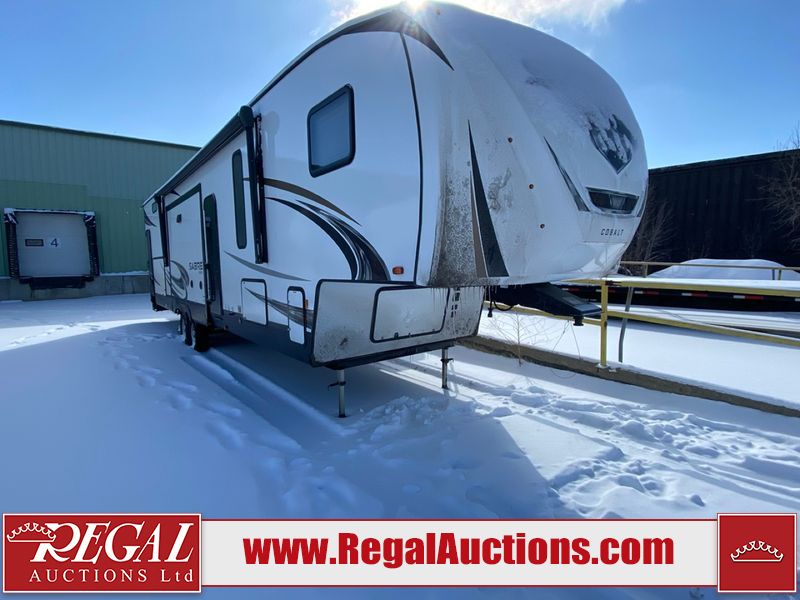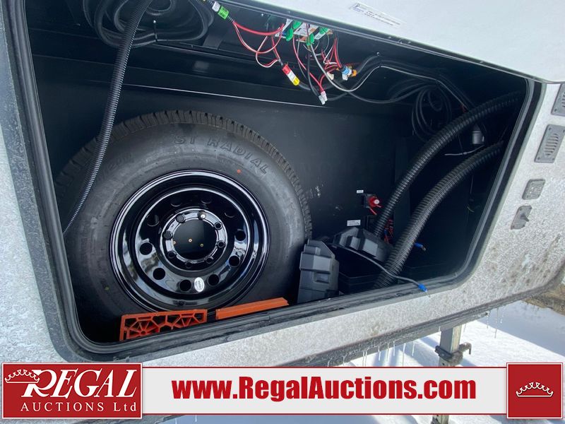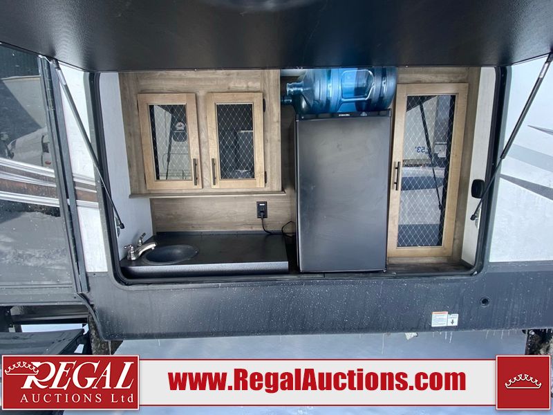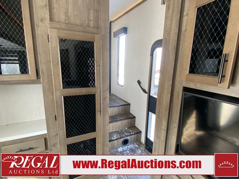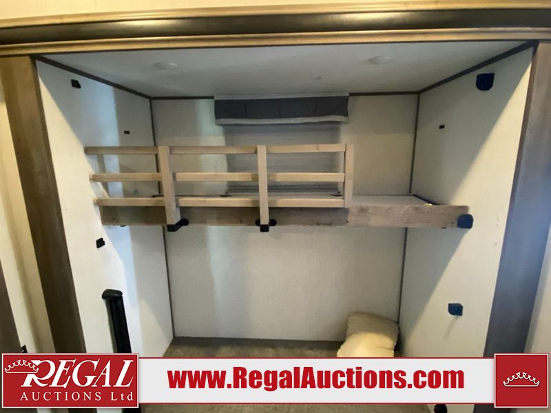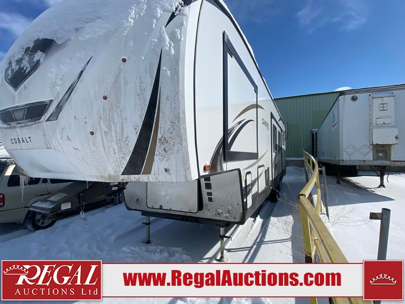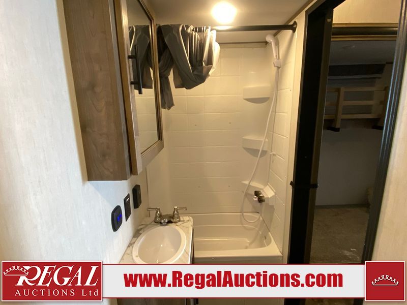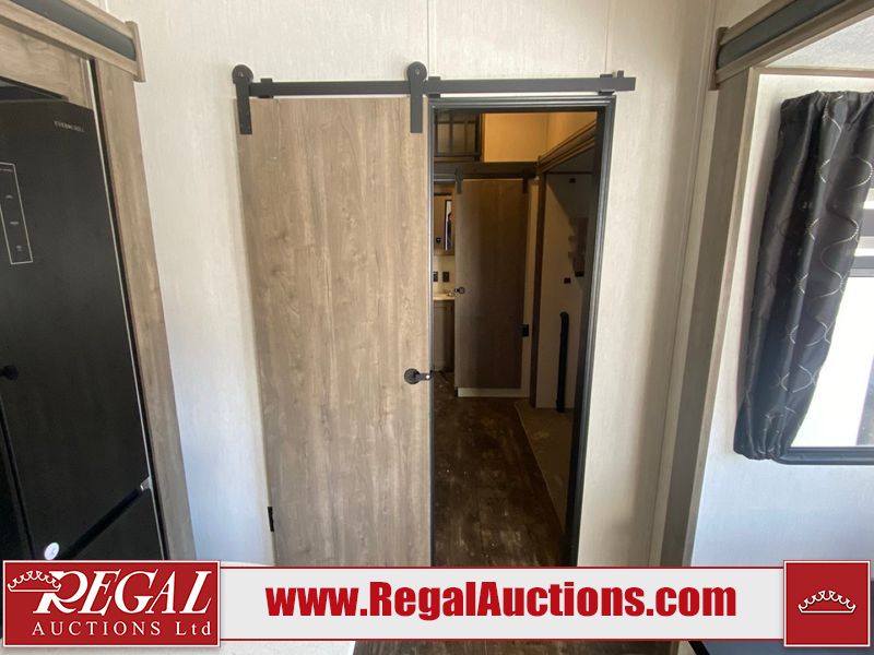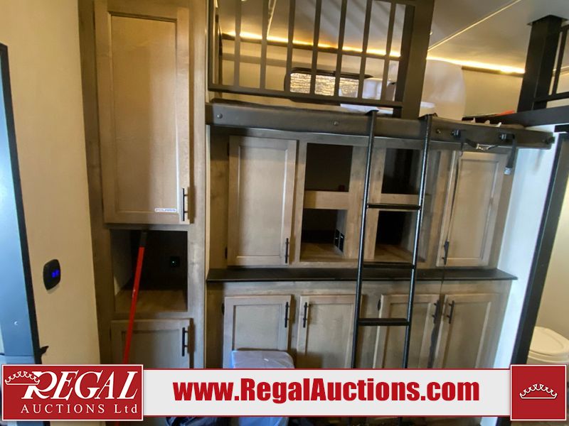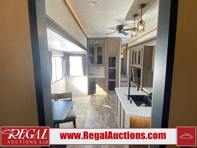 This unit is a 2022 Forest River Sabre Cobalt Series 38DBQ model tandem axel fifth wheel trailer. It has two door entry, roof air, and three slide outs accommodating the living area, kitchen, bunkhouse and master bedroom. The interior is clean. The exterior is made out of hard fiberglass. All walls are showing minor chips and scratches. The battery is dead. This unit gets power with external power applied. Tires are mounted on alloy rims and appear to be in good enough condition for use. This unit is equipped with a three burner stove, microwave, refrigerator, television, stereo system, and an exterior prep station. The layout consist of a master bedroom, bathroom at the front, dinette, kitchen at the center and bunk house with washroom at the rear.