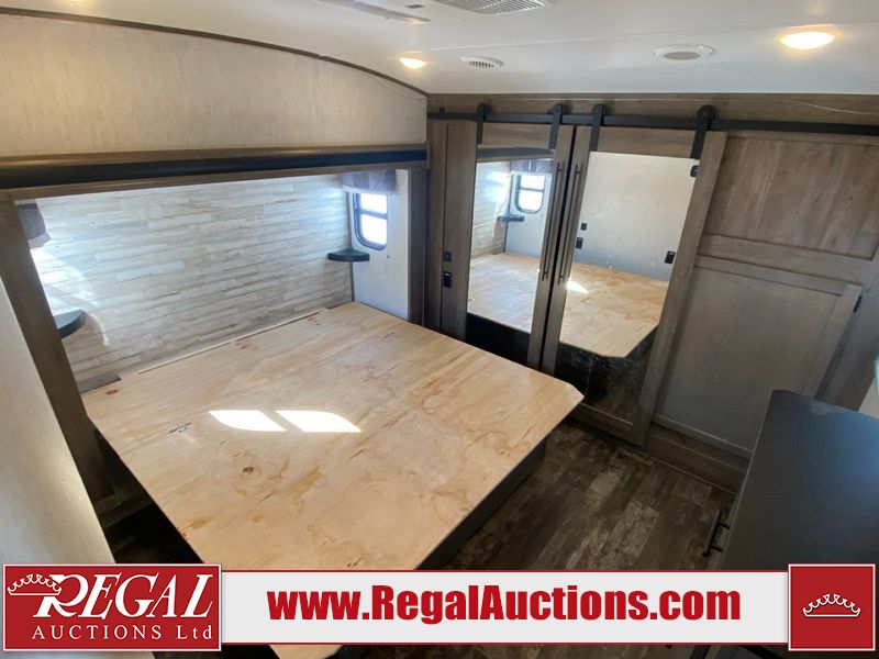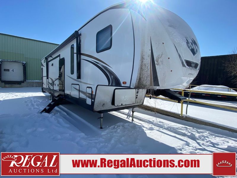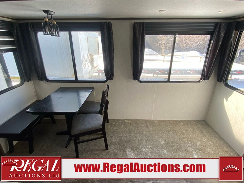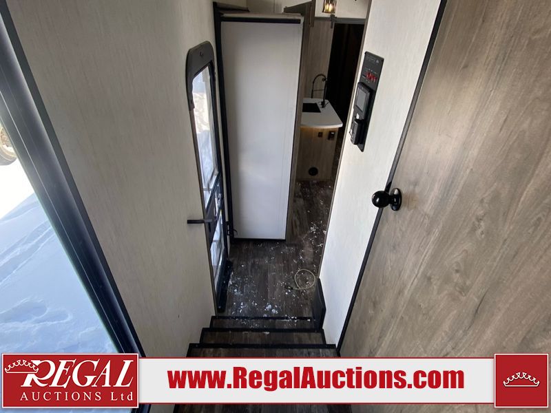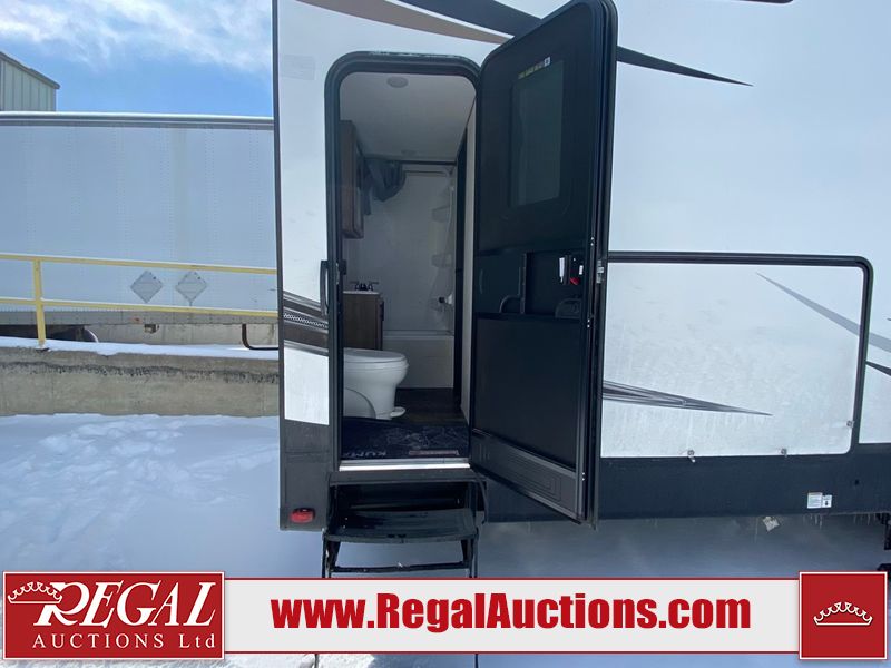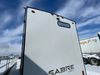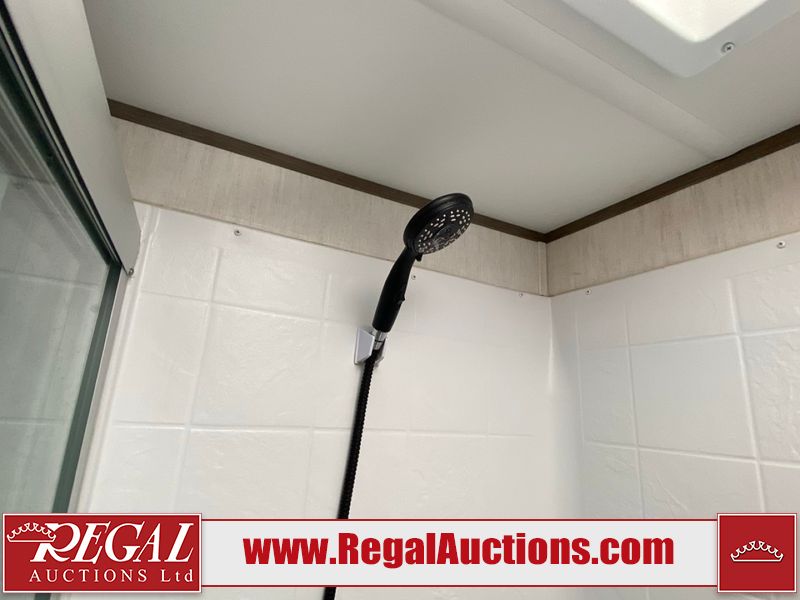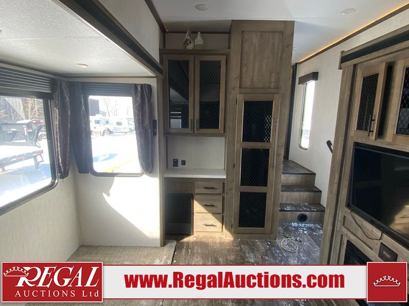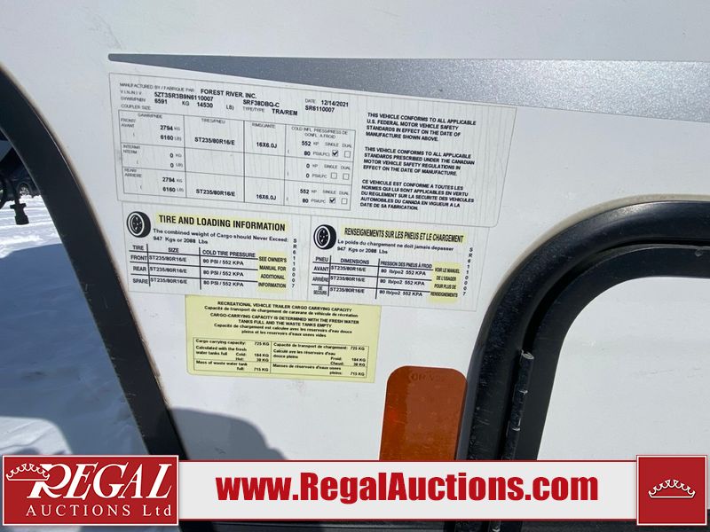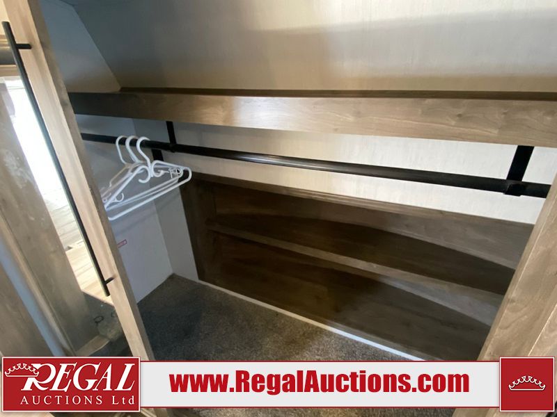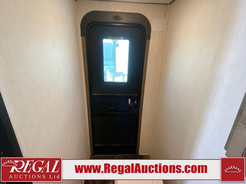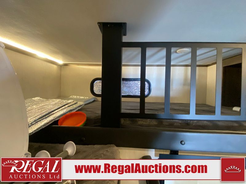 This unit is a 2022 Forest River Sabre Cobalt Series 38DBQ model tandem axel fifth wheel trailer. It has two door entry, roof air, and three slide outs accommodating the living area, kitchen, bunkhouse and master bedroom. The interior is clean. The exterior is made out of hard fiberglass. All walls are showing minor chips and scratches. The battery is dead. This unit gets power with external power applied. Tires are mounted on alloy rims and appear to be in good enough condition for use. This unit is equipped with a three burner stove, microwave, refrigerator, television, stereo system, and an exterior prep station. The layout consist of a master bedroom, bathroom at the front, dinette, kitchen at the center and bunk house with washroom at the rear.