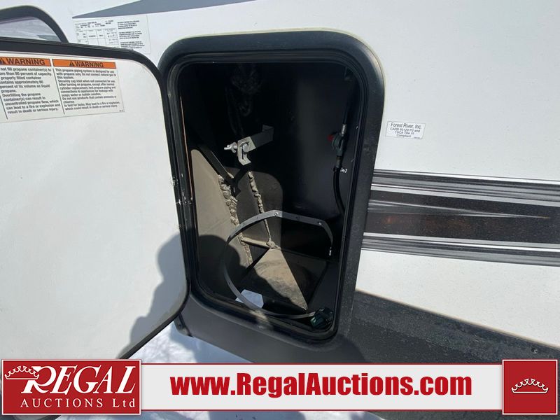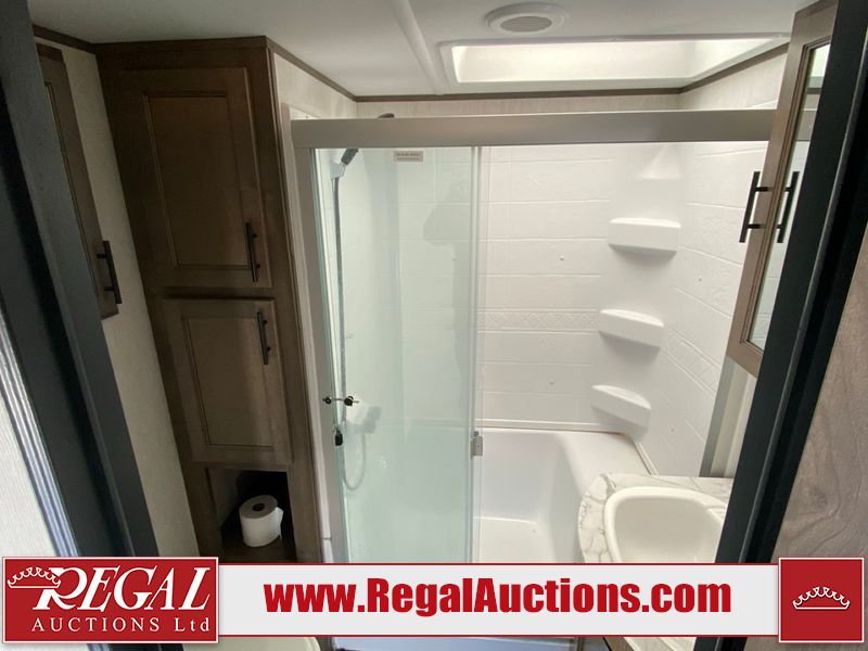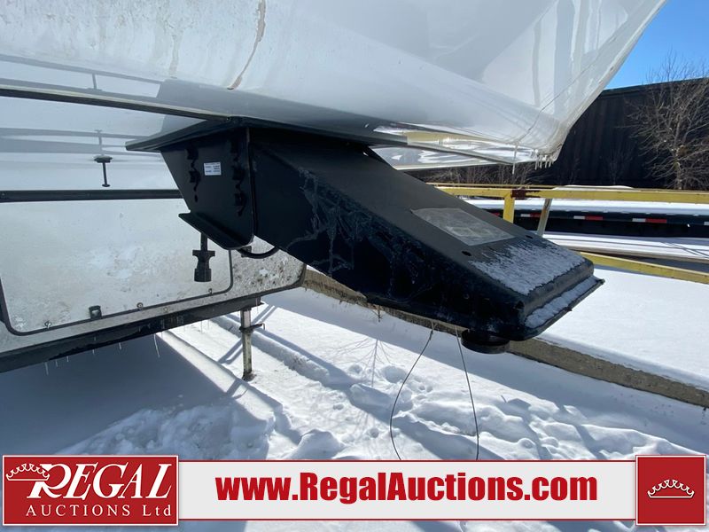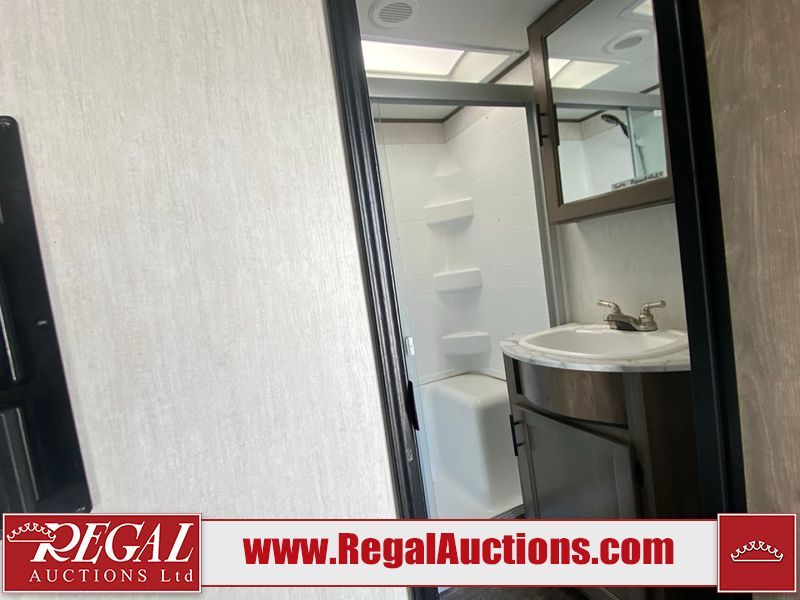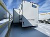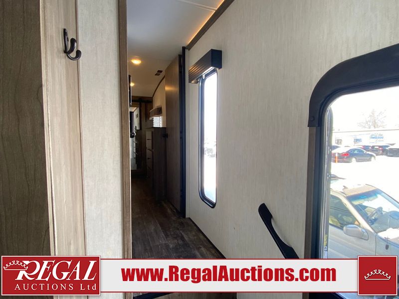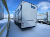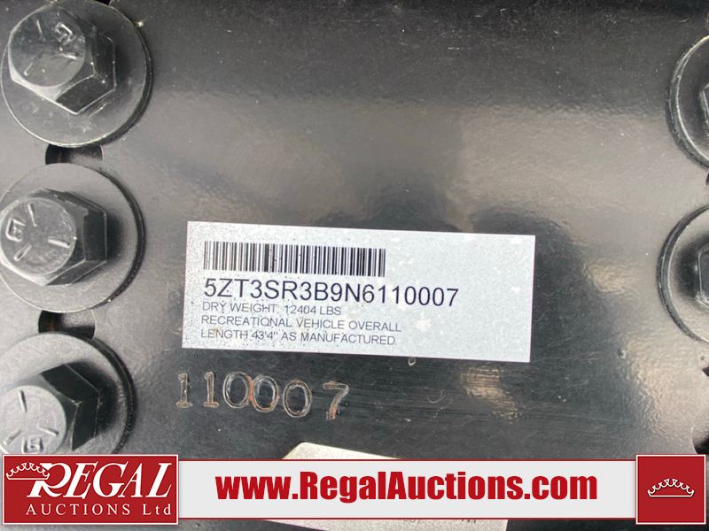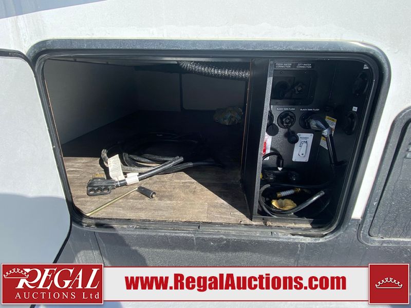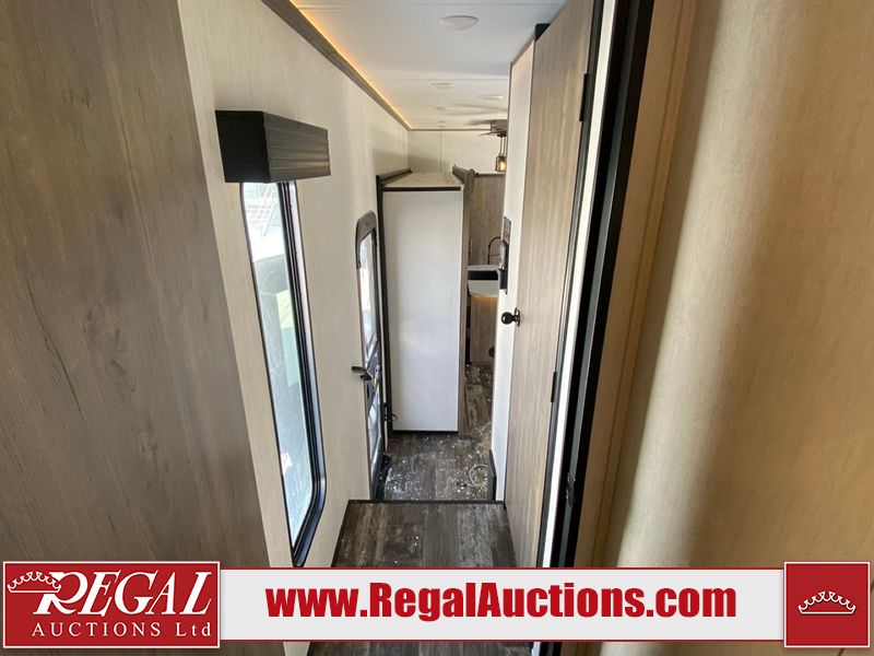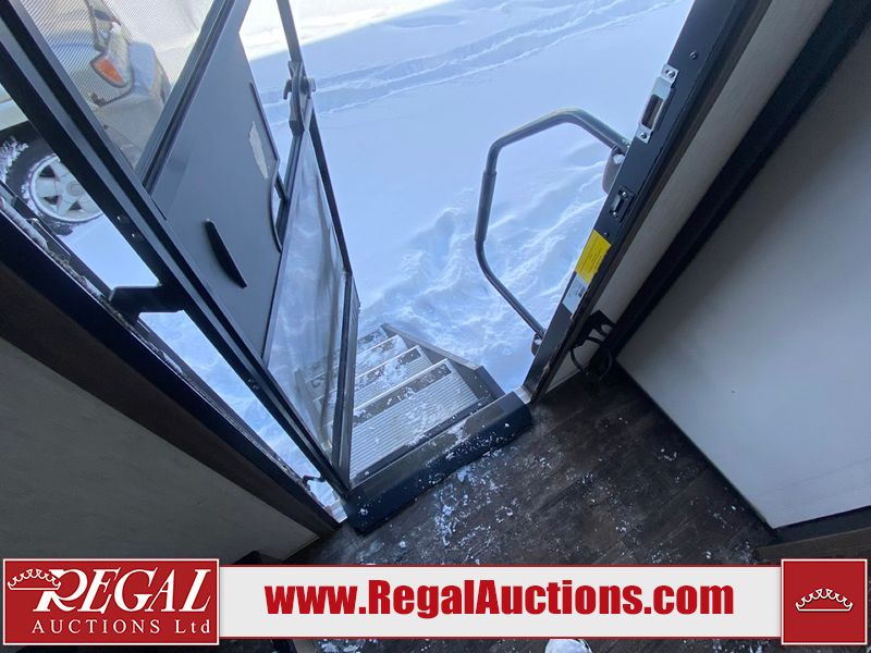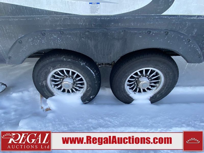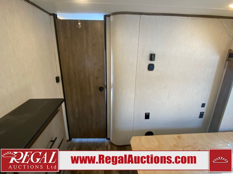 This unit is a 2022 Forest River Sabre Cobalt Series 38DBQ model tandem axel fifth wheel trailer. It has two door entry, roof air, and three slide outs accommodating the living area, kitchen, bunkhouse and master bedroom. The interior is clean. The exterior is made out of hard fiberglass. All walls are showing minor chips and scratches. The battery is dead. This unit gets power with external power applied. Tires are mounted on alloy rims and appear to be in good enough condition for use. This unit is equipped with a three burner stove, microwave, refrigerator, television, stereo system, and an exterior prep station. The layout consist of a master bedroom, bathroom at the front, dinette, kitchen at the center and bunk house with washroom at the rear.